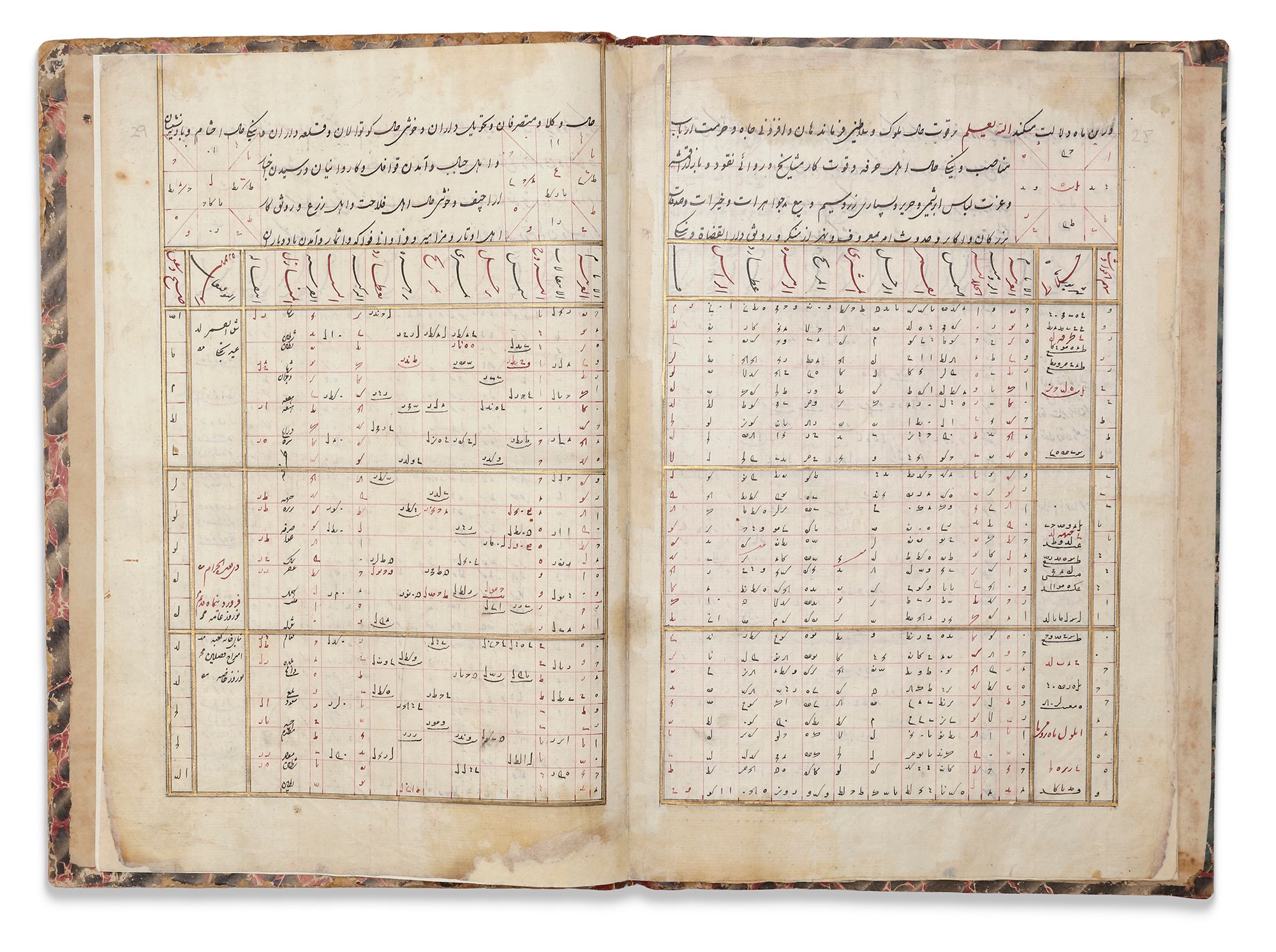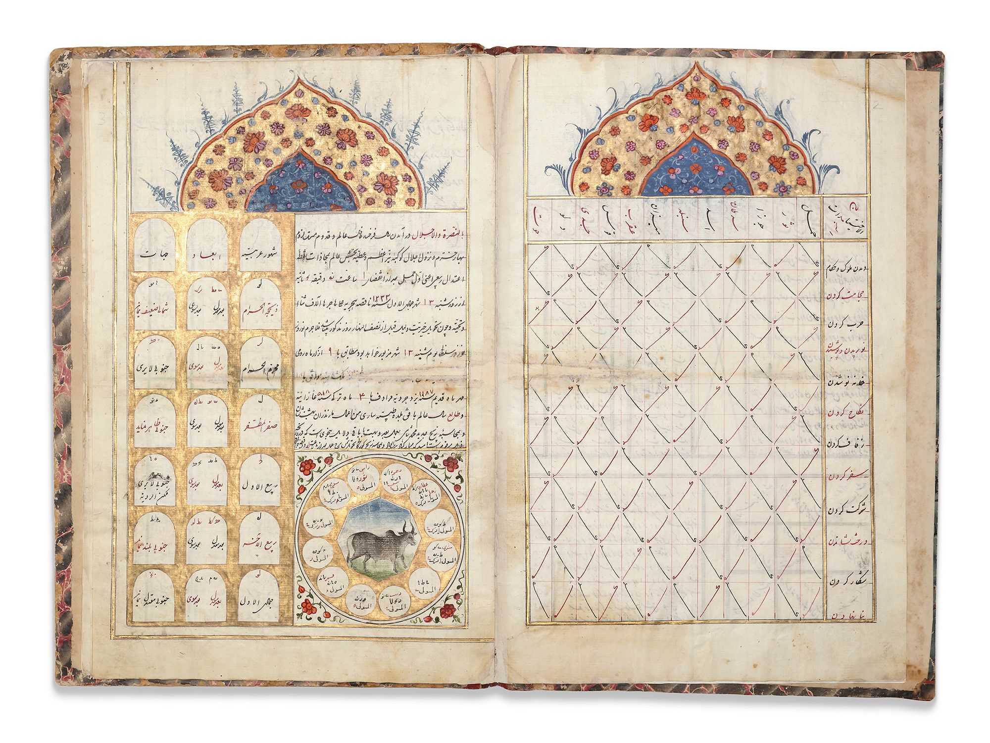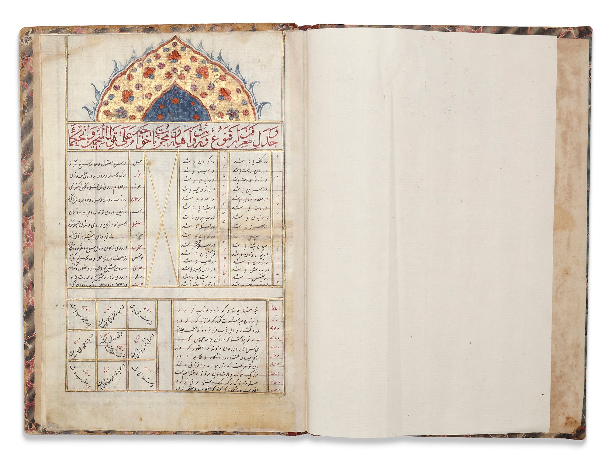 Persian manuscript on paper, 15ff. each page with approximately 20ll. written in black and red nastali'q script, titles and catchwords in red in ink, pages illuminated with gilt and polychrome decrated headpieces, tables of the months for calendrical calculations and celestial predictions.