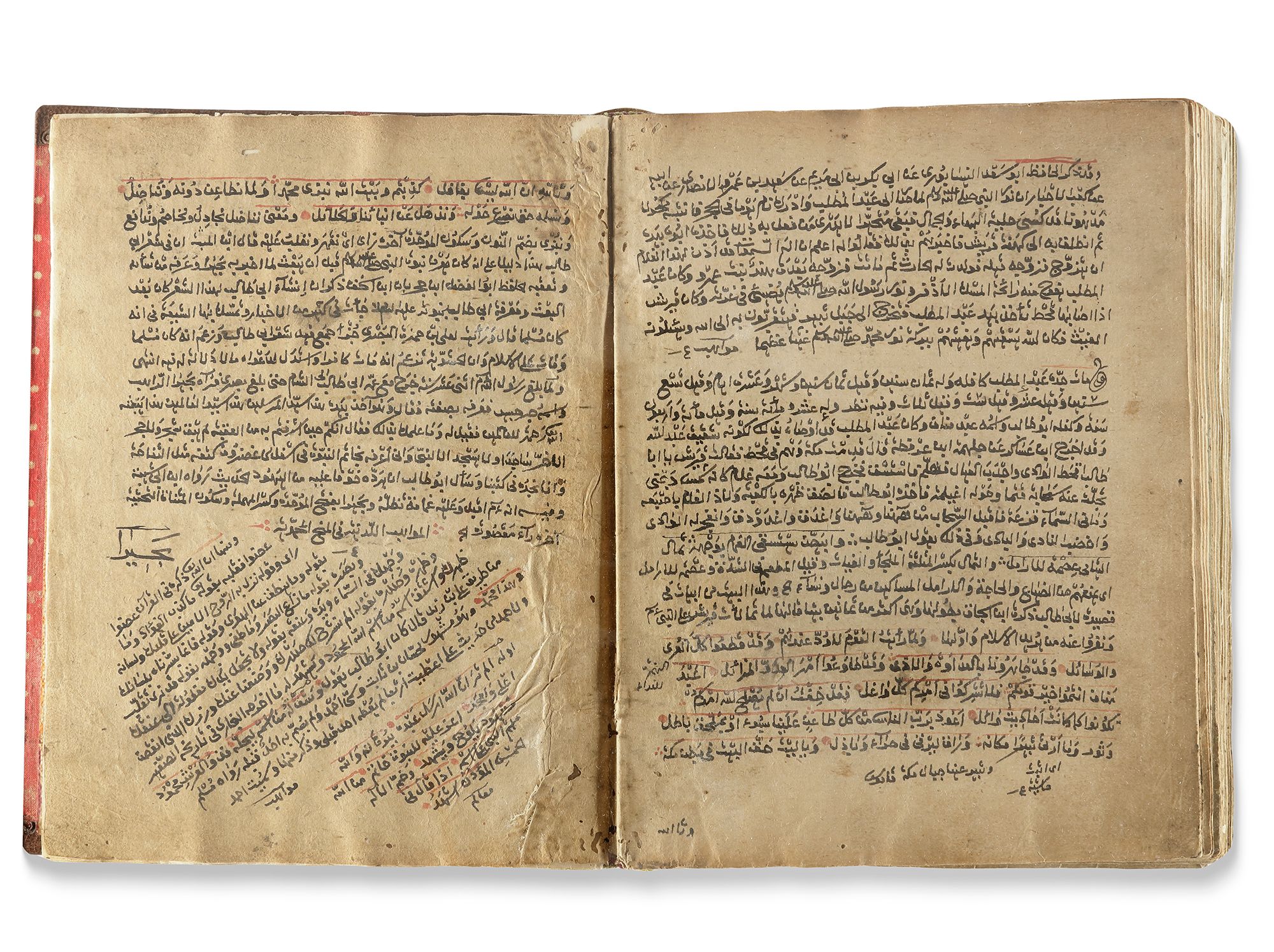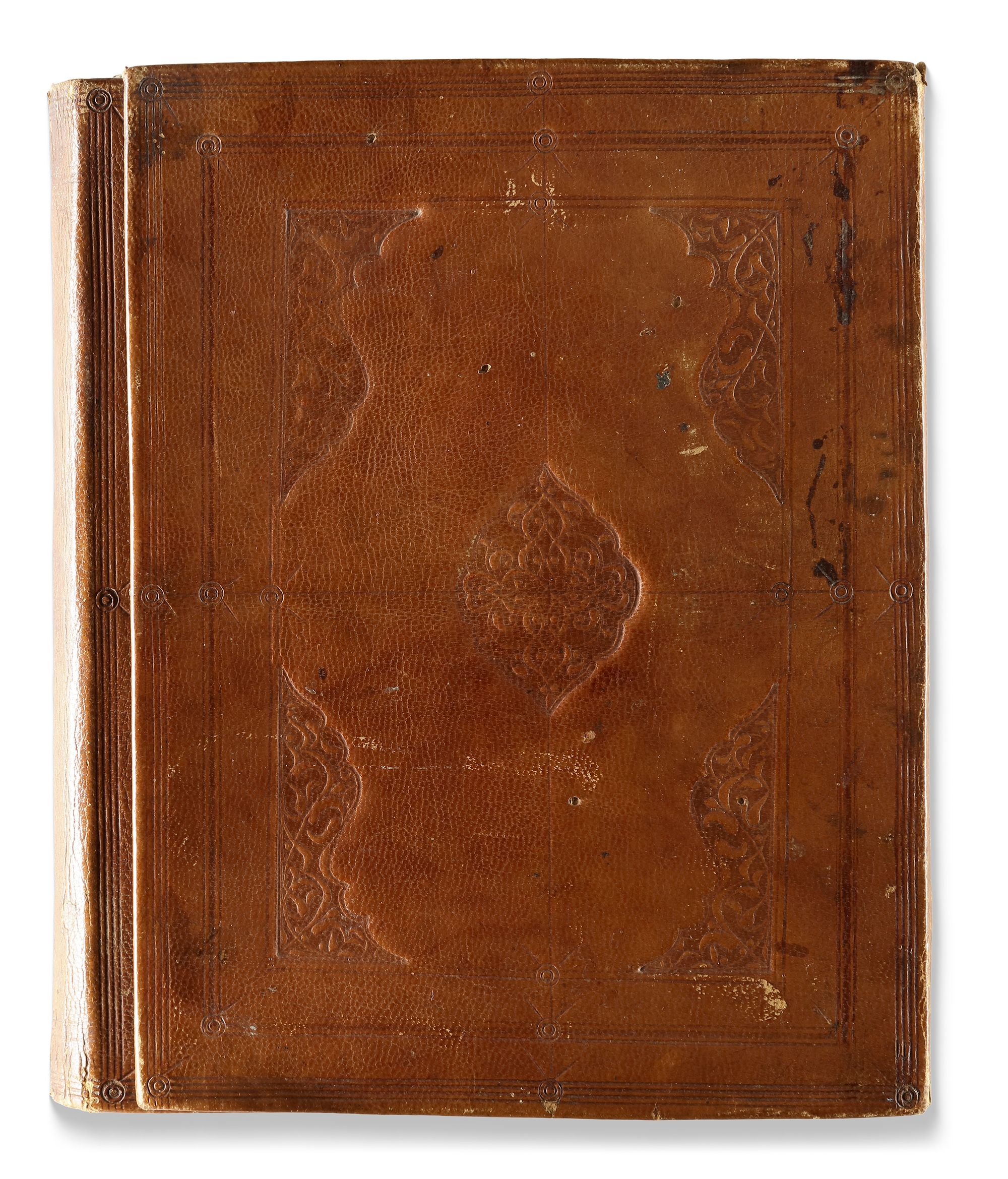 مجلد بغلاف من الجلد المغربي البني، مزود بلسان. الأبعاد: ١٧ × ٢٢ سم.