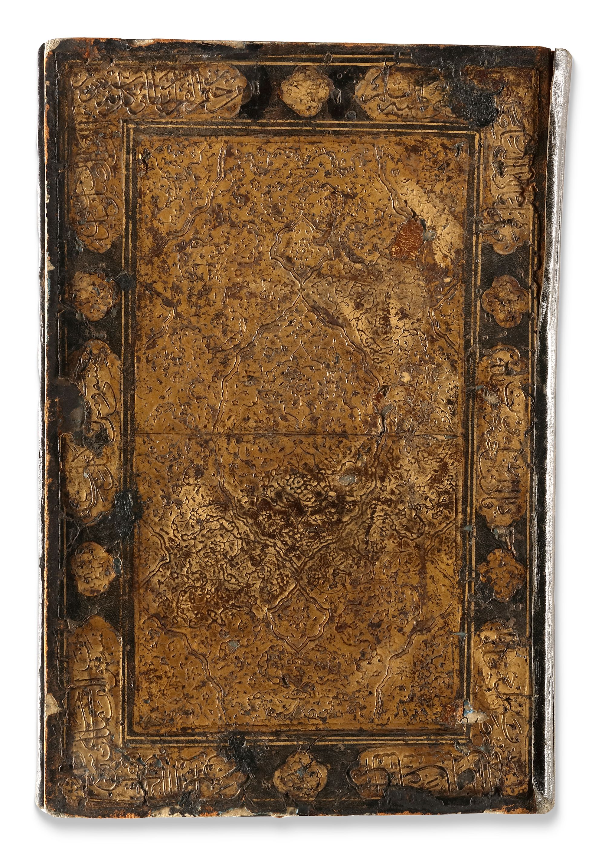 In brown morocco binding with flap stamped with gilt floral motifs and Quran inscriptions, with restored and stabilized pages.