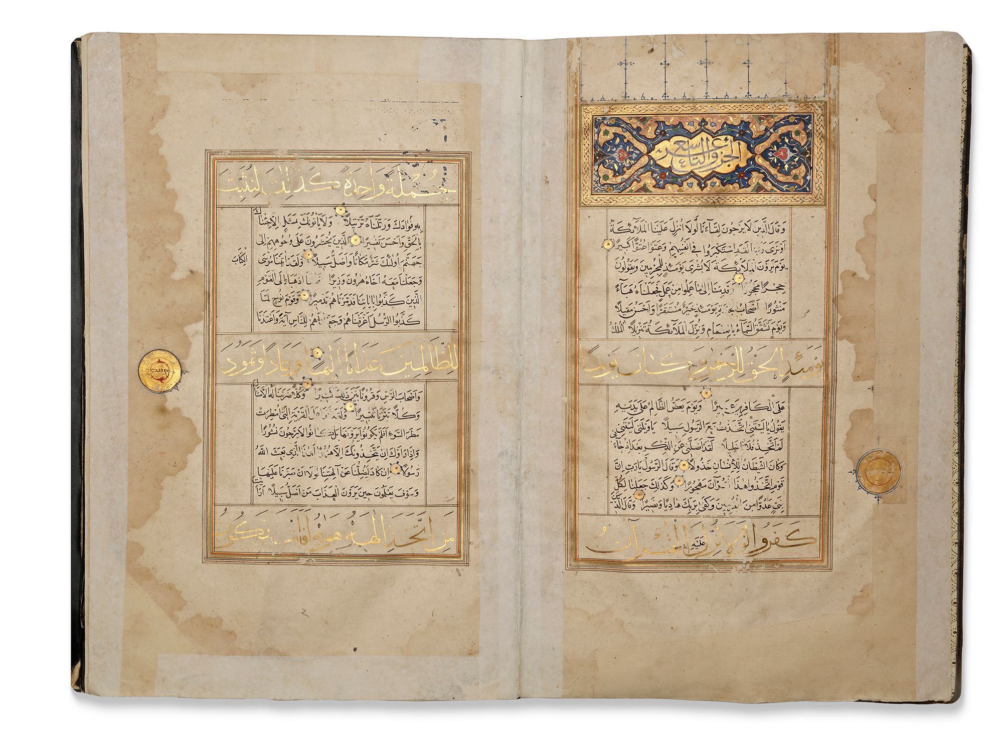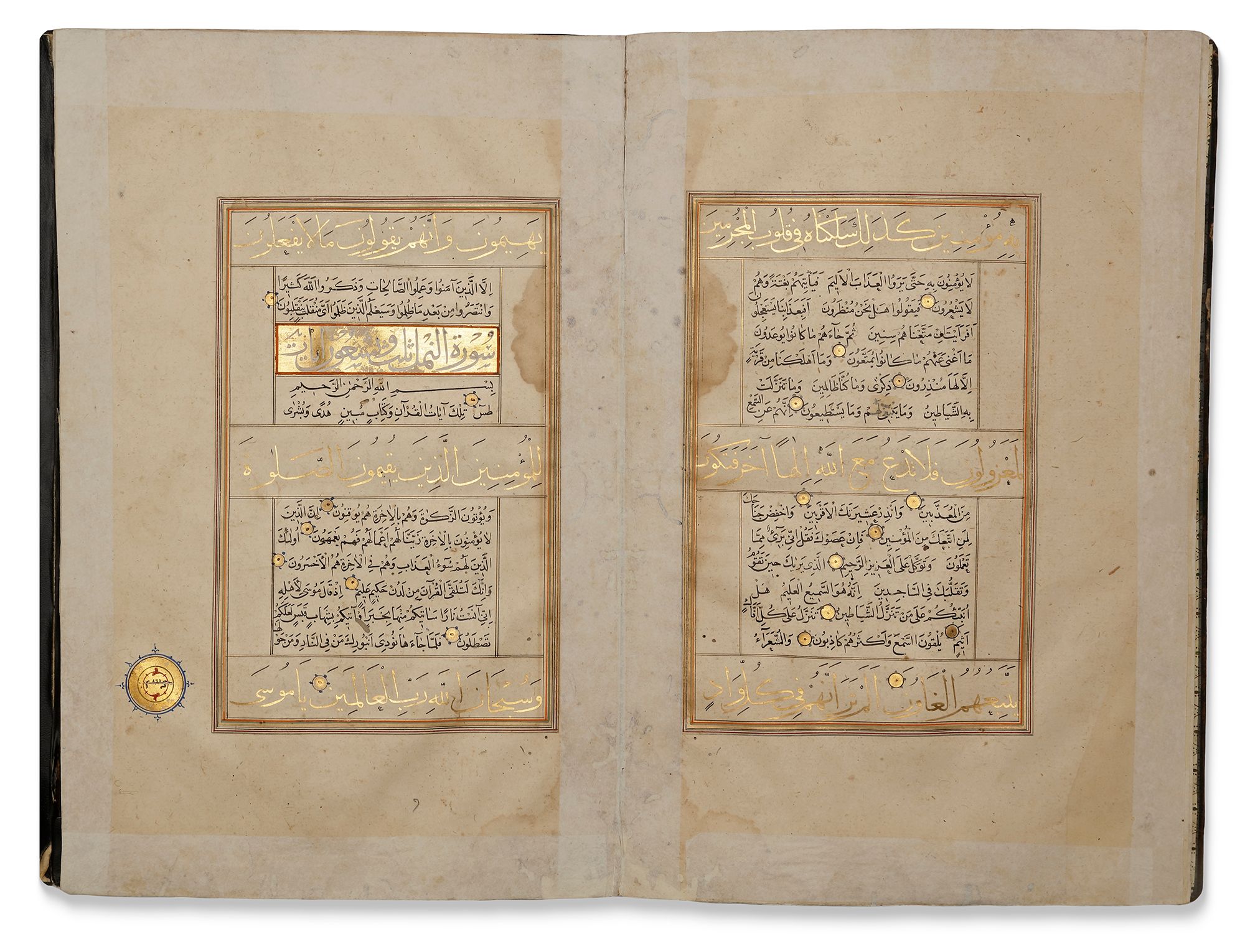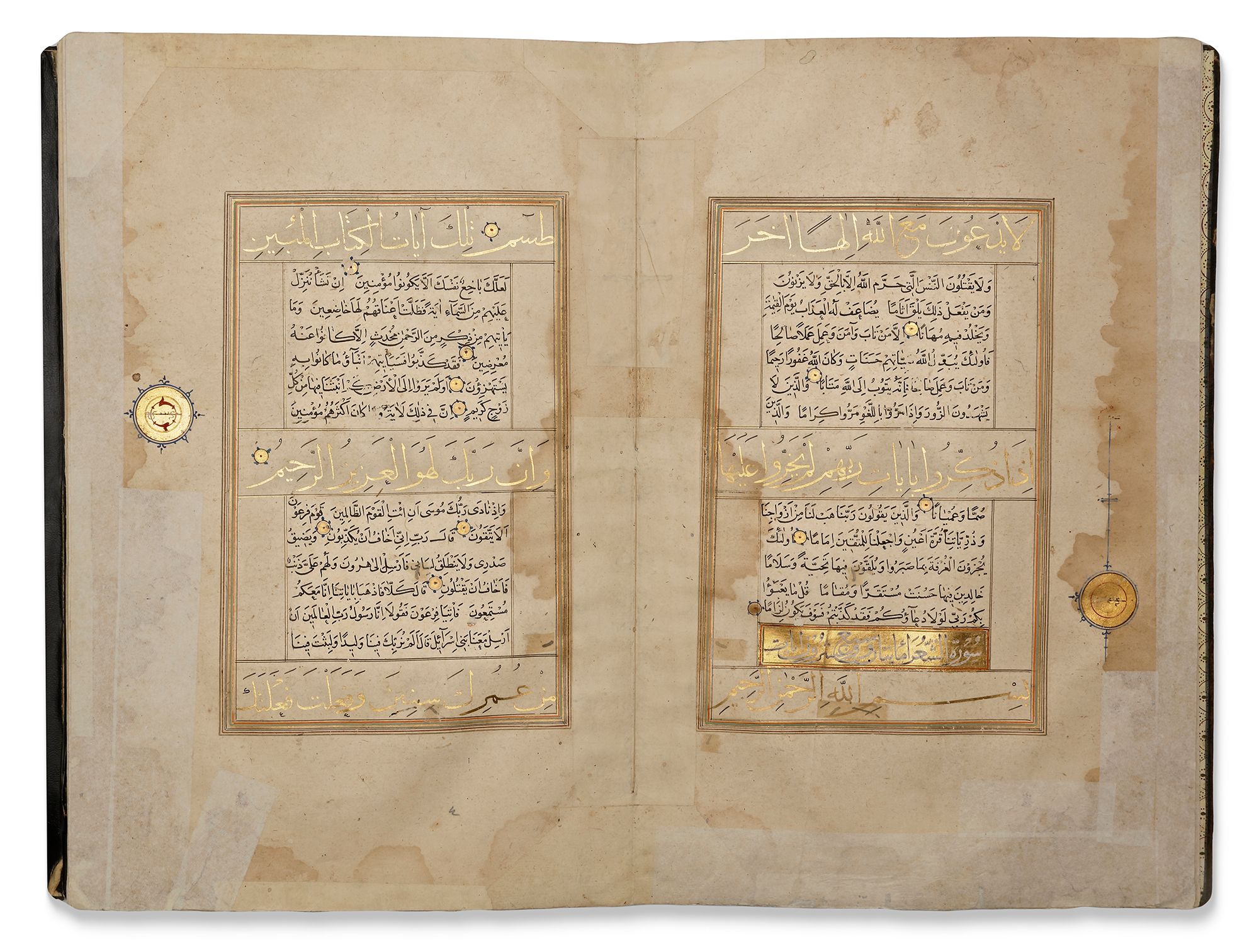 Arabic manuscript on cream paper, 11 leaves with 2 fly-leaves, each page with 15 lines. The first, central and the last line in very elegant gilt Muhaqqaq script, the other 12ll. arranged in two blocks of 6 lines, each of very strong naskh script within gold border outlined in black, gold roundel verse markers outlined in black and pointed in blue dots, all ruled in gold and polychrome borders. Surah headings in large white thuluth on a gilt ground.