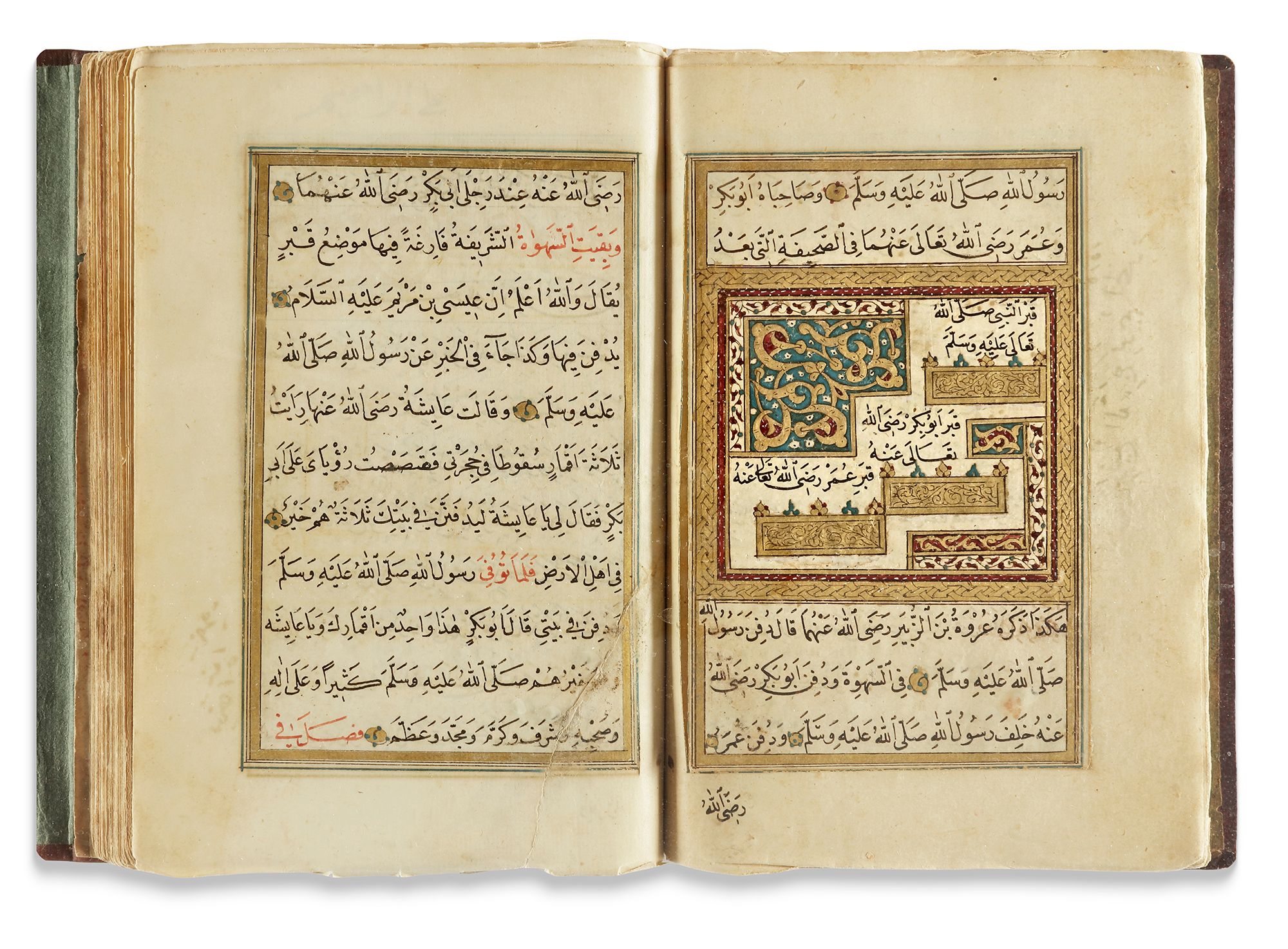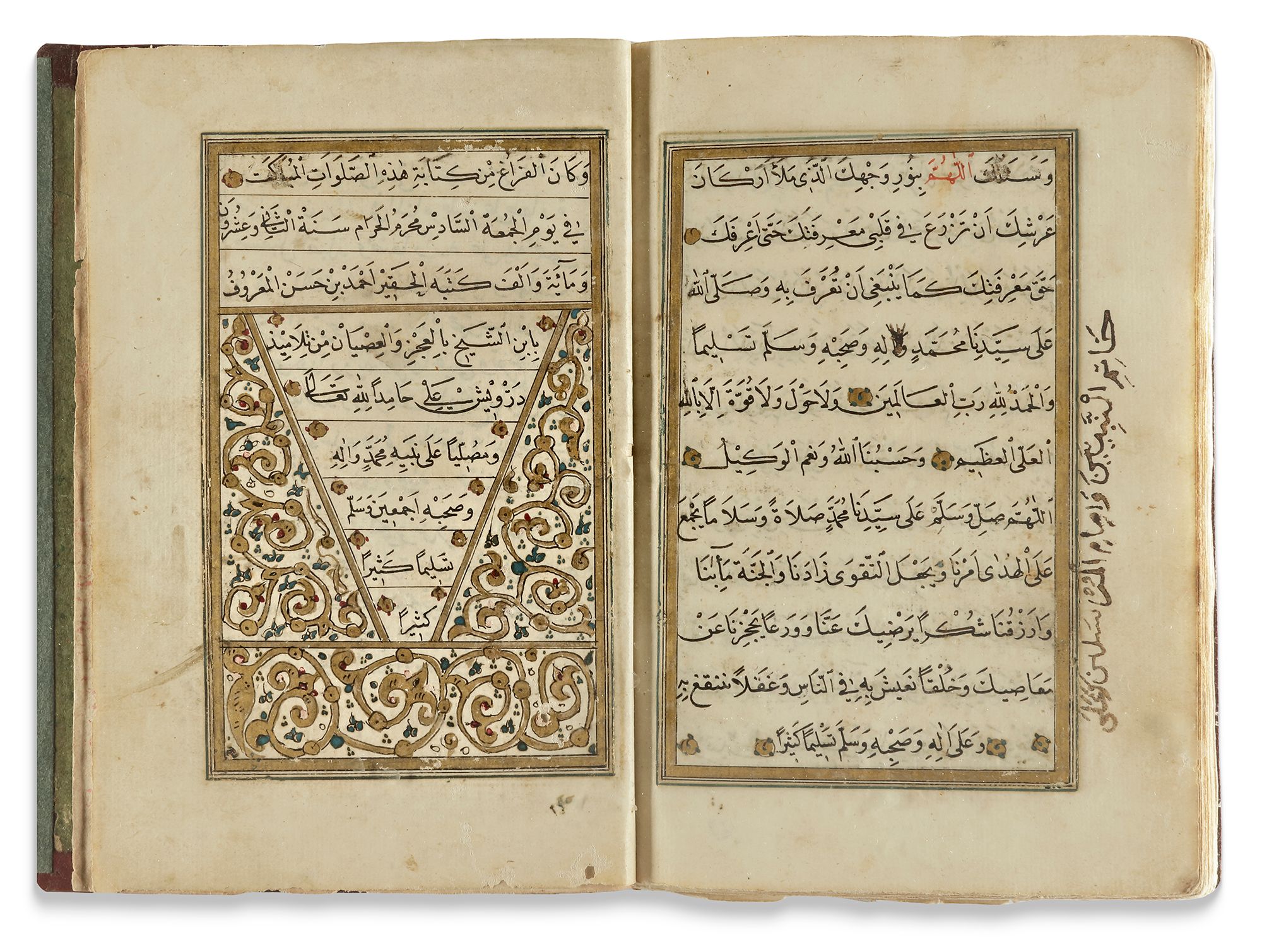Further a detailed illustration of al-Rawda al-Sharifa in Medina, different attributed names to the Prophet, occasional marginal notess, colophon signed 'written by Ahmed Bin Hasan known as Ibn al-Sheikh, student of Darvish Ali and dated: Friday 6 of Muharram 1122 AH'.