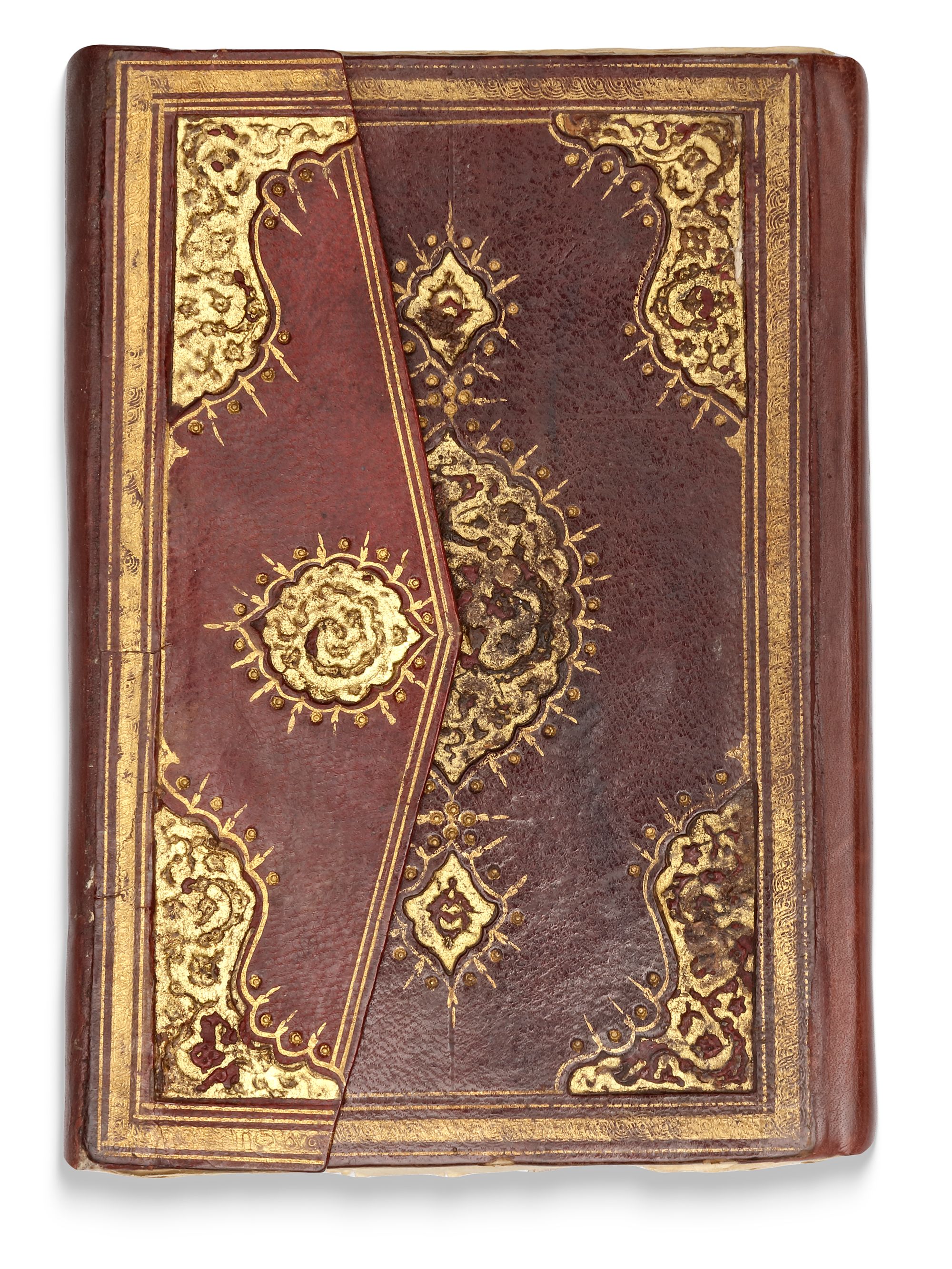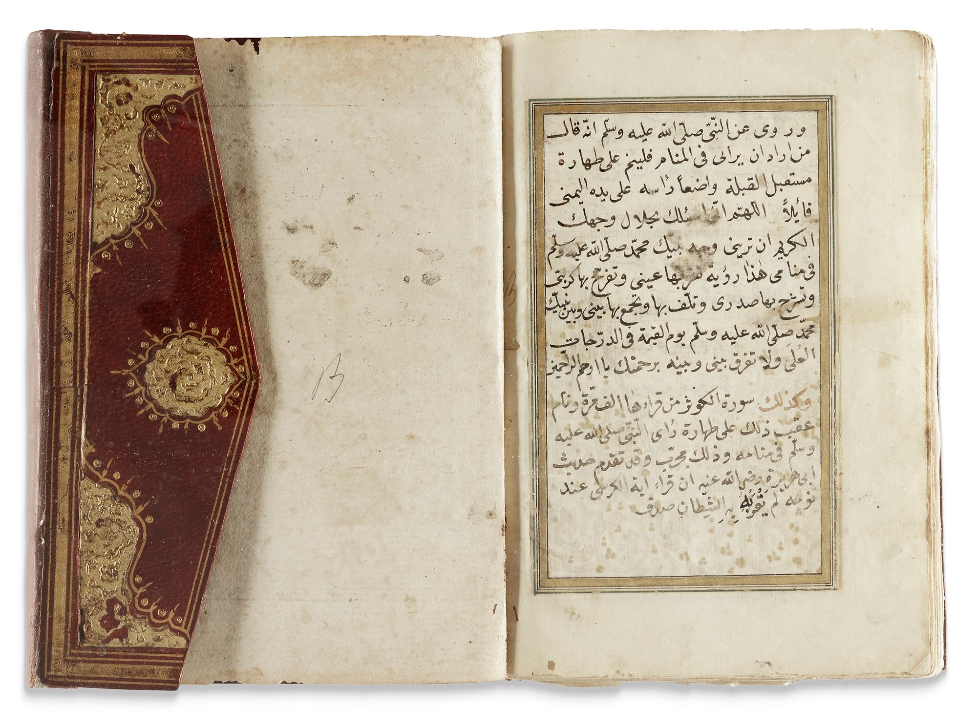 Arabic manuscript on paper depicting prayers in honour of the Prophet Muhammad, 69 leaves with 2 fly-folio, each folio with 11 lines written in elegant black naskh script, with gold verse markers outlined in black and pointed out in polychrome dots, some words picked out in red, text within double gold and blue rules, an opening biofolio with royal gold and polychrome decoration.