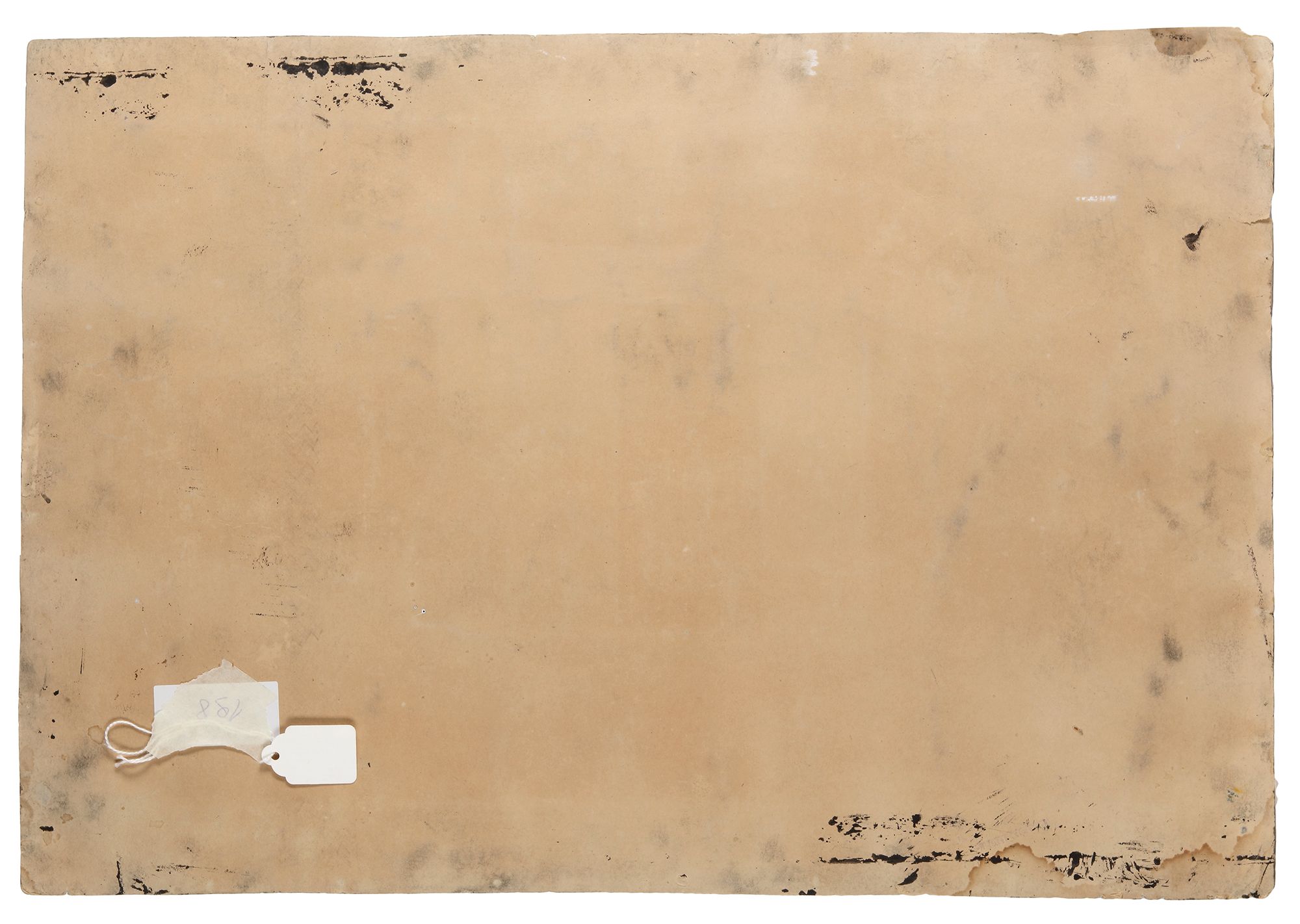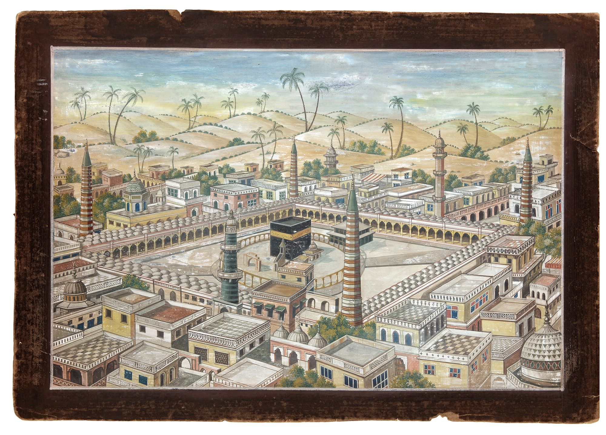 In pastel colors with gold on card, with a detailed depiction of the masjid al-Haram and the Kabaa, showing the Mosque with six minarets and with an arcaded outer wall with small domes, surrounded by the houses of Mecca, inside the mosque kiosks are shown along with an arched entrance to the inner sanctuary.