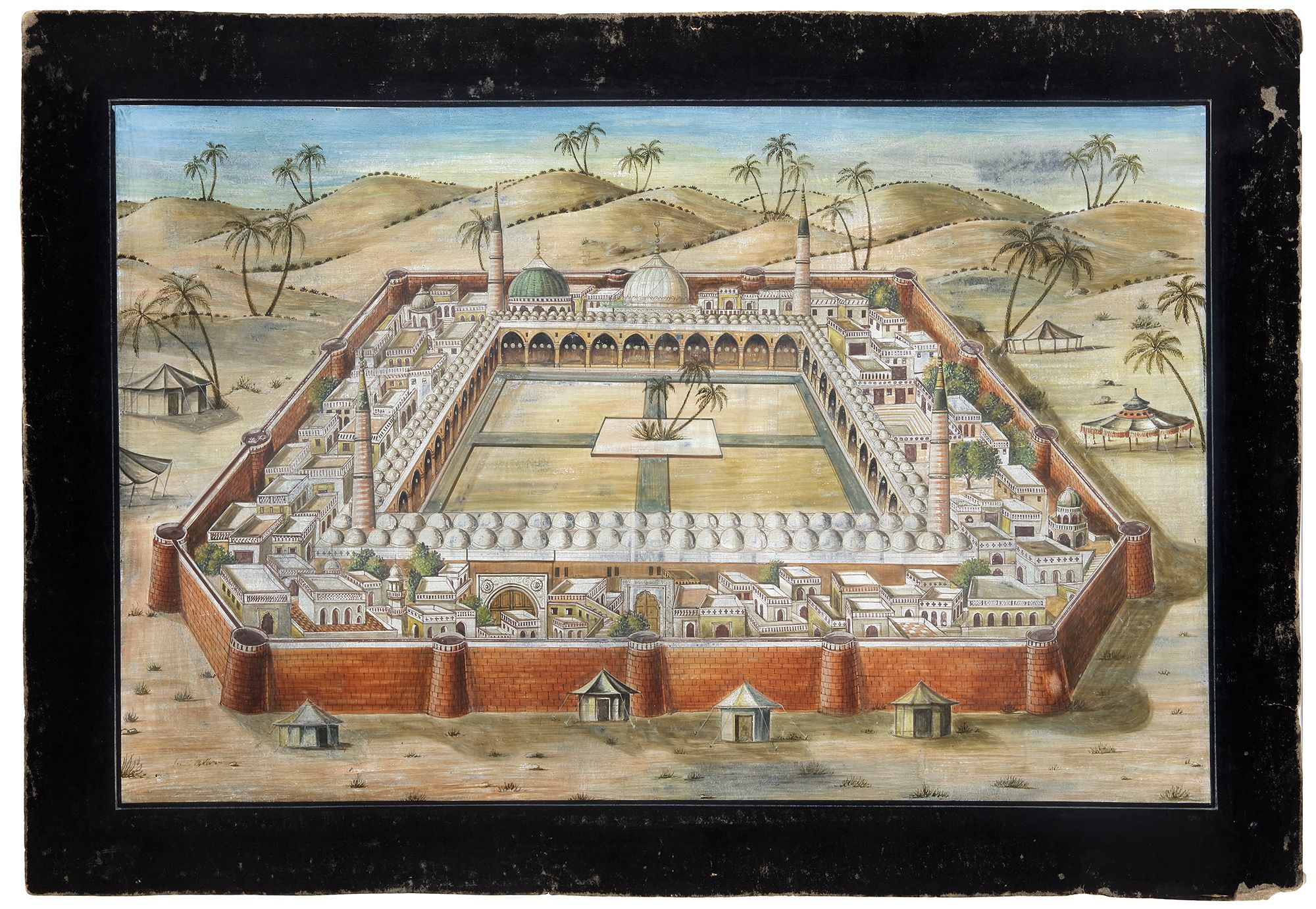 In pastel colors on paper with gold on card, with a detailed depiction of the masjid al-Nabawi, showing the Mosque with four minarets, two large domes with an arcaded outer wall with small white domes, surrounded by the houses of Medina inside the walls.