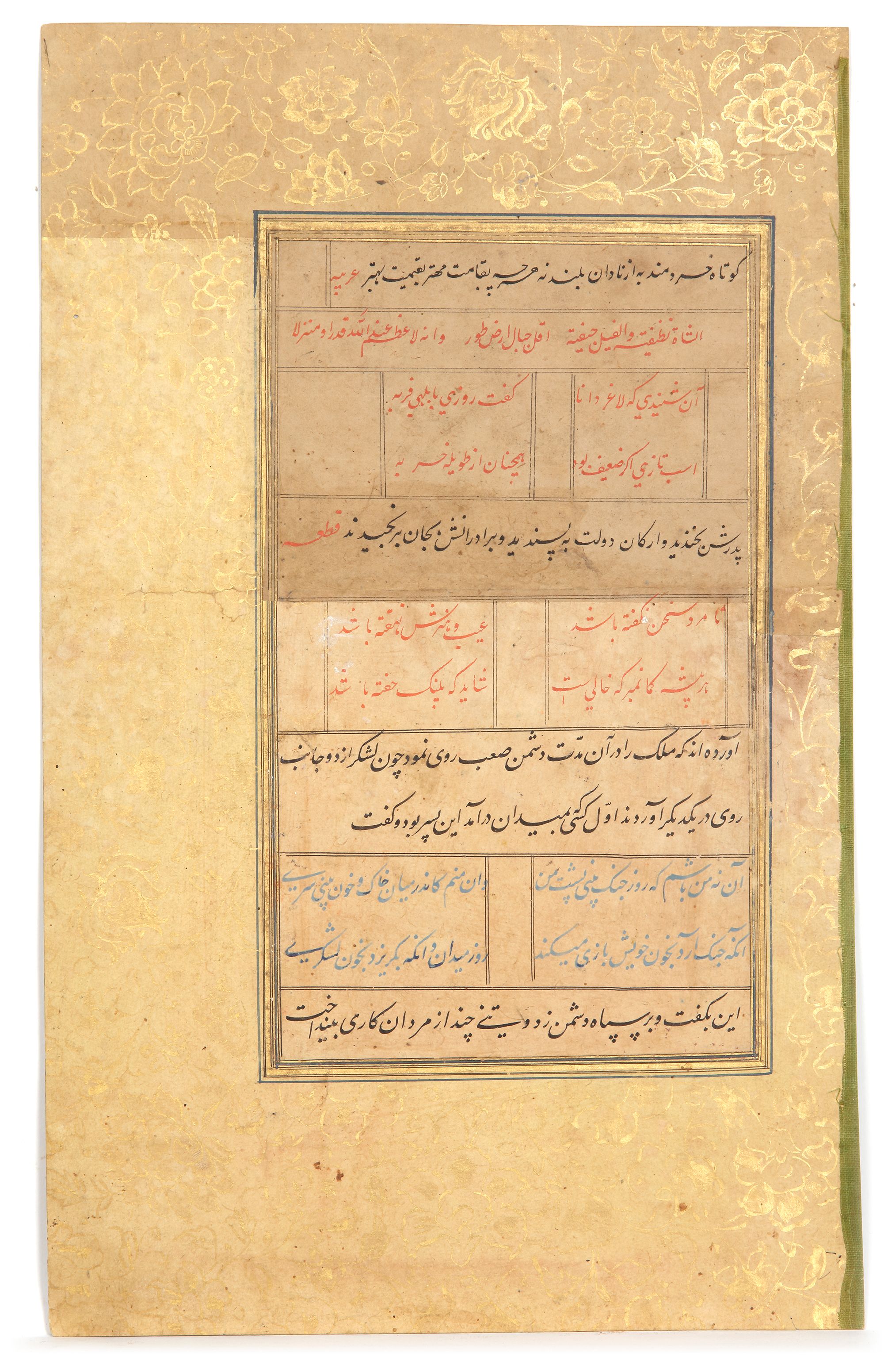 Gouache heightened with gold on paper, with text in Persian Nastaliq script in clouds reserved against a sprinkled gold ground, depicting a story from the first chapter of Kulliyat al-Sa'di (On the Conduct of Kings). Laid down on an album page, the margins are stylized with gilt blossoming lotus scrolls.