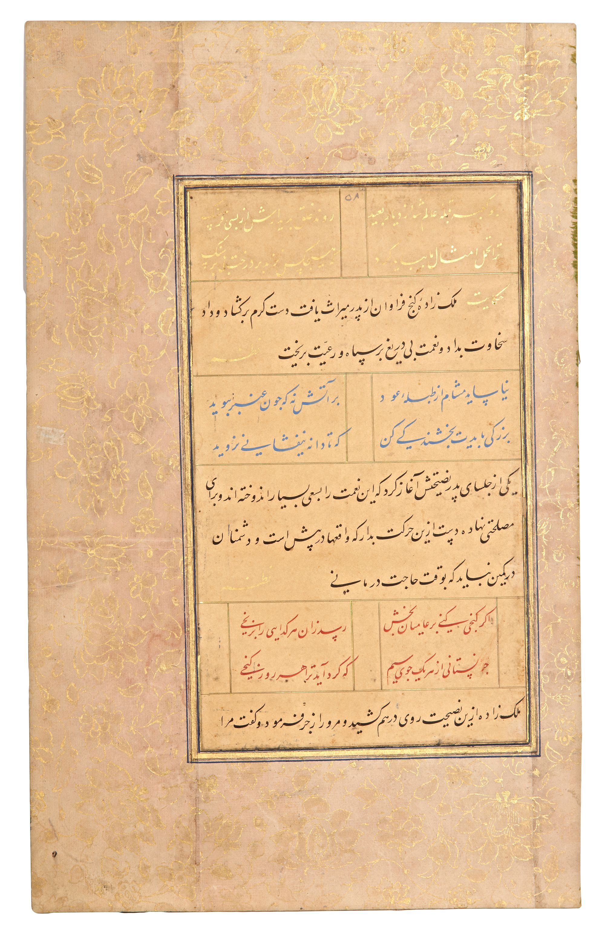 Persian manuscript on paper, written in different colours and Nastali'q script, poems and text depicts stories from the first chapter of Kulliyat al-Sa'di (On the Conduct of Kings). Laid down on an album page, the margins are stylized with gilt blossoming lotus scrolls.
