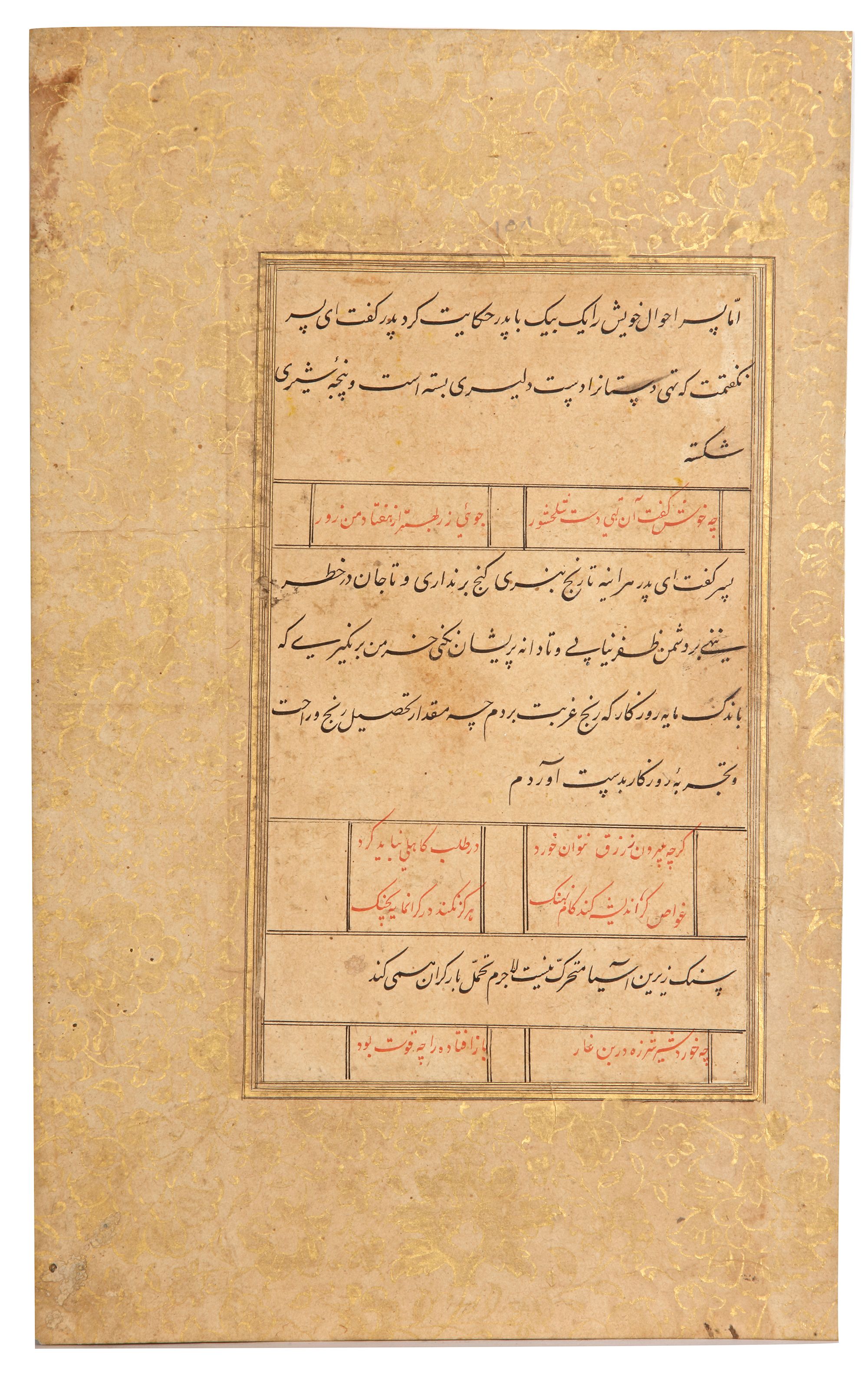 Persian manuscript on paper, written in different colours and Nastali'q script, poems and text depicts stories from the first chapter of Kulliyat al-Sa'di (On the Conduct of Kings). Laid down on an album page, the margins are stylized with gilt blossoming lotus scrolls.