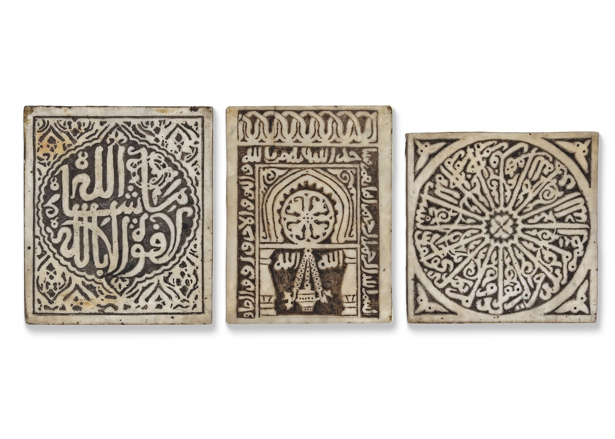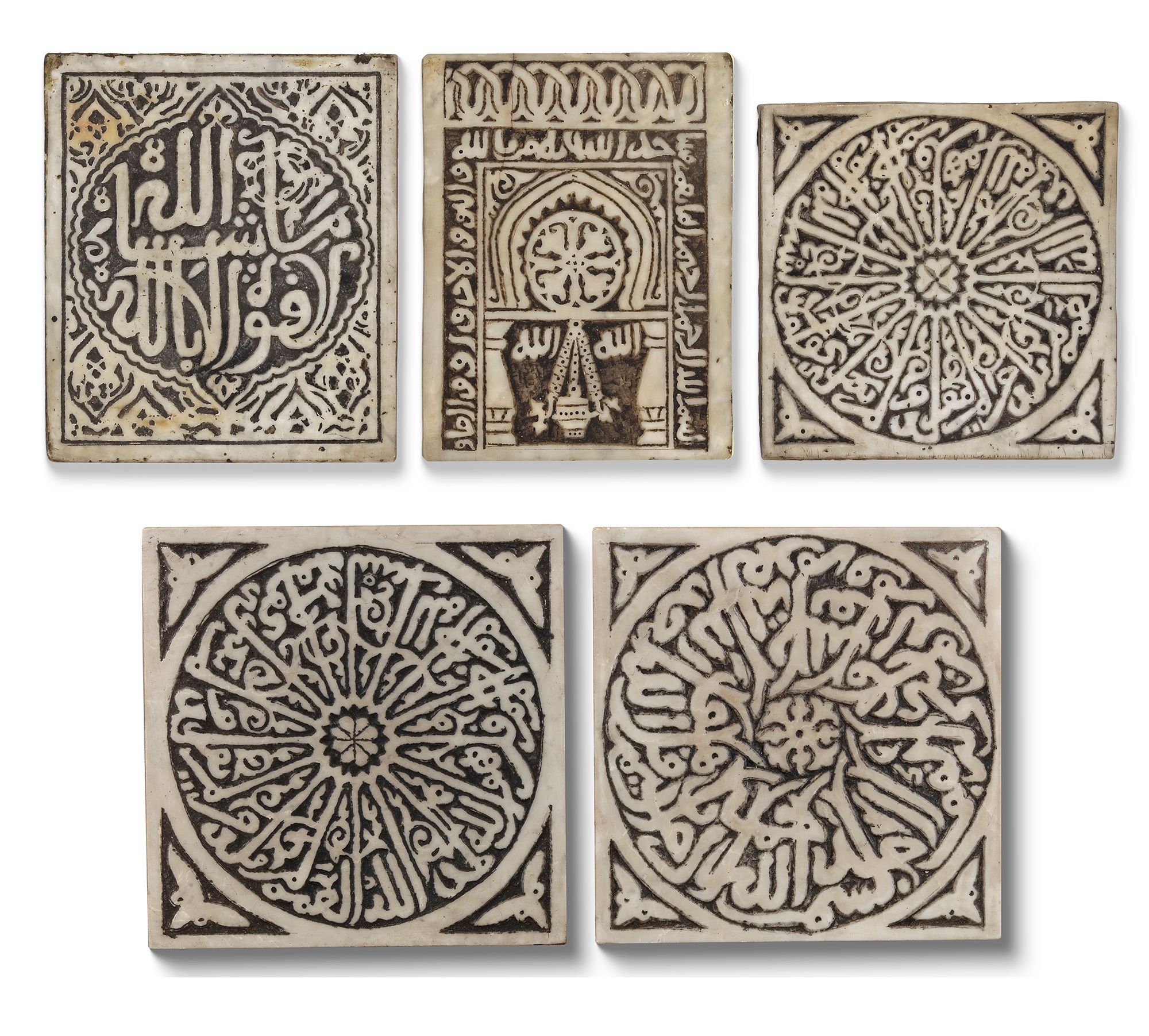 The tiles showcase a blend of calligraphy, geometric motifs, and vegetal designs, serving both as devotional objects and architectural ornaments from cities like Fez or Marrakesh.