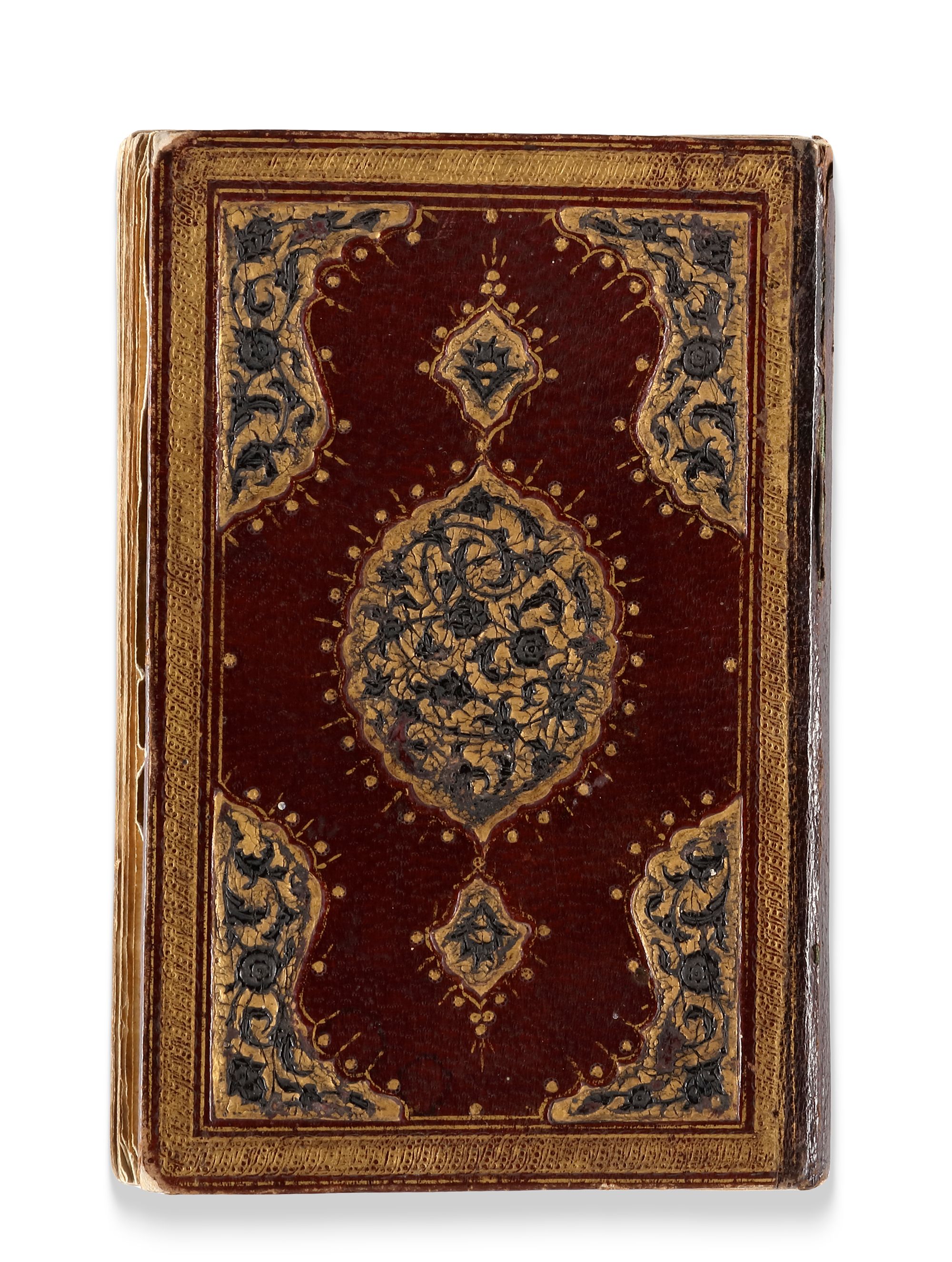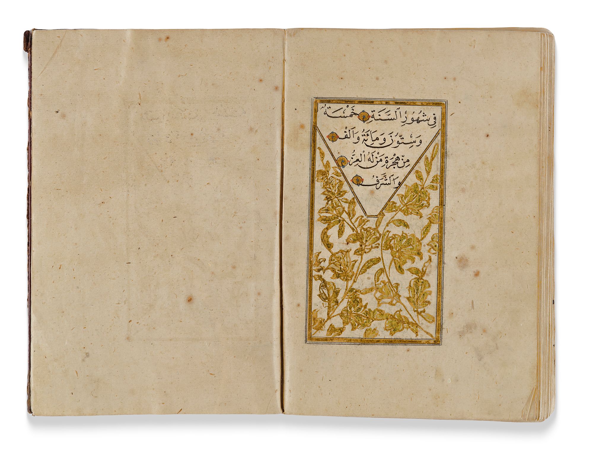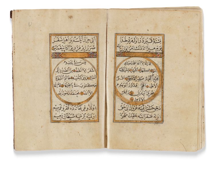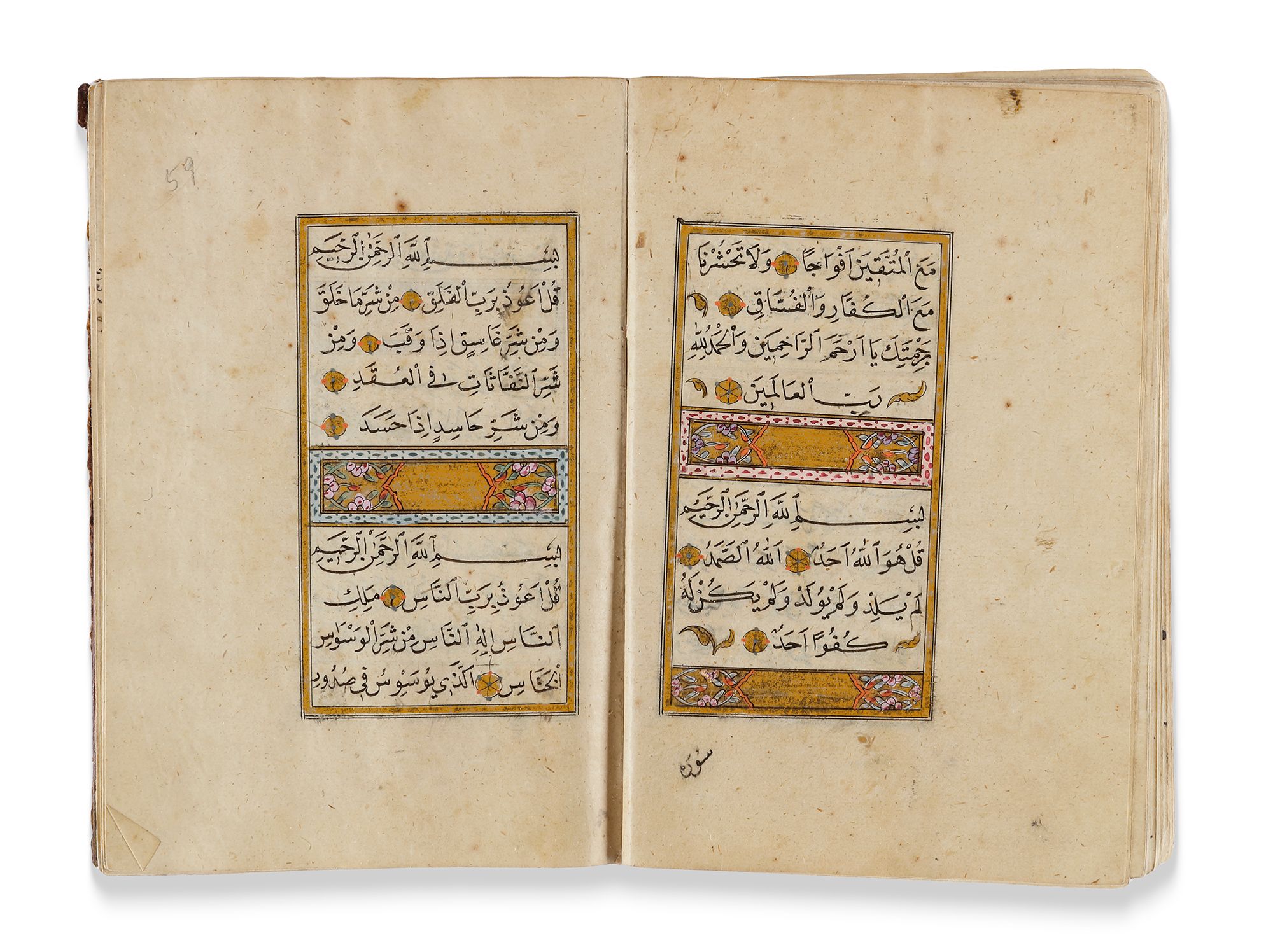 Arabic and Turkish manuscript on paper, 11 lines to the page, written in naskh script in black ink, text separation represented by gold roundels outlined in black and pointed by polychrome dots, illuminated frontispiece with gold and polychrome decoration, surah headings with gold and polychrome decorated panels, ruled in gold and black borders.
