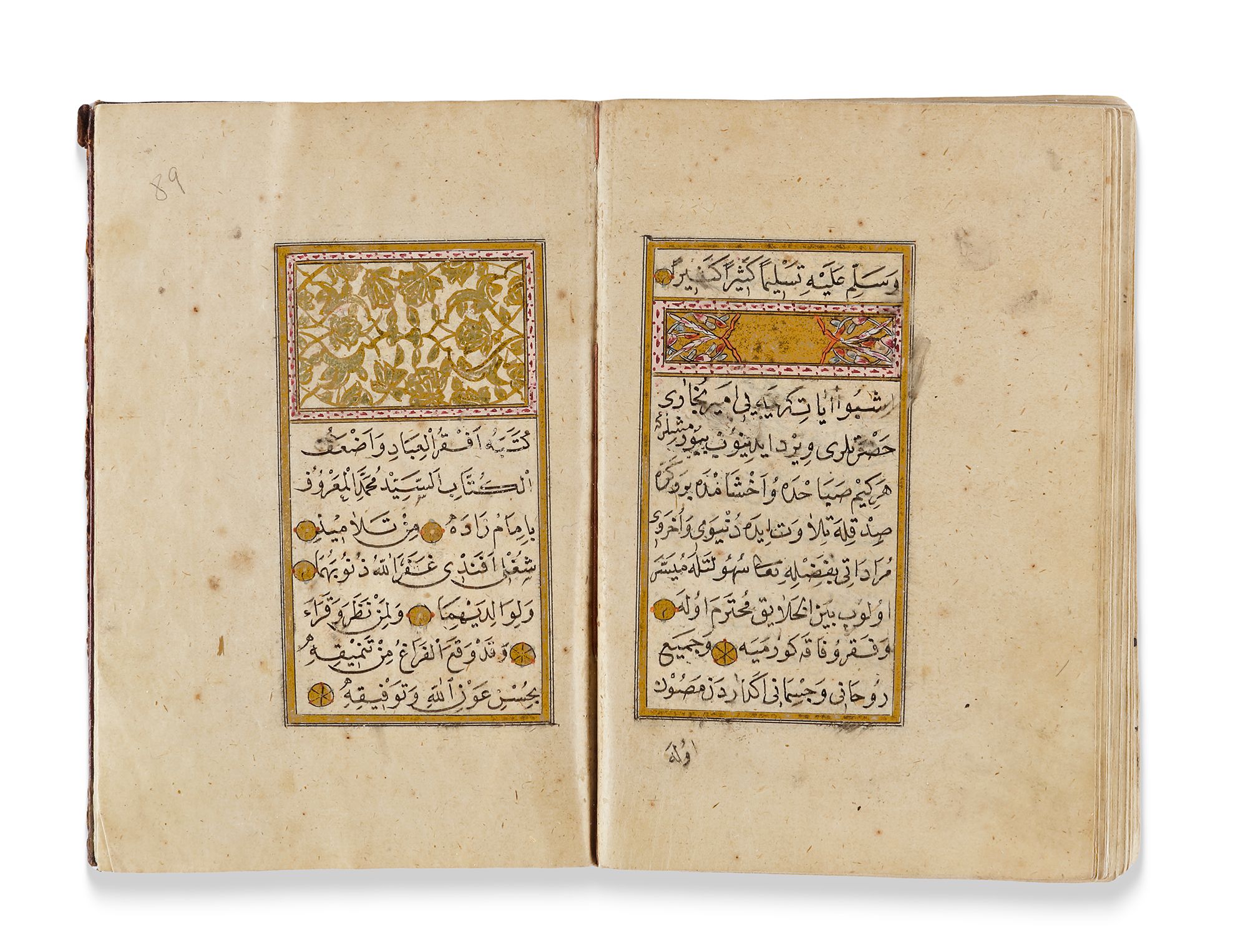 This finely-illuminated manuscript is a collection of Arabic and Turkish prayers. It opens with surah al-An'am, Yasin, al-Mulk, al-Fath, al-Rahman, many different small verses followed by different prayers with commentaries and the Beautiful Names (Asma' al-husna), attributed Beautiful names to the prophet, two Hilya's of the prophet.