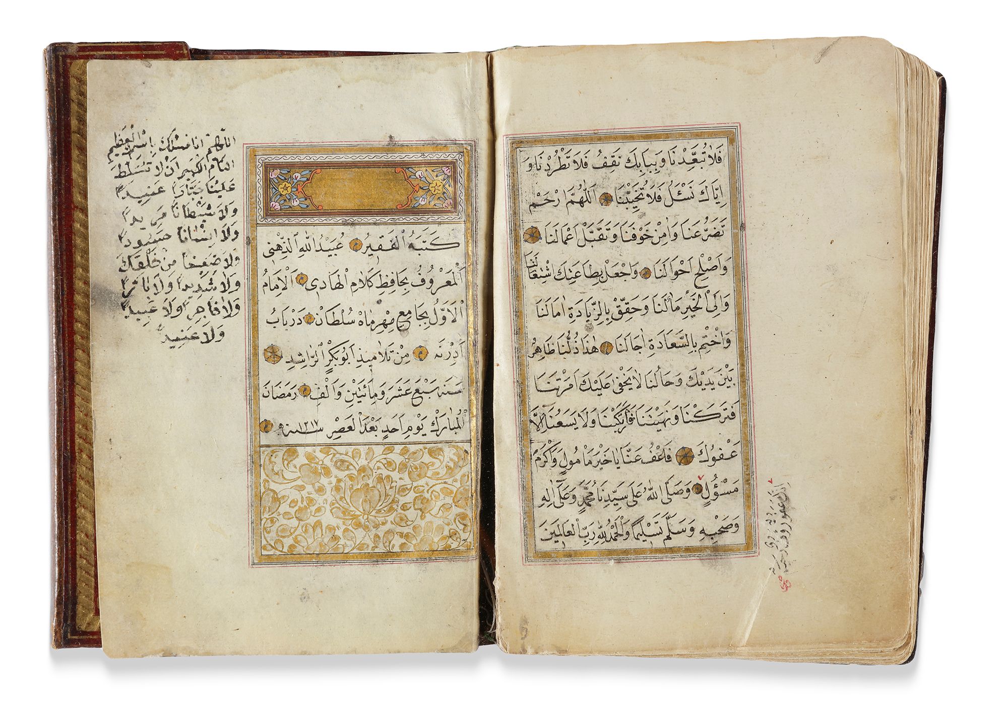 Arabic manuscript on paper depicting prayers in honour of the Prophet Muhammad, each folio with 11 lines written in elegant black naskh script, with gold verse markers outlined in black and pointed out in polychrome dots, some words picked out in red, text within double gold and red rules, two opening biofolio with royal gold and polychrome decoration.