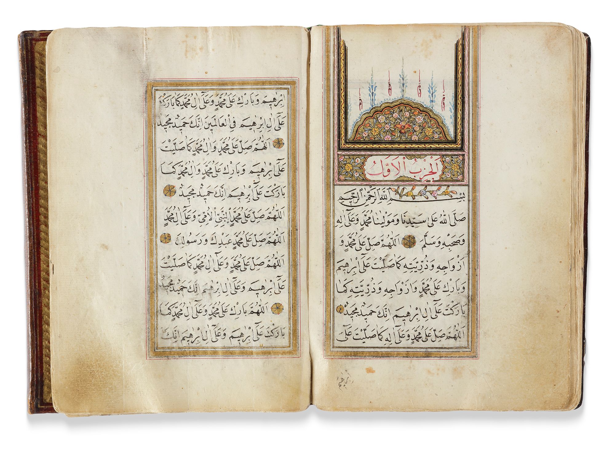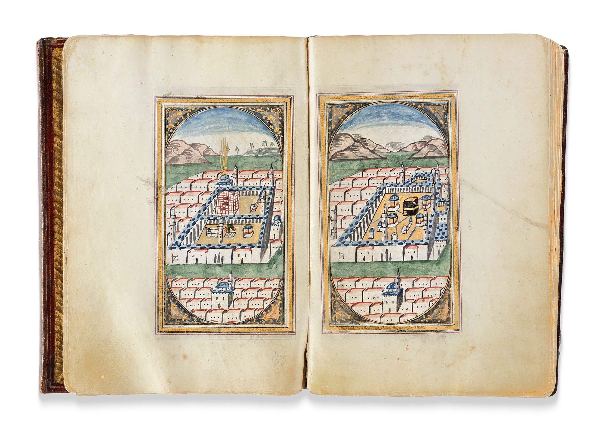 Further two detailed illustrations Mecca and Medina with Al-Masjid AL-Haram and Al-Masjid AL-Nabawi, different attributed names to the Prophet, 6 chapters or ''Hiz'' of prayers, occasional marginal notes, colophon signed 'written by al-Faqir Ubeydullah zehni, the first Imam of Mihrimah Sultan Mosaque in Edirne, student of Abu Bakr Rasid and dated in Rmadan 1217 AH '