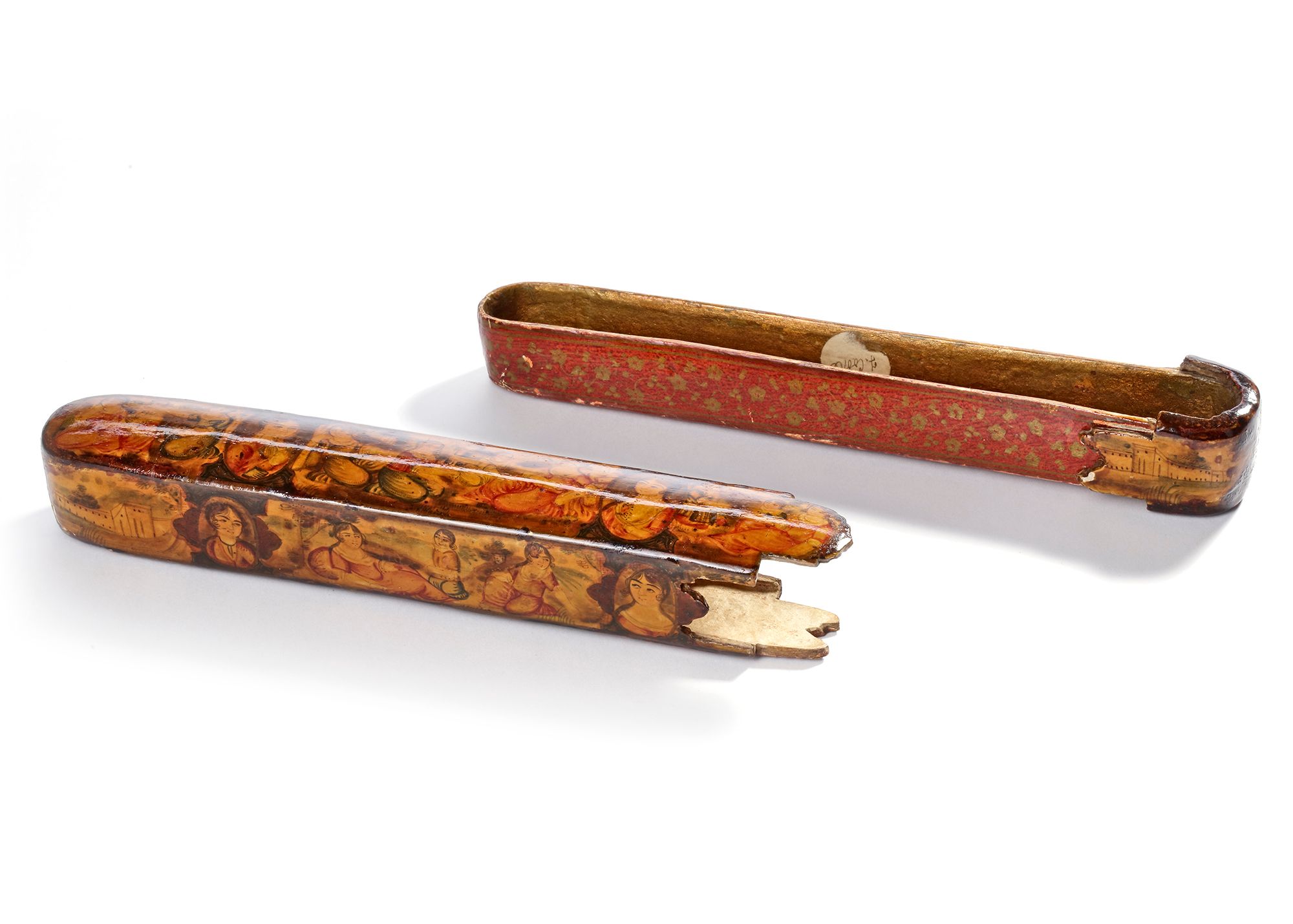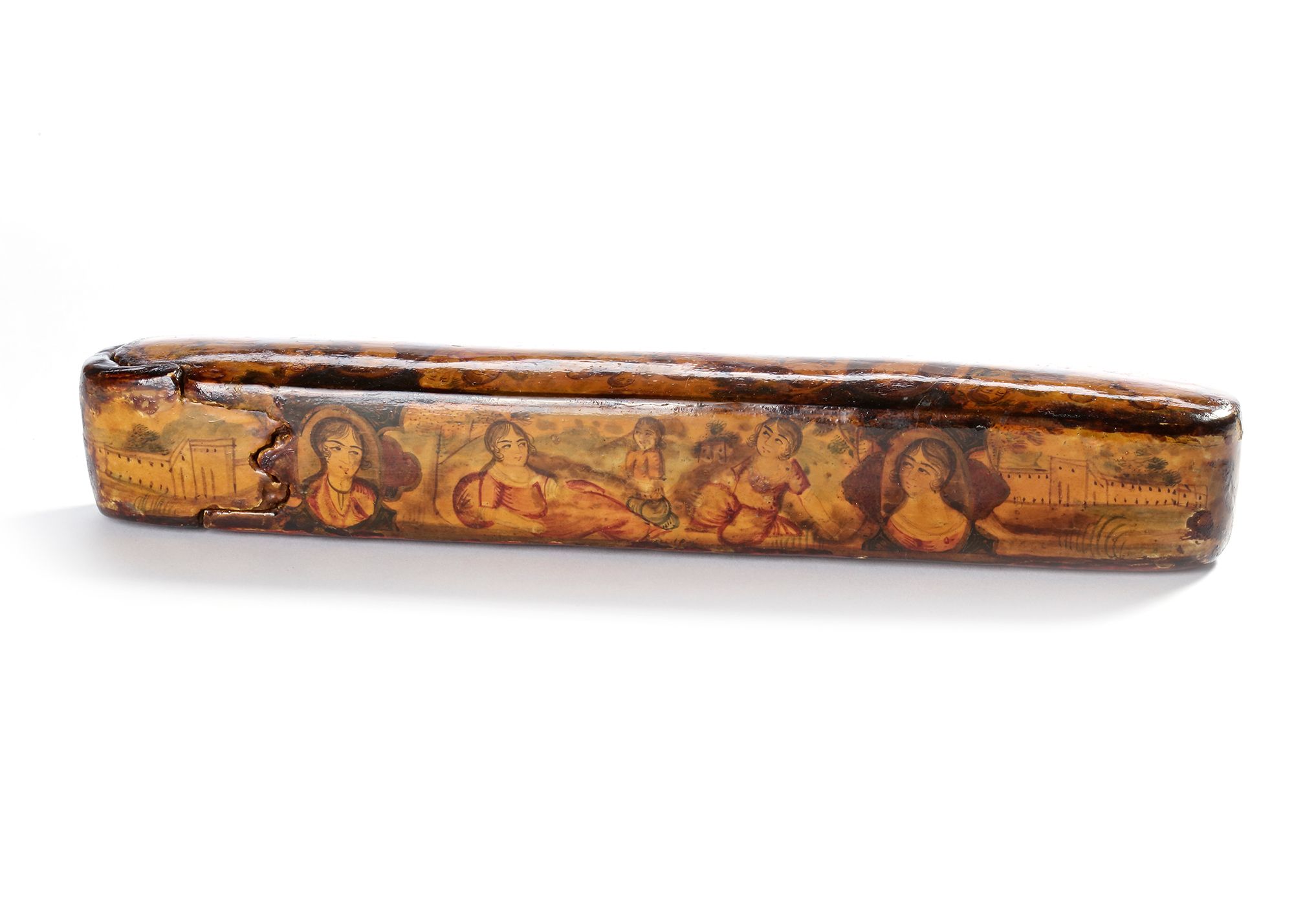 Of elongated oval form with sliding drawer, decorated in gilt and polychrome, the top and the sides depicting portraits of a royal family in a landscape, an European-style castle in the background, the underside and the tray stylized with gilt floral scrolls on a red painted ground.
