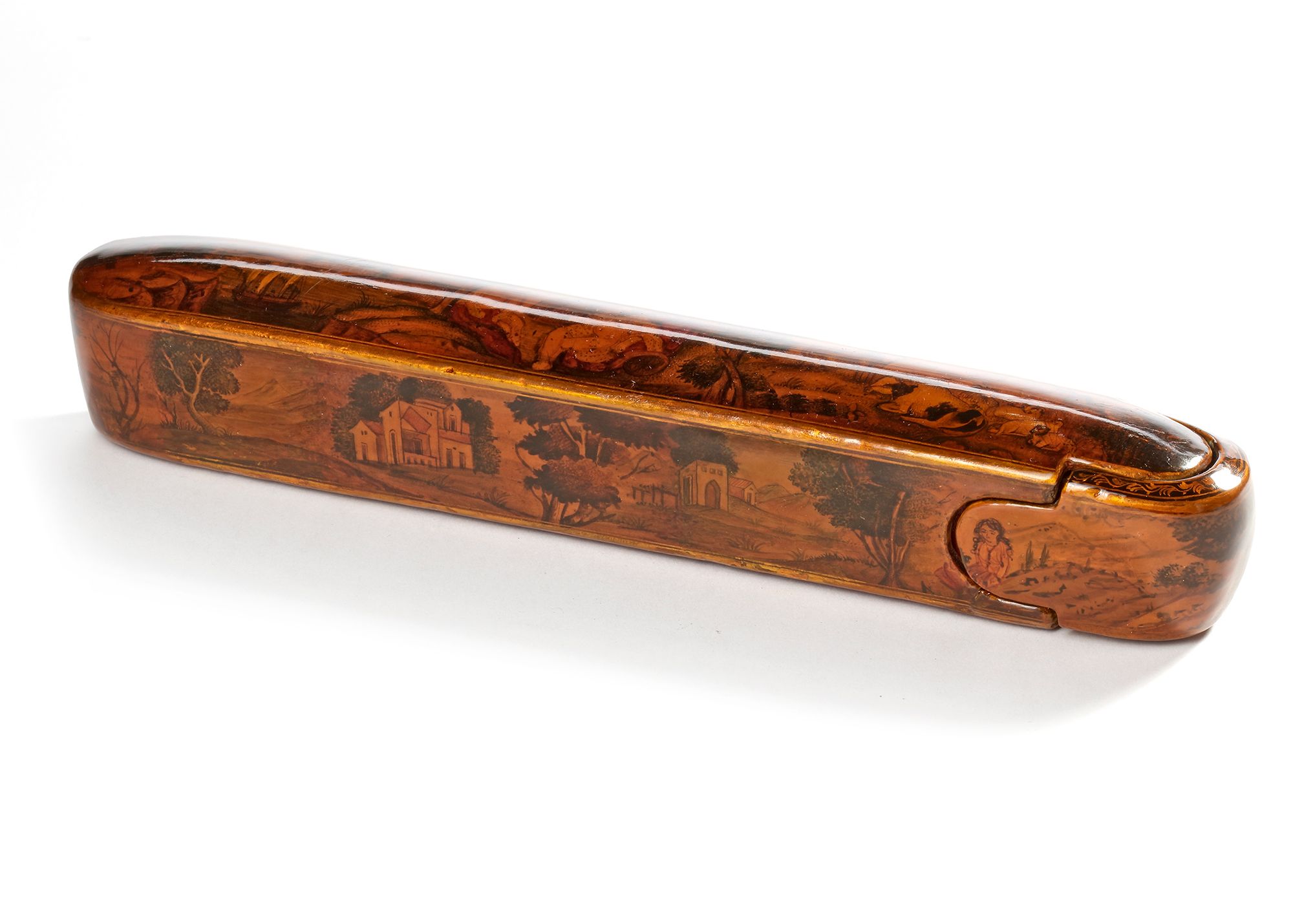 Of elongated oval form with sliding drawer, decorated in gilt and polychrome, the top and the sides depicting Qajar figures with animals in a landscape, the sides with castles in the background, the underside and the tray stylized with gilt floral scrolls on a red painted ground.