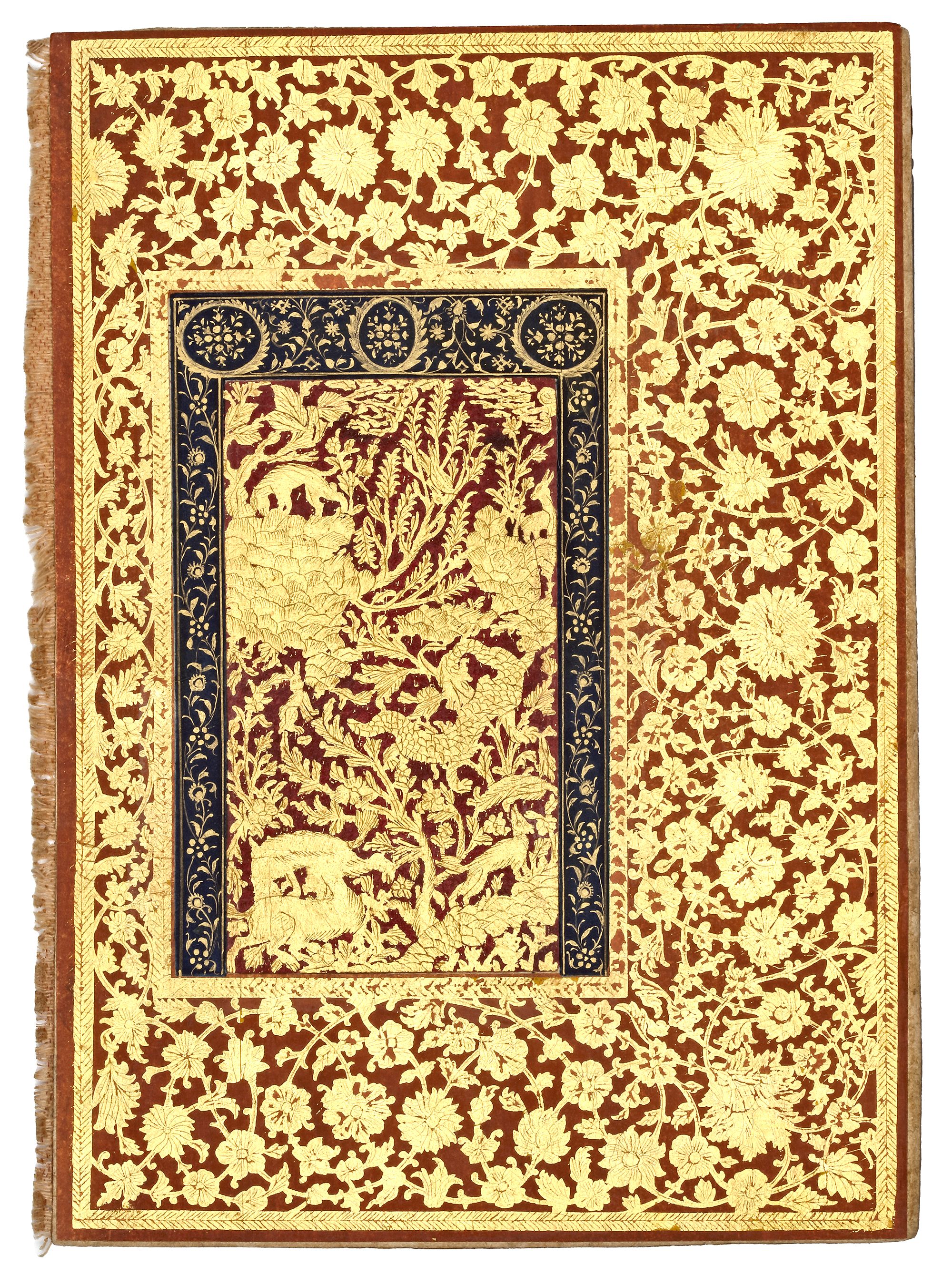 Lavishly adorned in gold against a black and red background, the central panel features wild animals and deer playfully frolicking through a forest scene. The surrounding black border is embellished with stylized gilt floral scrollwork, while the outer margin is richly decorated with an illuminated floral pattern set against a deep red ground.