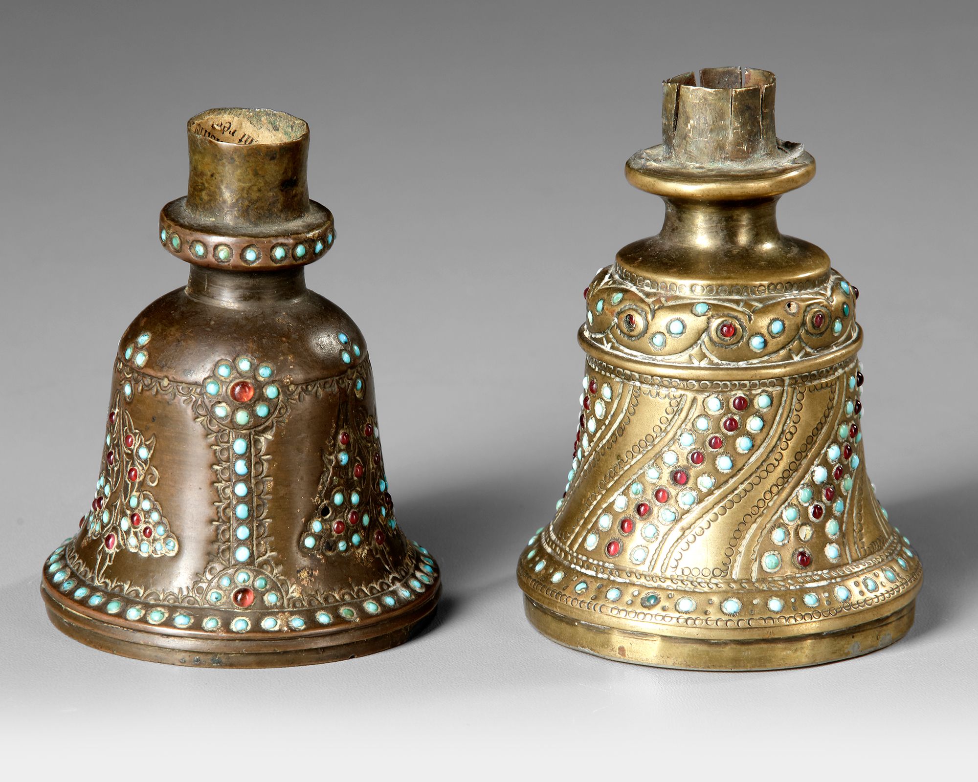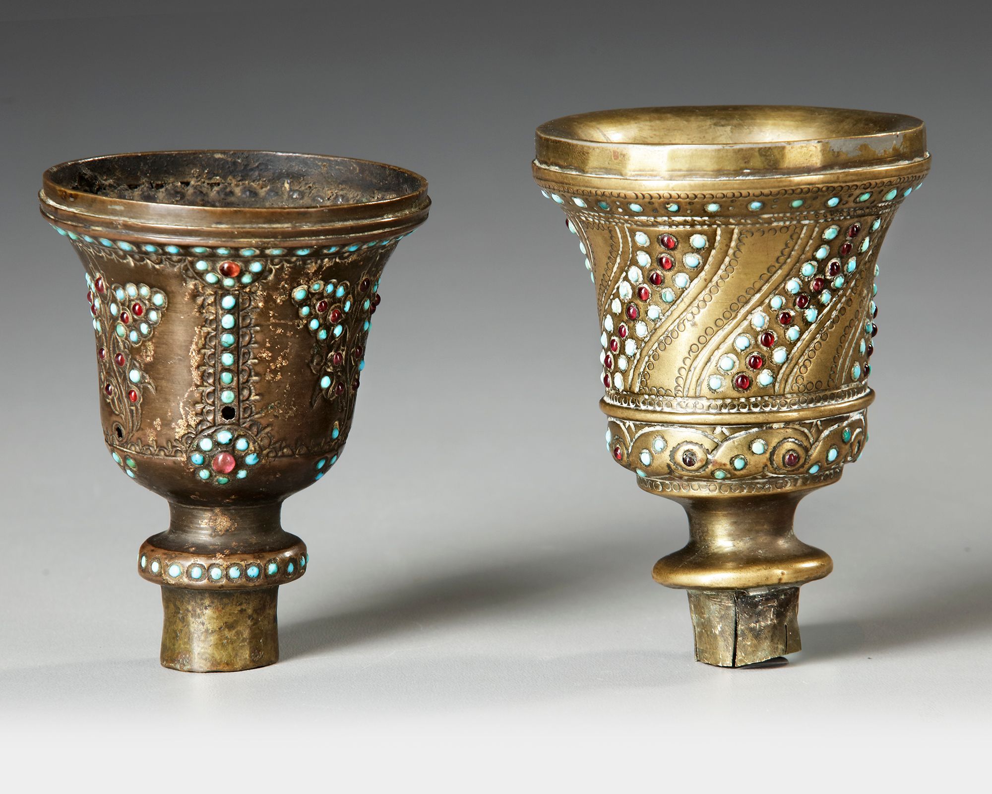 Two Qajar brass turquoise-mounted brass ghalian cups, each of flared bucket form with additional red gem-stones decoration.
