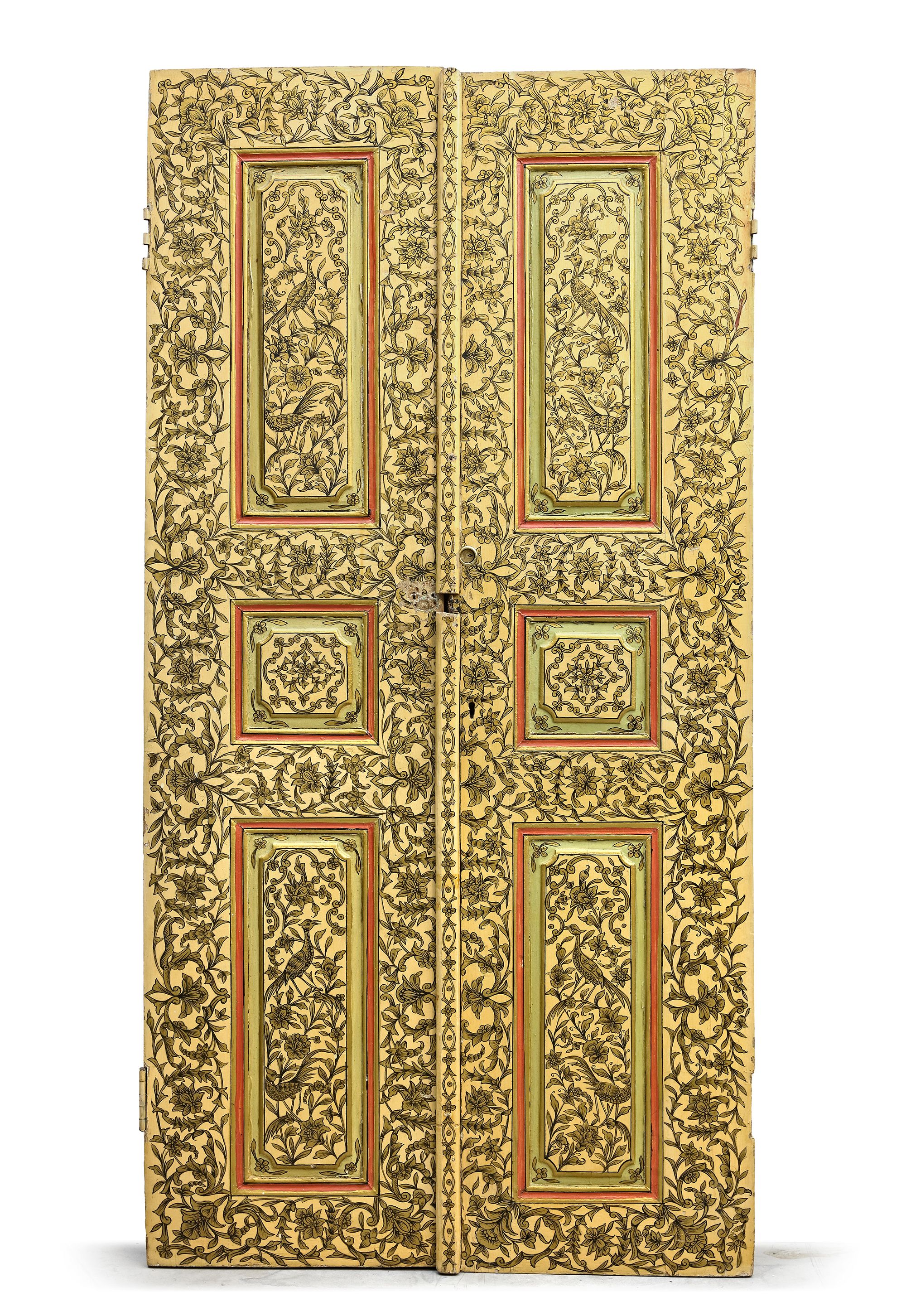 Each wooden door painted in yellow, red, and gold highlights, featuring birds almost floral designs. 27.5 by 88 cm. each.