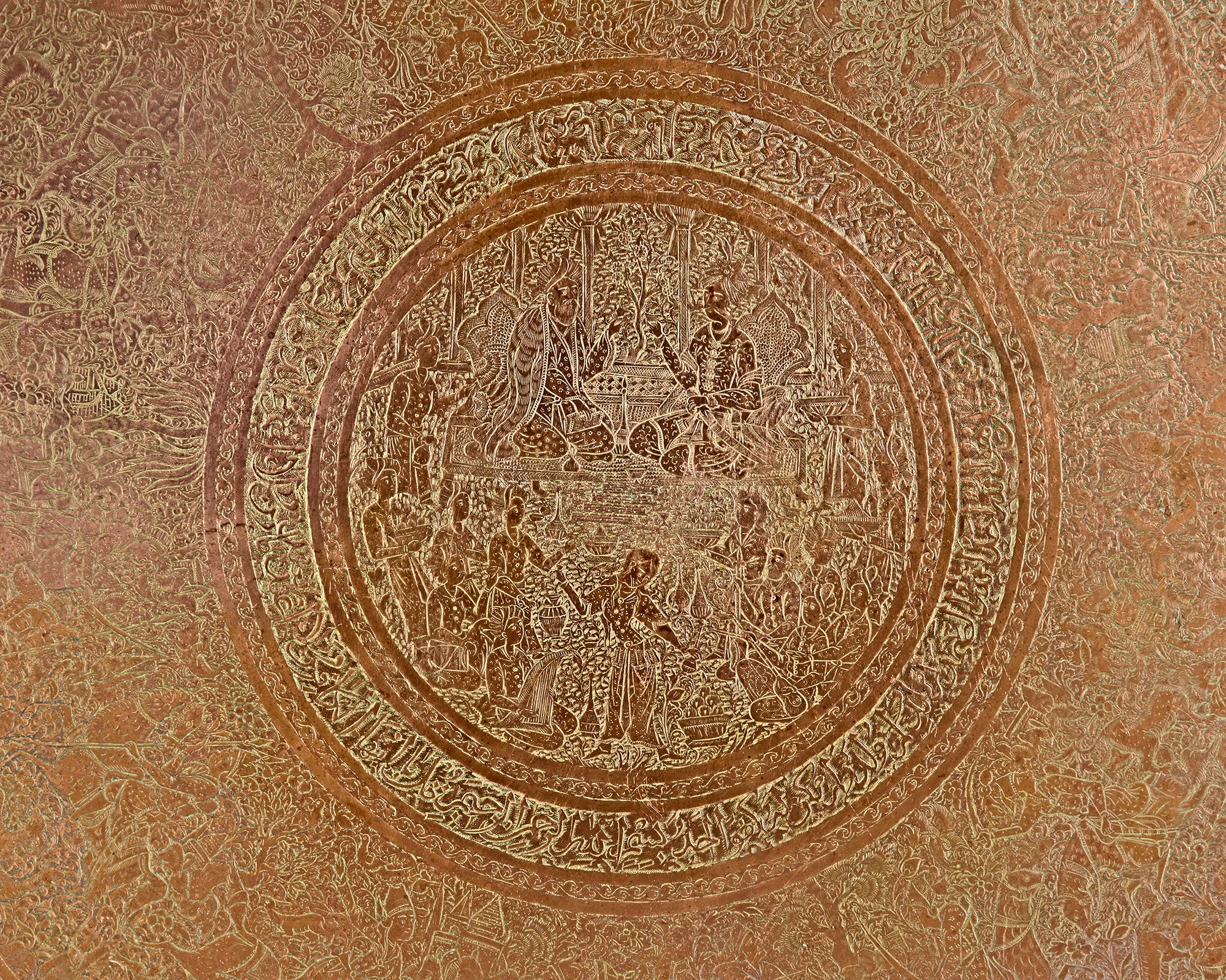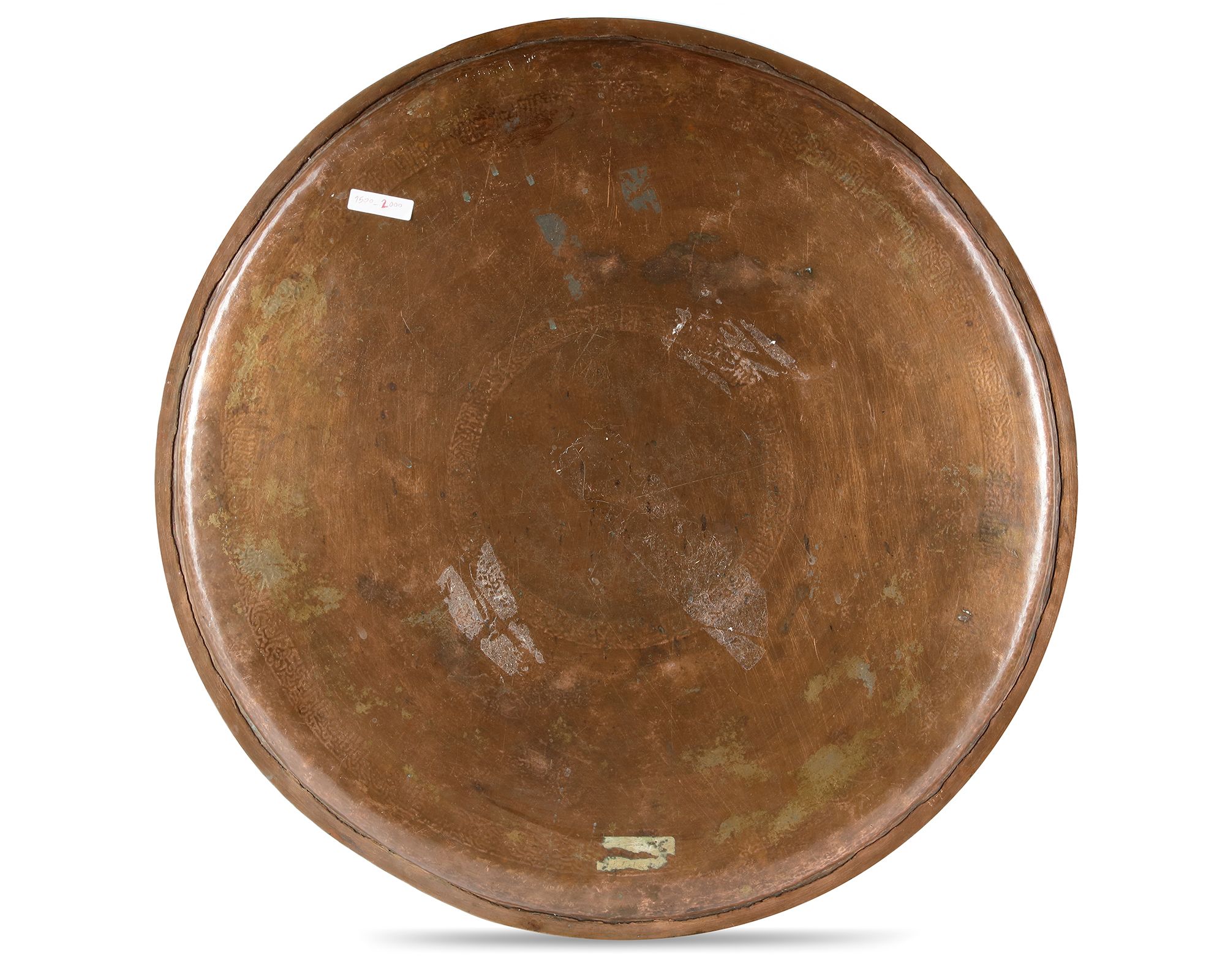 A large, intricately engraved circular copper tray with an everted rim, exemplifying masterful craftsmanship and opulent decorative themes.