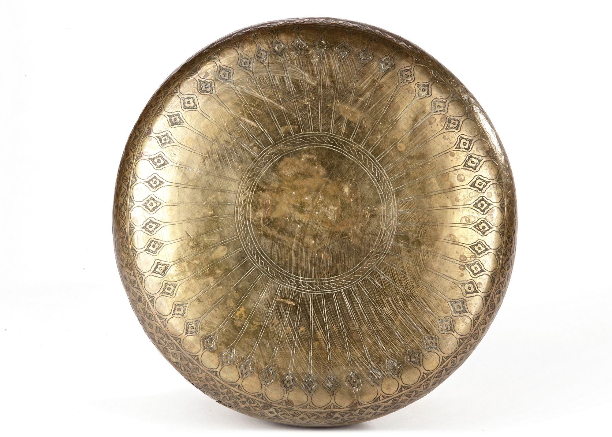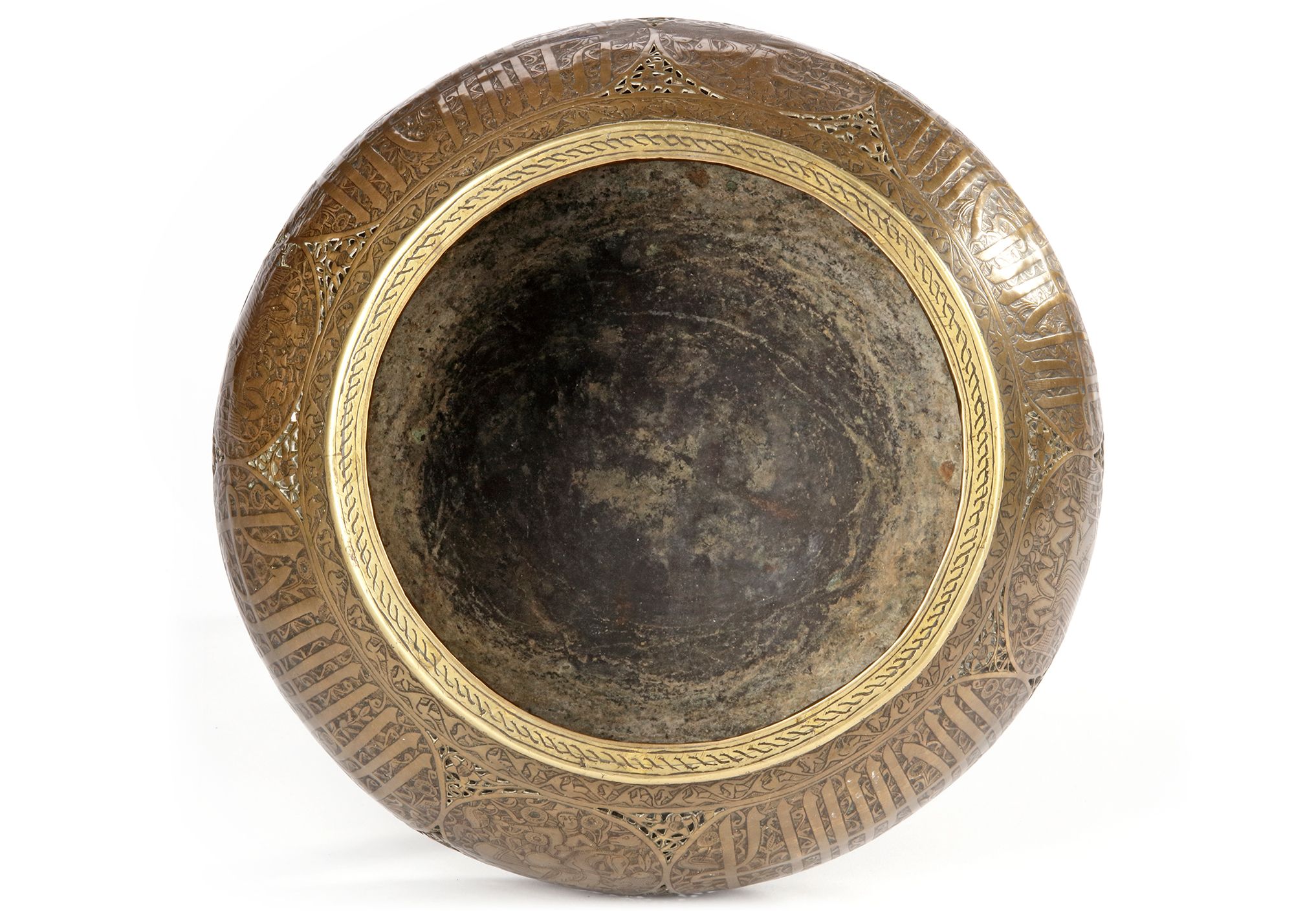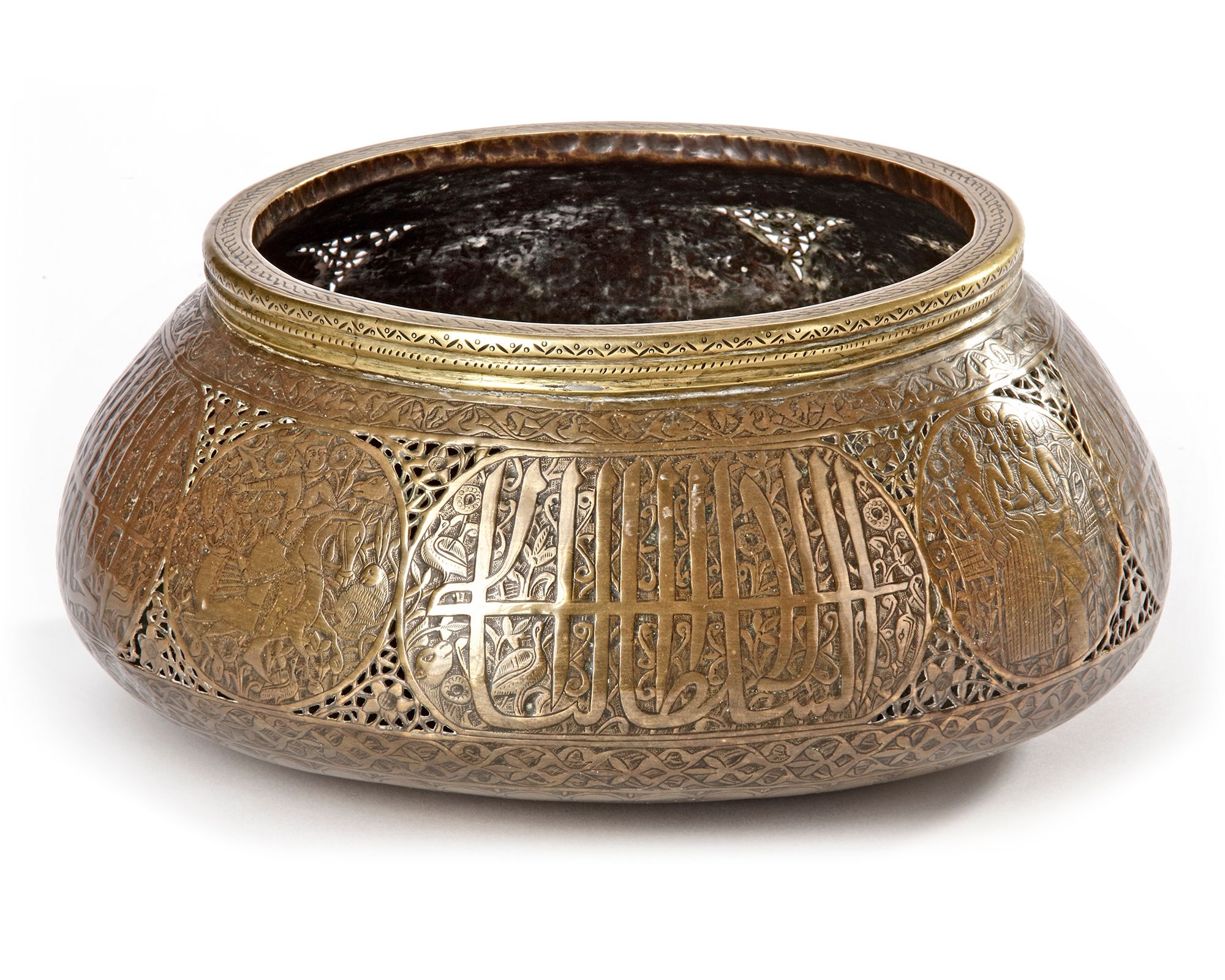 Of typical form, with a rounded base and a long, sloping shoulder rising to a triangular-section rim. The shoulder is engraved with a broad band featuring oval cartouches bearing Thuluth inscriptions, alternating with roundels depicting a horseman in a hunting scene, flanked by a deer and a bird, and bordered by two classical floral bands.