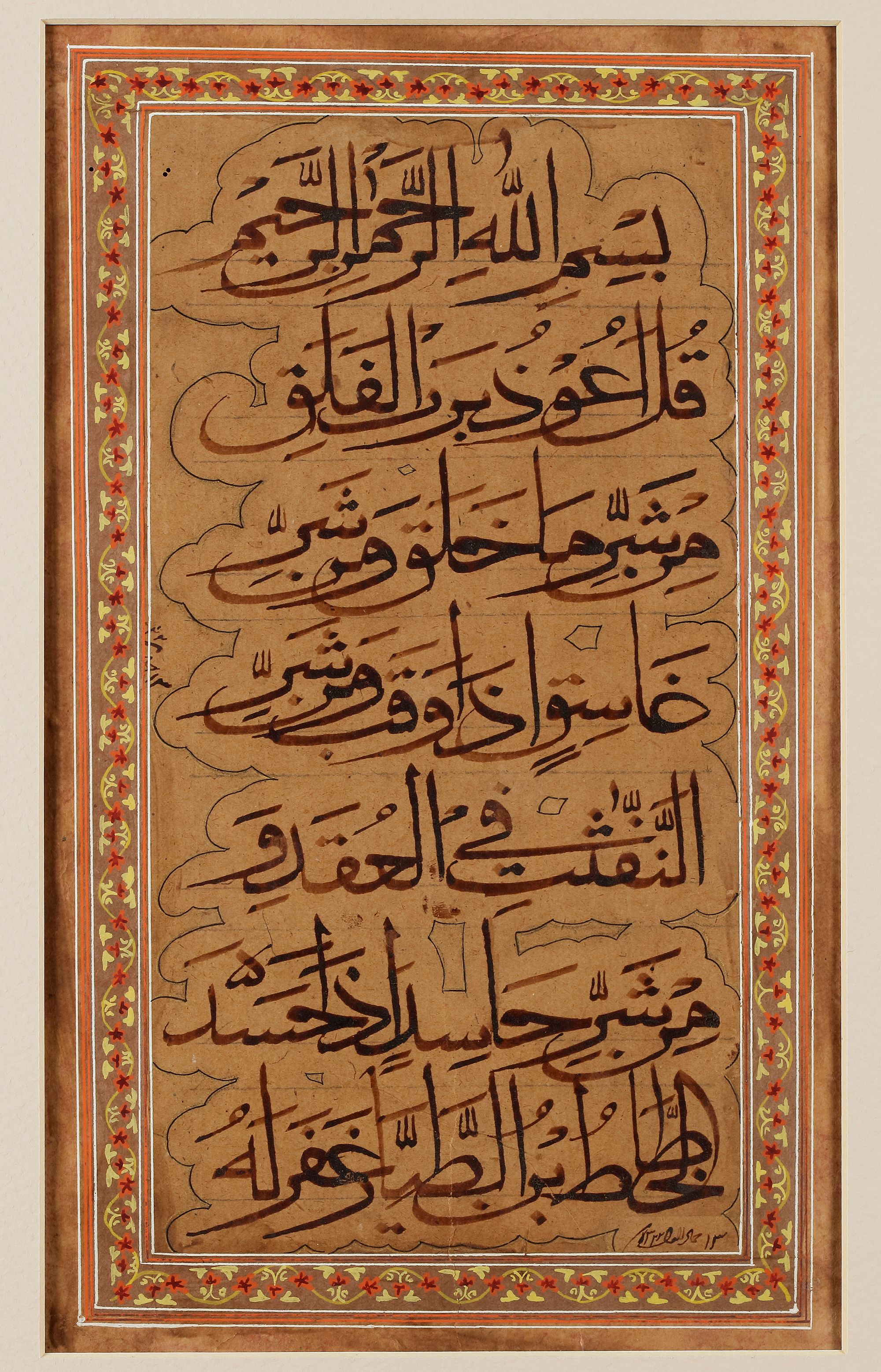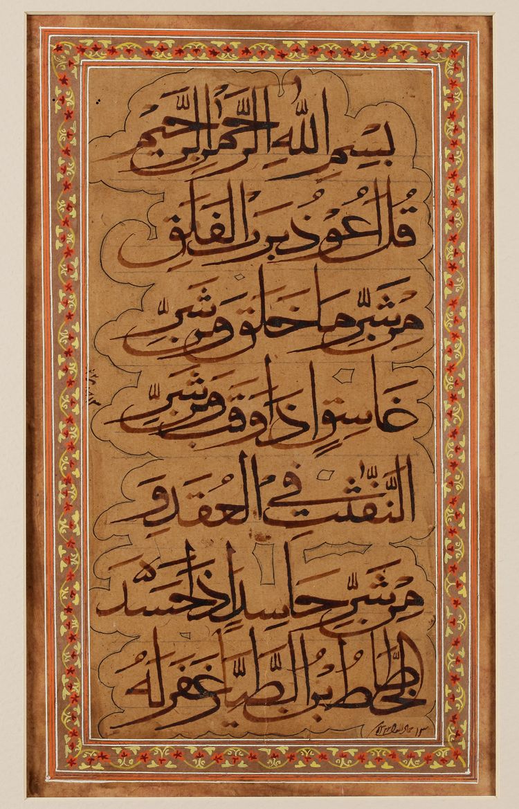 Arabic manuscript on paper, 7 lines in black Naskh script, depicting Surah al-Falaq, set in clouds. The outer border features a polychrome floral scroll. Signed 'Ibn al-Tayyar' and dated 1322 AD.