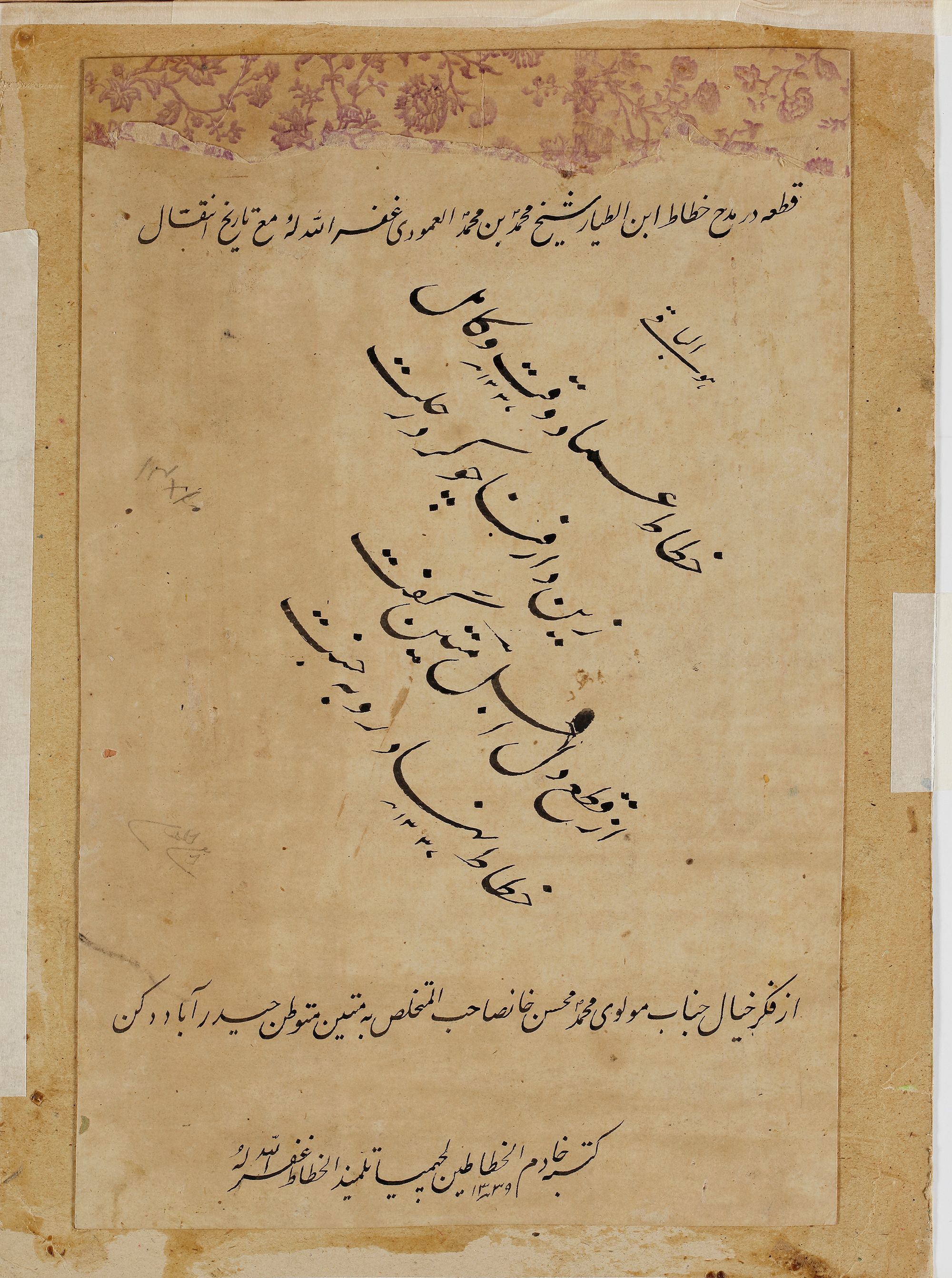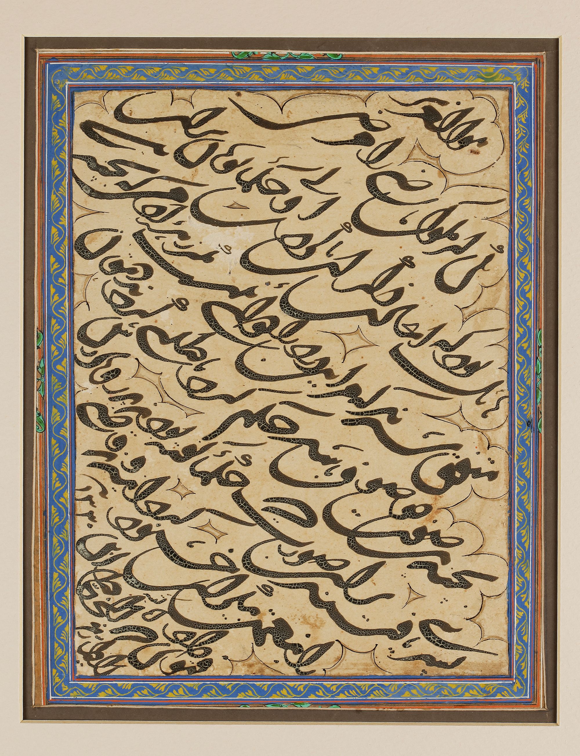 Arabic manuscript on paper, 8 lines, written diagonally in black naskh script, reserved in clouds, ruled with polychrome borders, the margins stylized with yellow floral scrolls on a blue ground. The calligraphy is signed in the corner: written by Ibn al-Tayyar and dated 1330 AH. 17 by 22 cm.