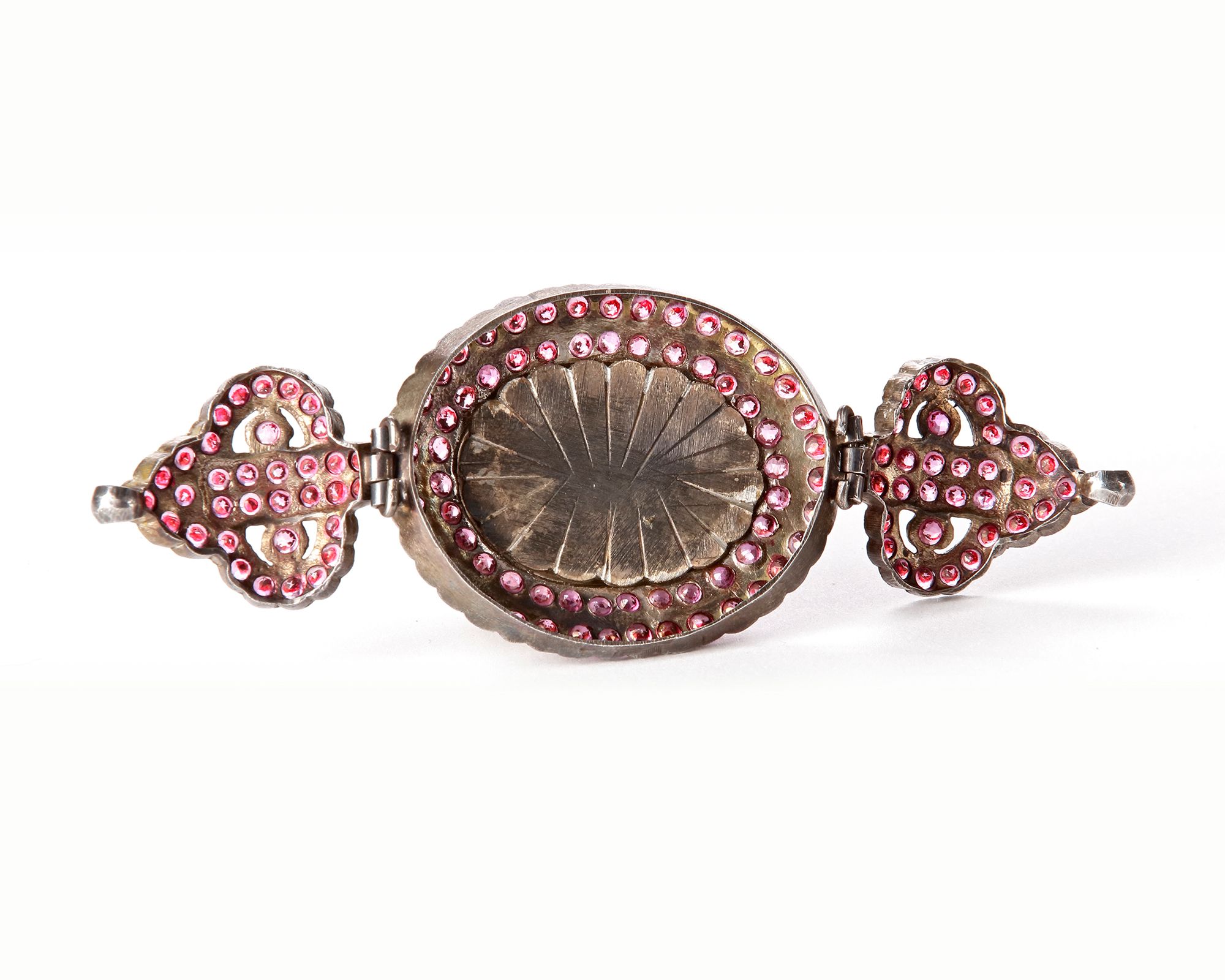 The central compartment is designed as a locket, hinged to reveal an inner cavity—traditionally used to hold talismanic or scented elements. Flanking the center are symmetrical foliate side panels, also set with vibrant rubies in openwork silver settings, forming a seamless continuation of the opulent design.