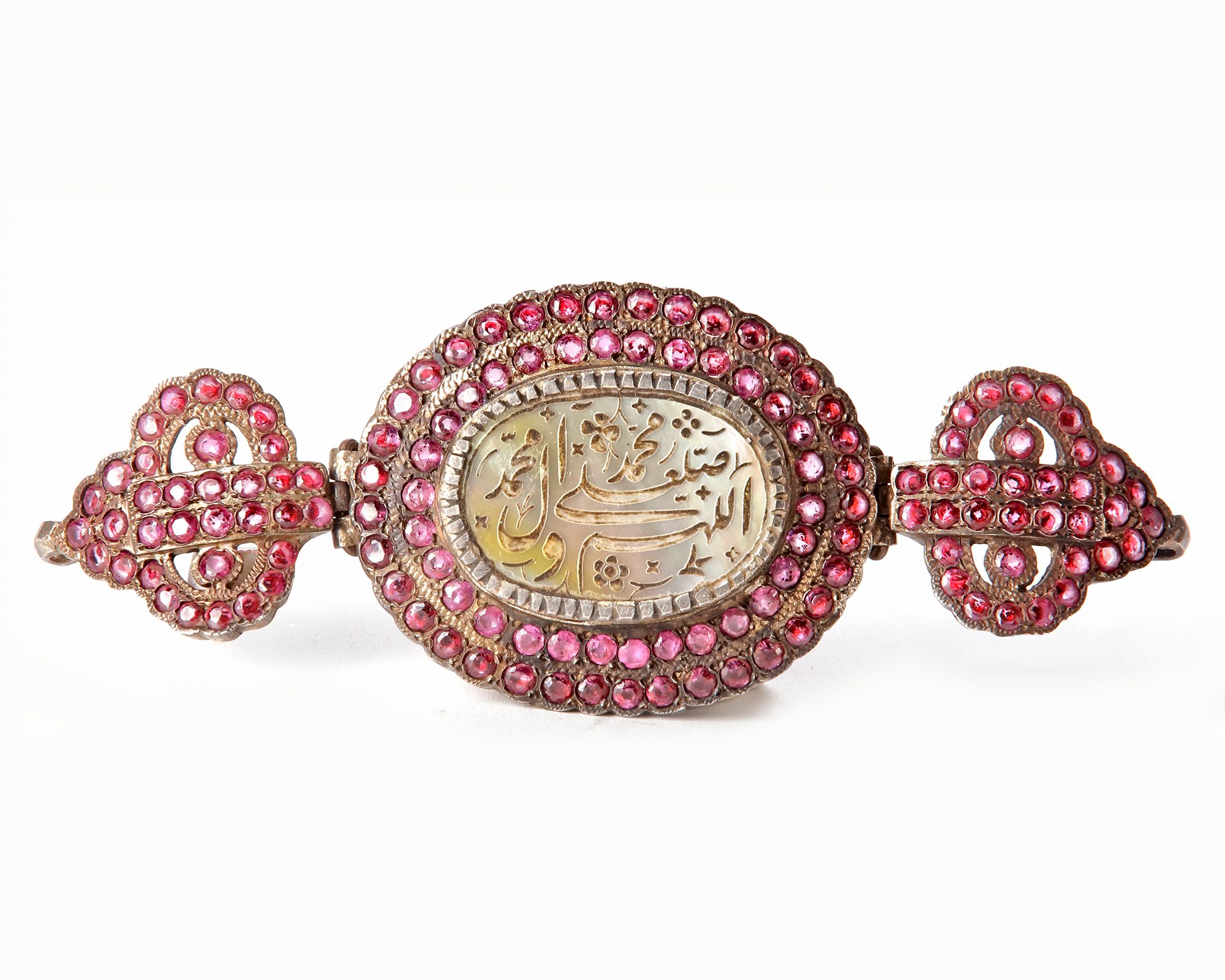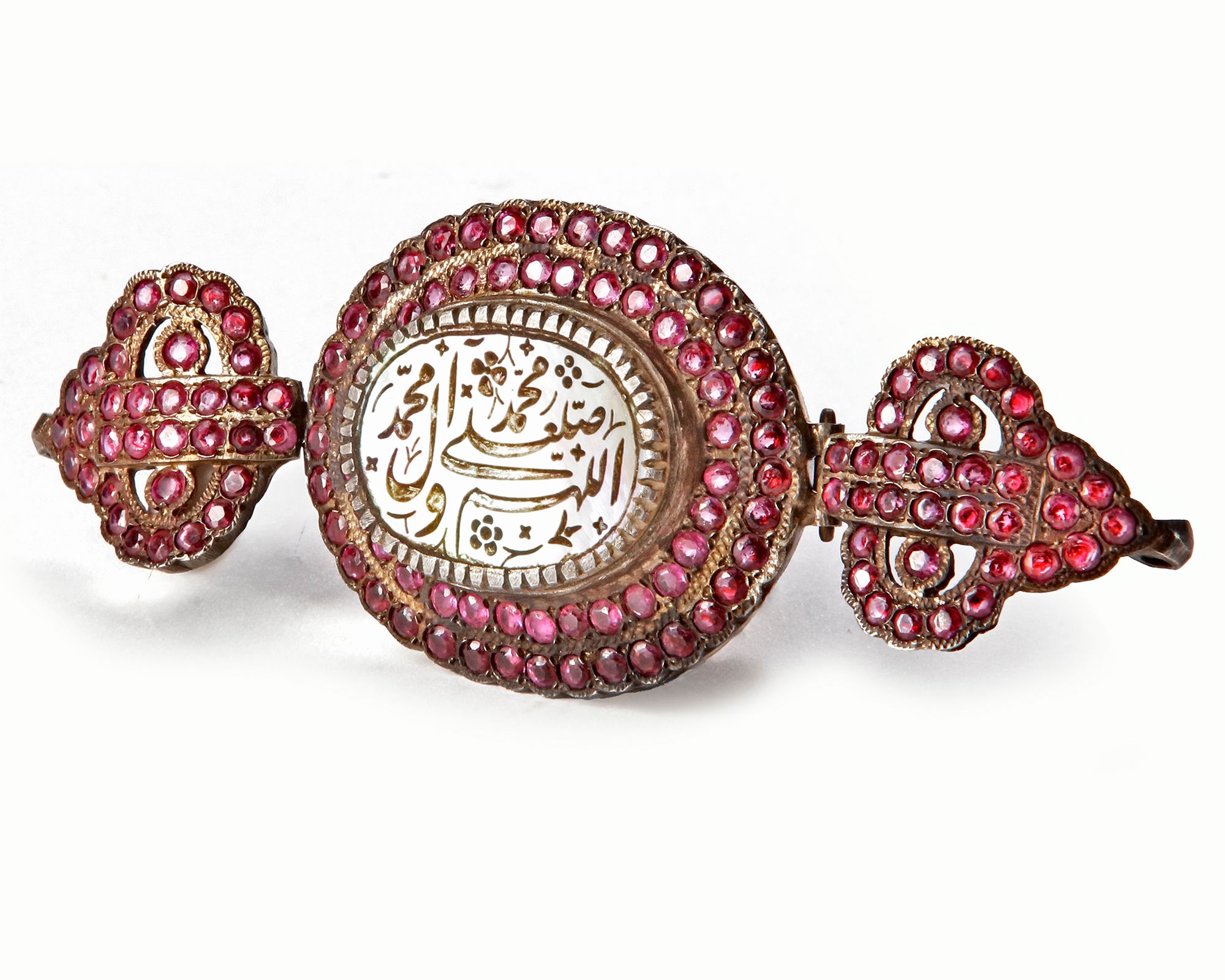 An Indian bazuband, the piece features a central oval panel meticulously set with two concentric rows of faceted rubies, framing a carved white moth-of-pearl inlaid with elegant Arabic calligraphy, religious inscription.