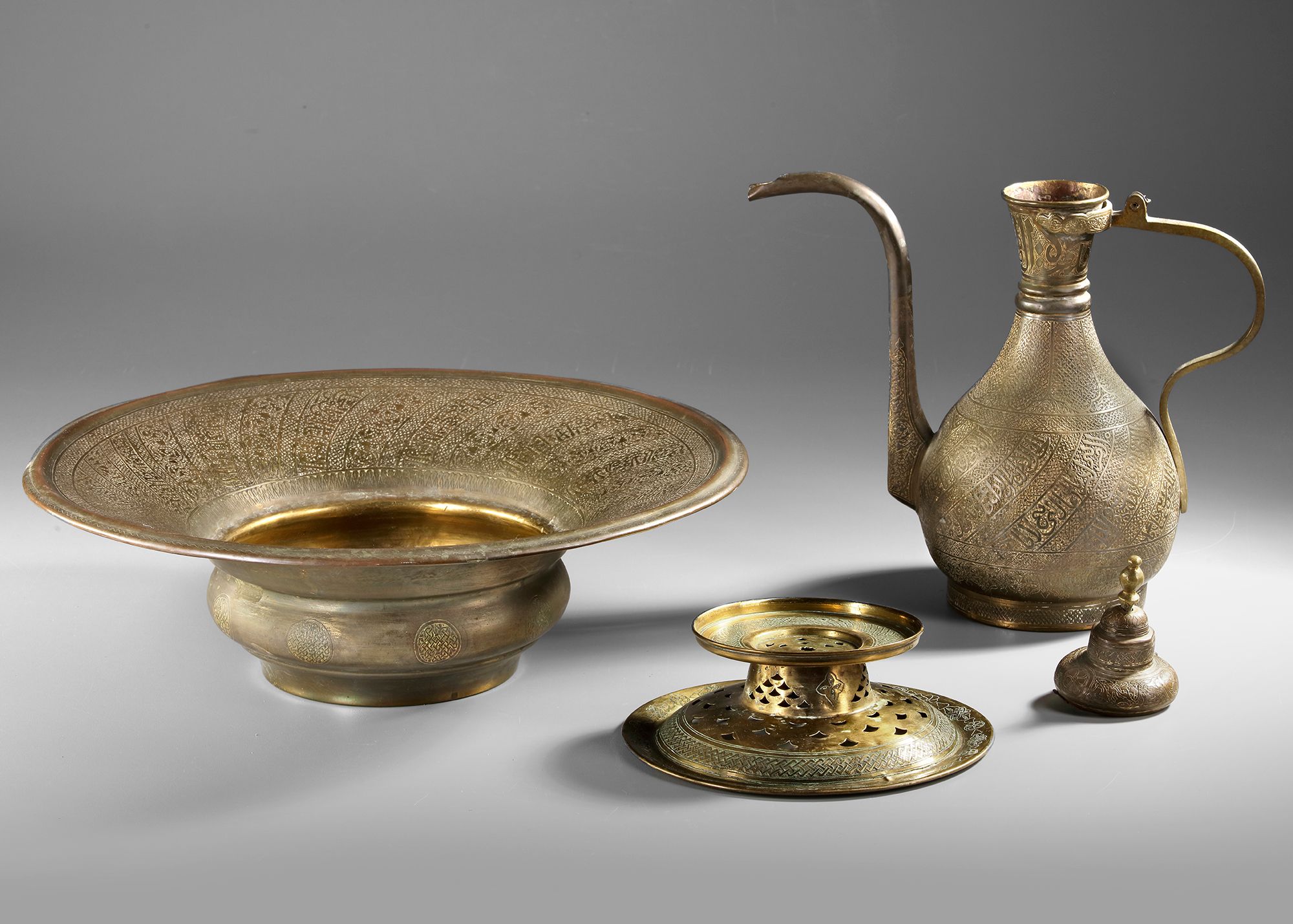 An exquisite brass ewer and basin set, richly adorned with intricate Arabic and calligraphic engravings, showcasing remarkable craftsmanship.