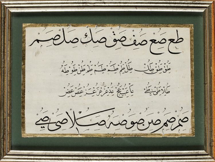 Black ink on paper, a succession of combined letters illustrating various forms of two letters '' Sad and Ta'a '', each with two lines of large black thuluth script arranged between two lines of smaller black naskh script, two leaves framed together.