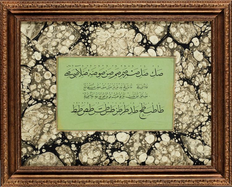 Black ink on paper, a succession of combined letters illustrating various forms of two letters '' Sād w Ṭāʼ '' , two lines of large black thuluth script arranged between two lines of smaller black naskh script, framed.