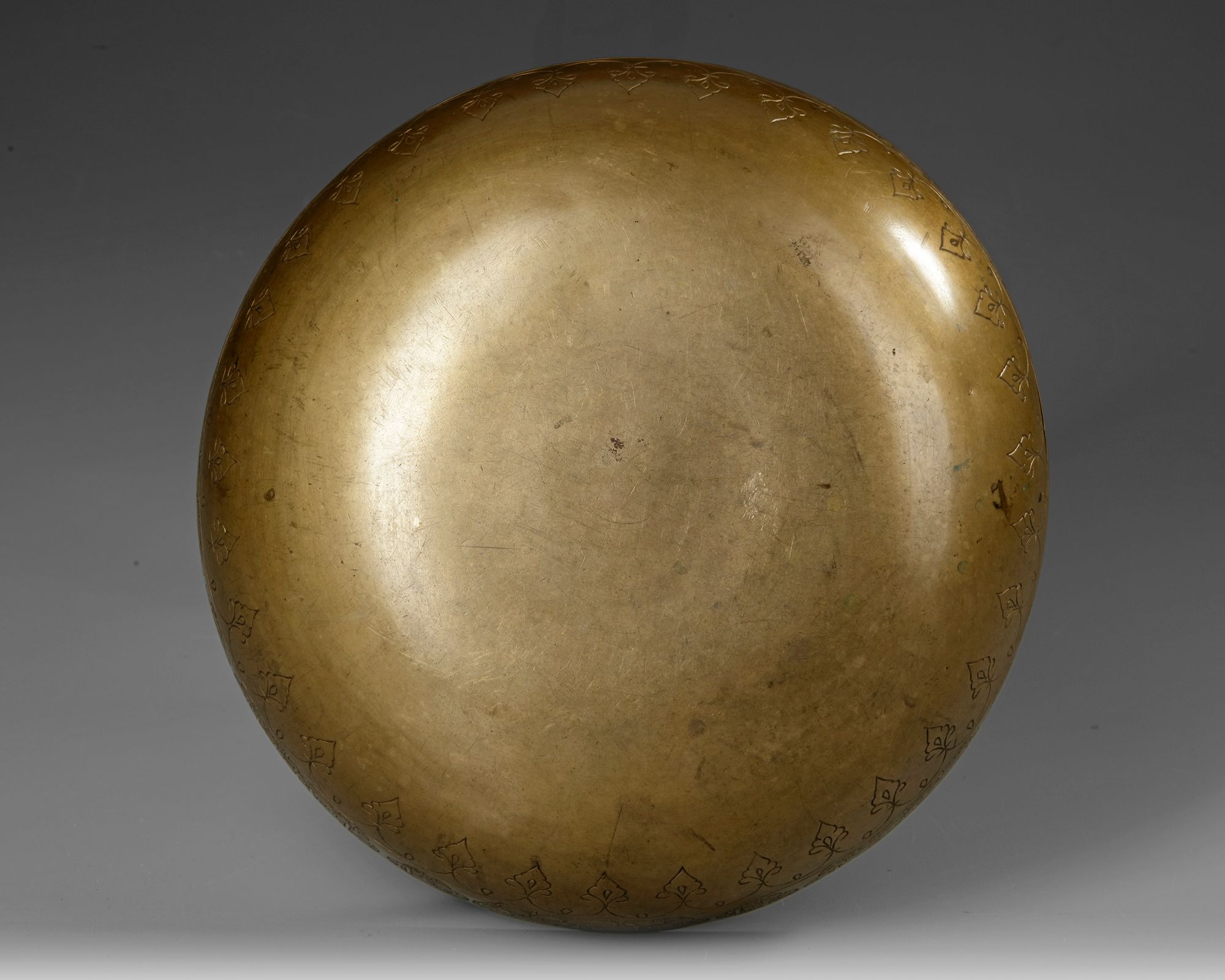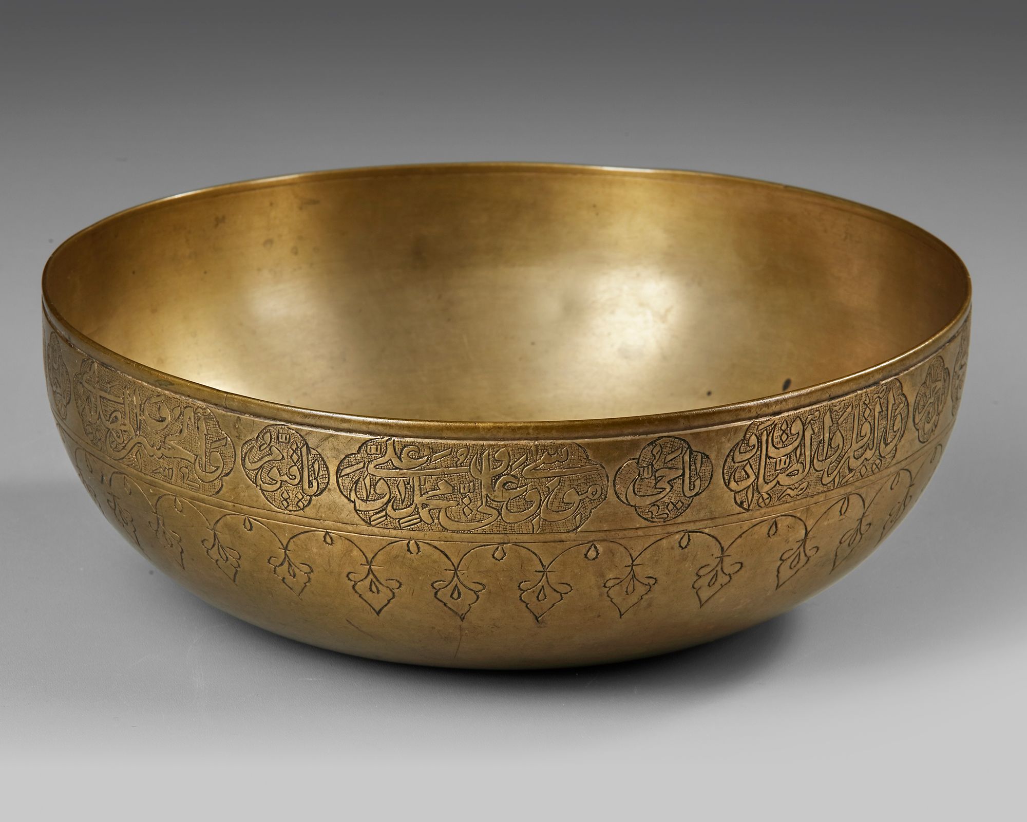 A Persian copper bowl of rounded form, finely engraved around the rim with cartouches enclosing inscriptions in thuluth script, set above delicate vegetal motifs. The inscriptions bear the names of Ahl al-Bayt (the family of the Prophet Muhammad, peace be upon him).