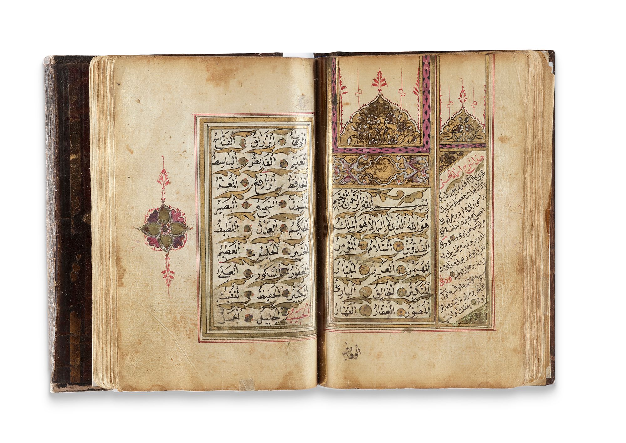 A finely illuminated Arabic manuscript, written in black ink using Naskh script, featuring 9 lines per page. Text divisions are marked by gold roundels accented with blue dots. The manuscript opens with an illuminated frontispiece; surah headings are inscribed in black ink within gold-ground cartouches, surrounded by polychrome floral decoration. The text is ruled in gold and black and includes 15 fully illuminated pages. Bound in brown morocco with gilt-stamped medallions and a fore-edge flap.