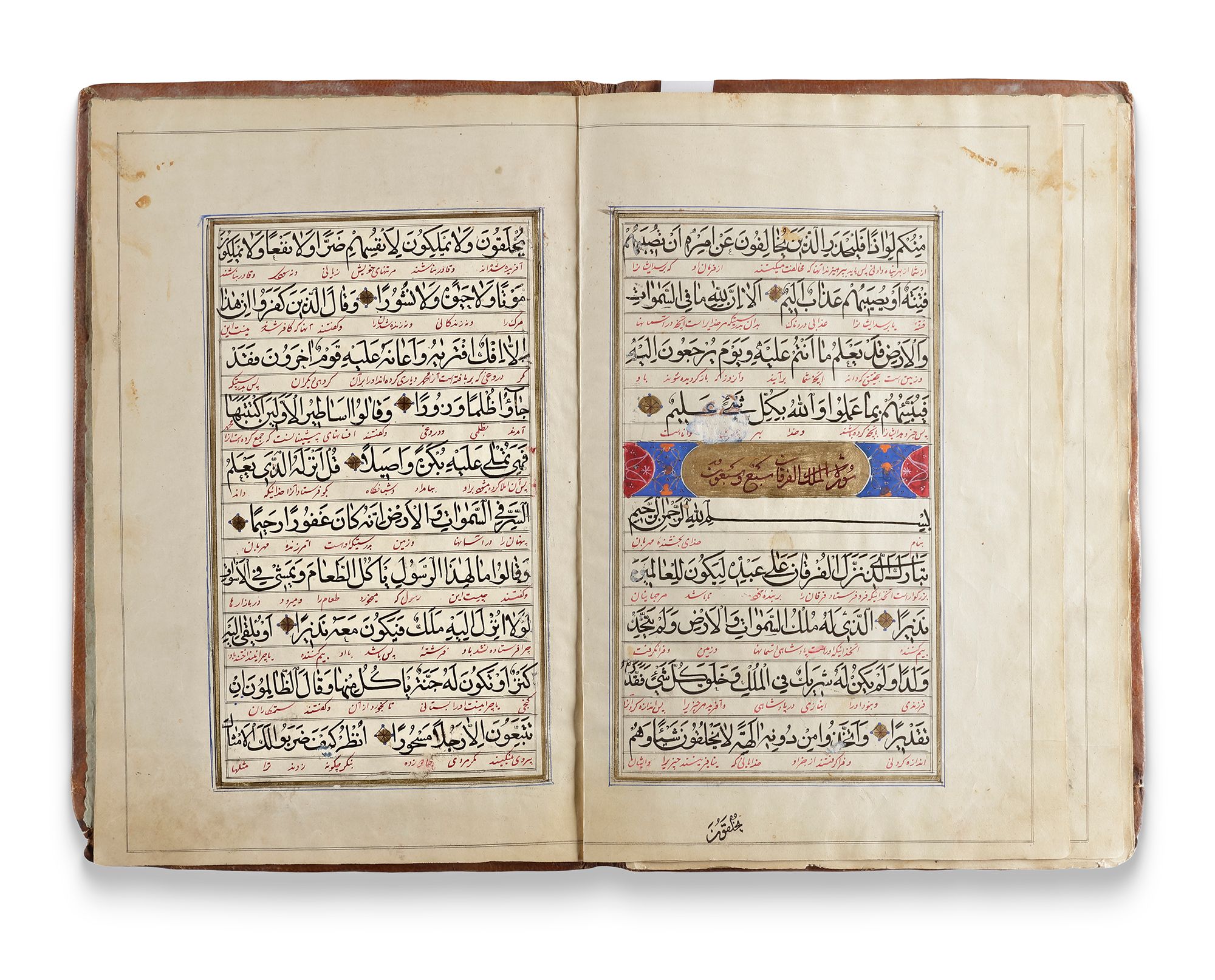 The manuscript is gilded by Ismail bin Abdullah al-Khvansari and housed in a leather binding.