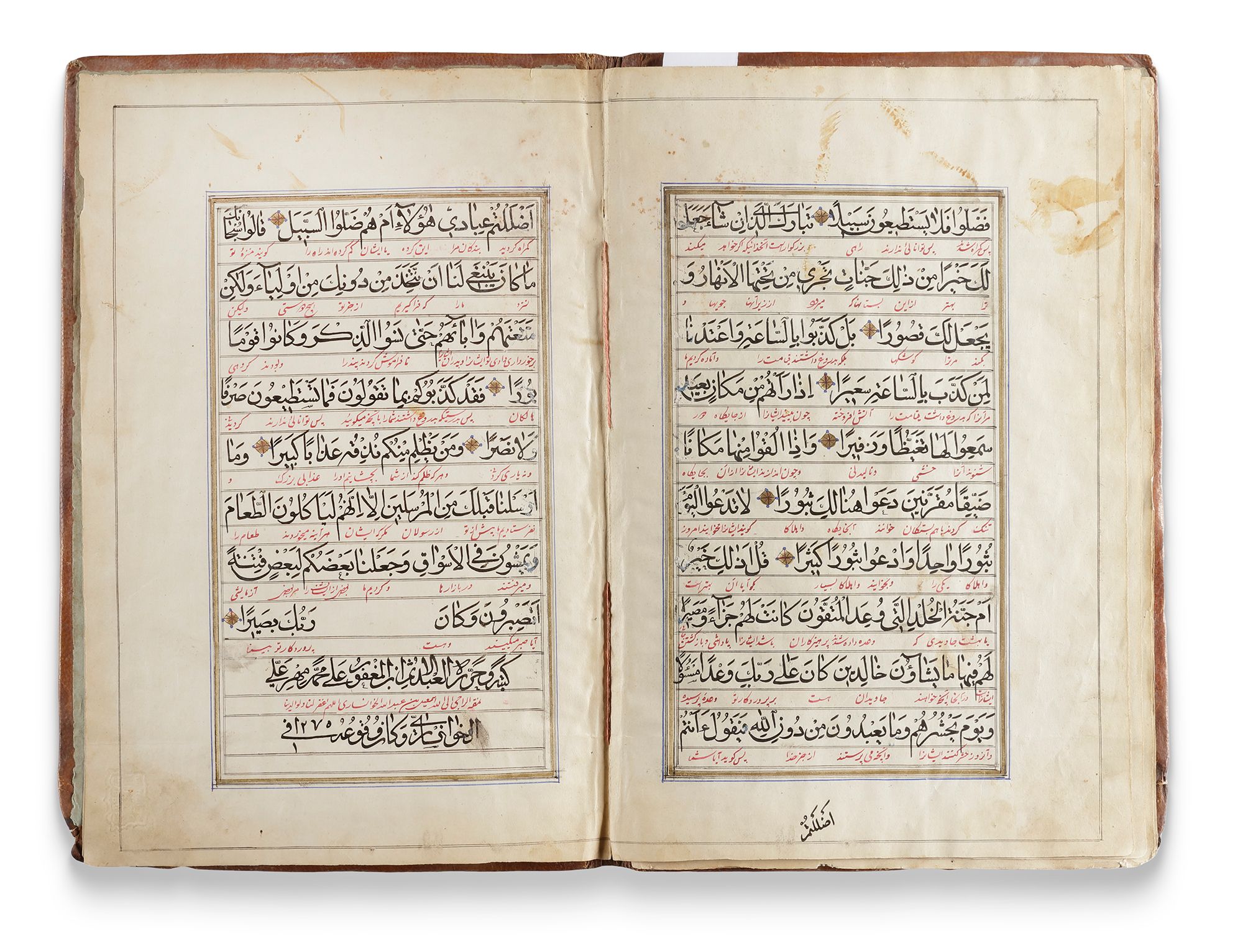 An Arabic manuscript on paper, containing a Quranic juz (section) 9ff., with 10 lines of text, written in black Naskh script. The manuscript includes an interlinear Persian translation in red ink, with gold verse markers outlined in black and pointed by blue dots. It is ruled with blue and gold borders. The opening bifolio is decorated with gilt and polychrome designs, and features marginal floral motifs indicating "Nisf Hizb."
