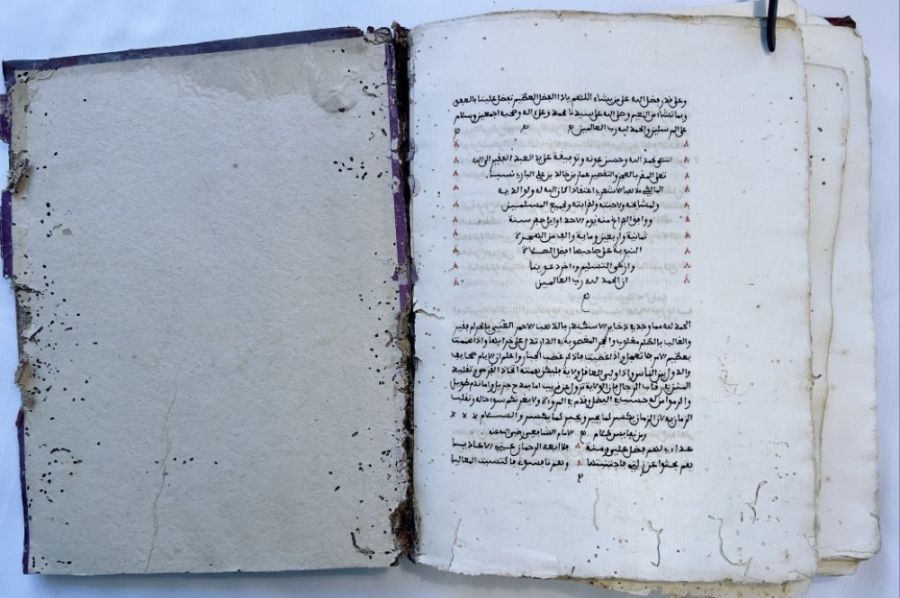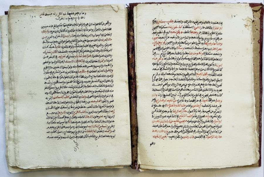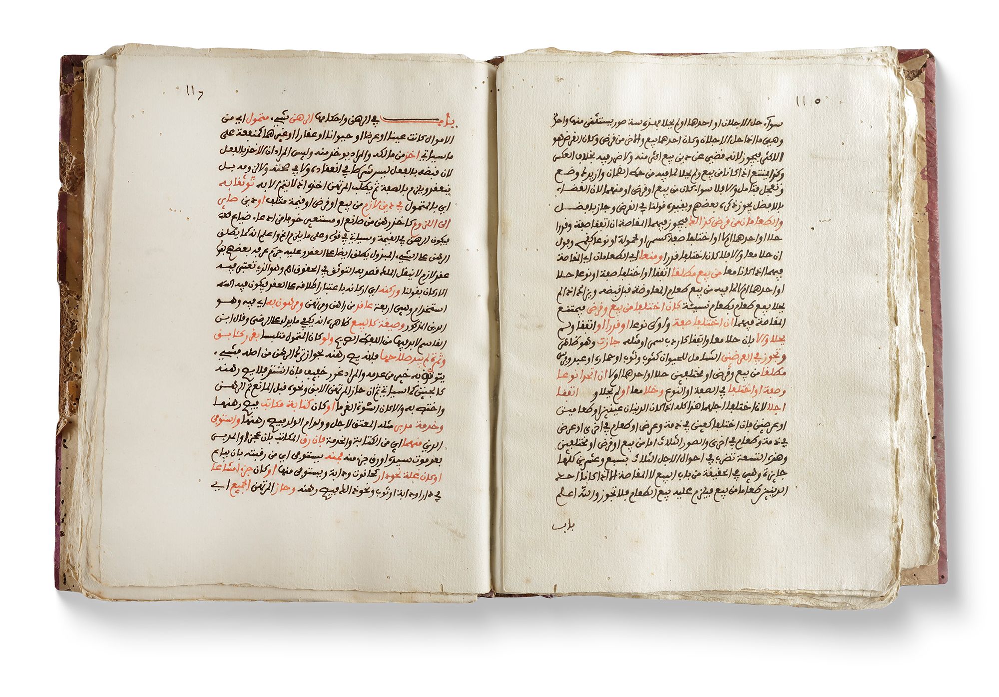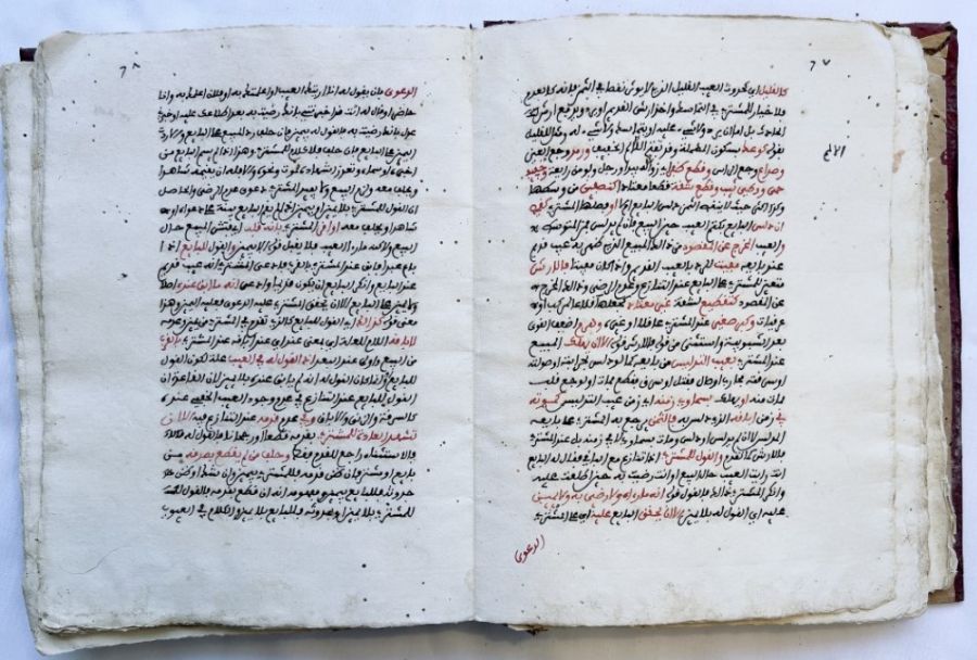 An Arabic manuscript on paper, comprising 140 folios, with 23 lines per page. The text is written in black script, with catchwords and important terms highlighted in red ink. It was written by Sheikh Ammar bin Khalid bin Ali Al-Bari in the year 1148 AH (1730 AD). The manuscript is housed in a deep red leather binding and measures 19 by 24 cm. It is an Islamic book on the jurisprudence of sales, commercial transactions, and the principles of Sharia law.