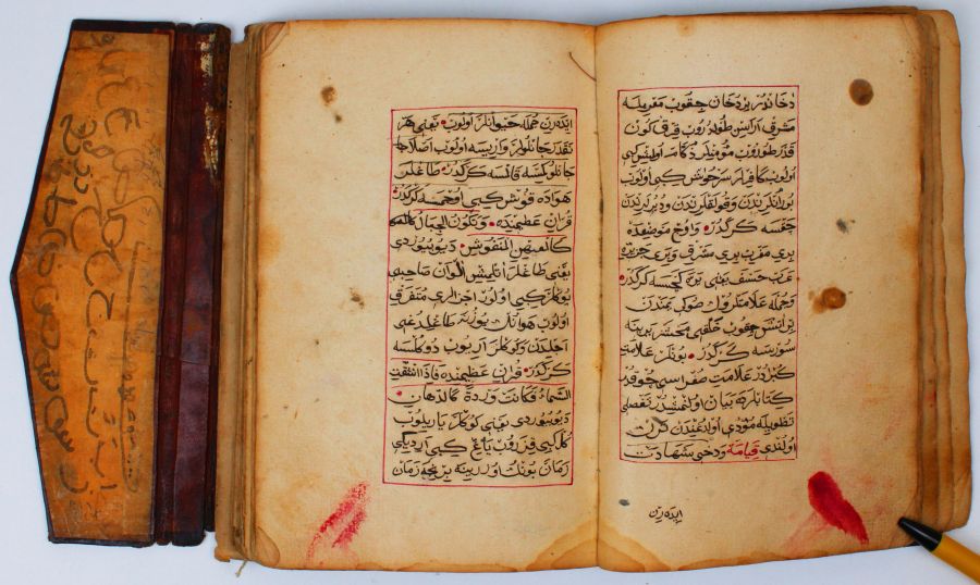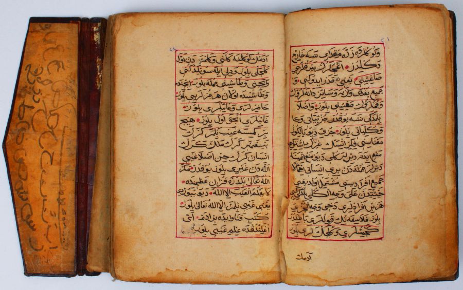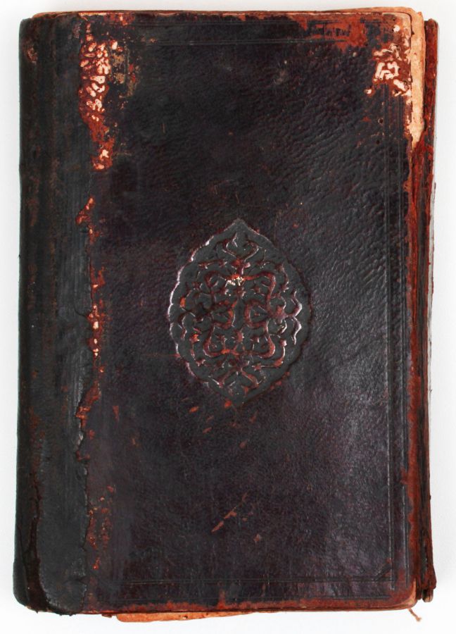 Arabic and Ottoman Turkish manuscript on paper, 200 folios. Each page contains 15 lines of text written in black script, with a red ruled border. The book is about Fiqh and Hadith concerning medicine, love, and other topics. It has its original leather binding with a flap. Written by Ali Bin Mahmoud and dated 1143 AH (1730 AD).