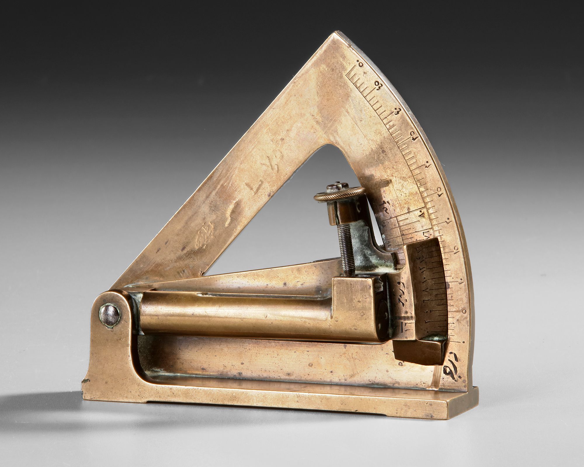 Measuring 12 by 12 cm, this well-preserved sextant remains in good condition. It consists of a circular arc meticulously graduated in degrees, complemented by a movable radial arm pivoted at its center. By measuring the angle between the horizon and celestial bodies such as the Sun, Moon, or stars, it served as a vital tool for determining latitude and longitude during celestial navigation.