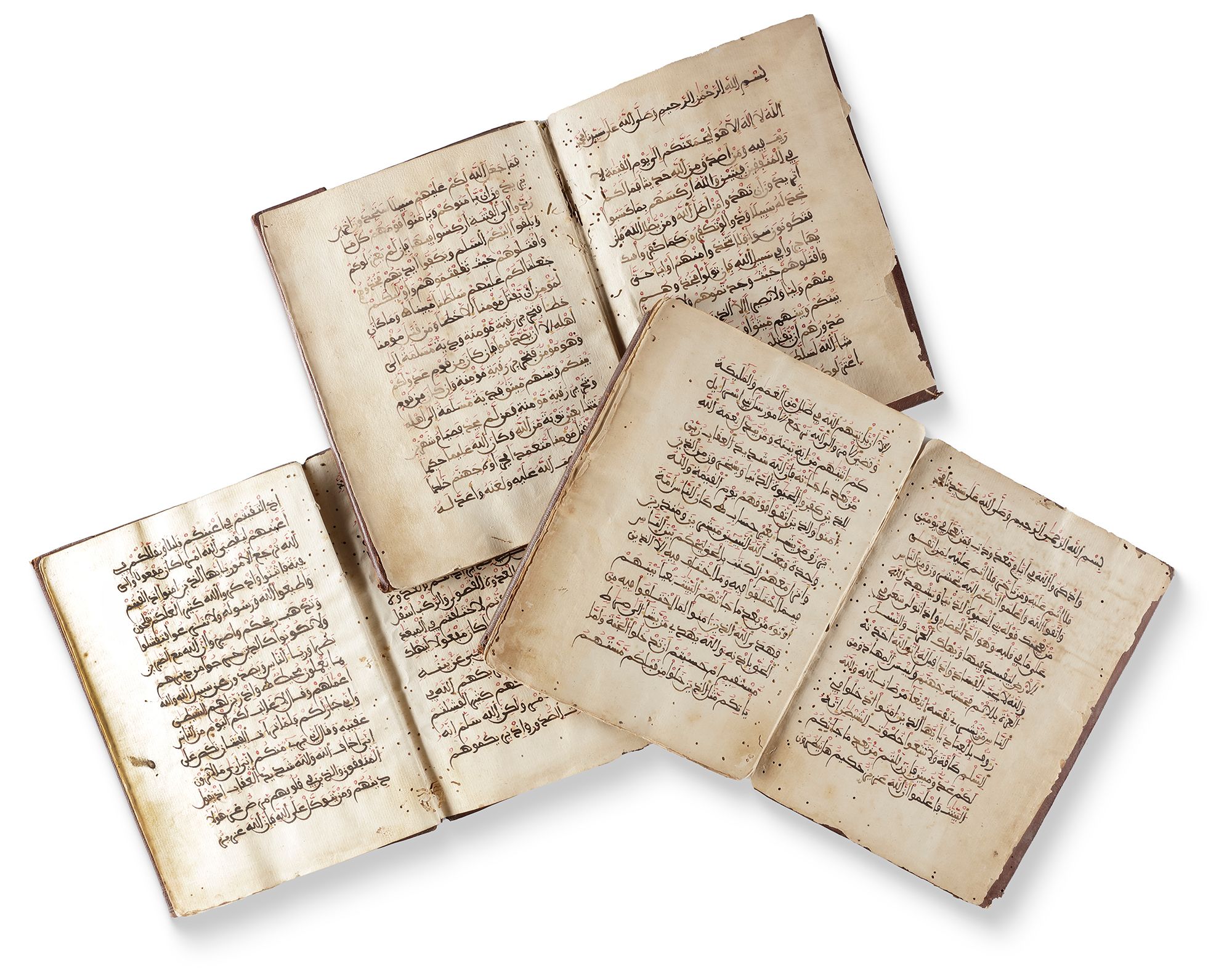 Arabic manuscript on paper, each section with 17 leaves, each page with 15 lines written in black maghribi script, tajwid in red ink, a cluster of three roundels as verse markers.