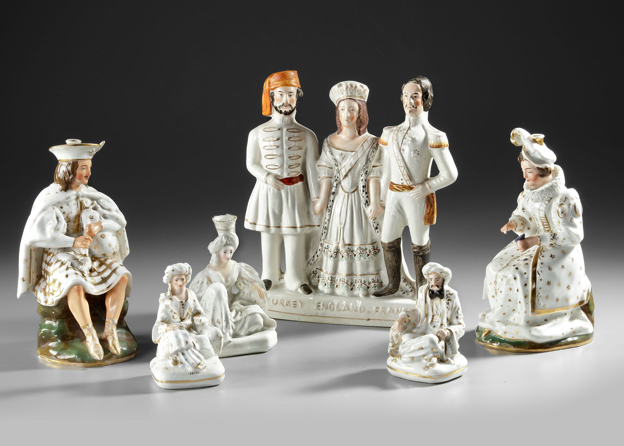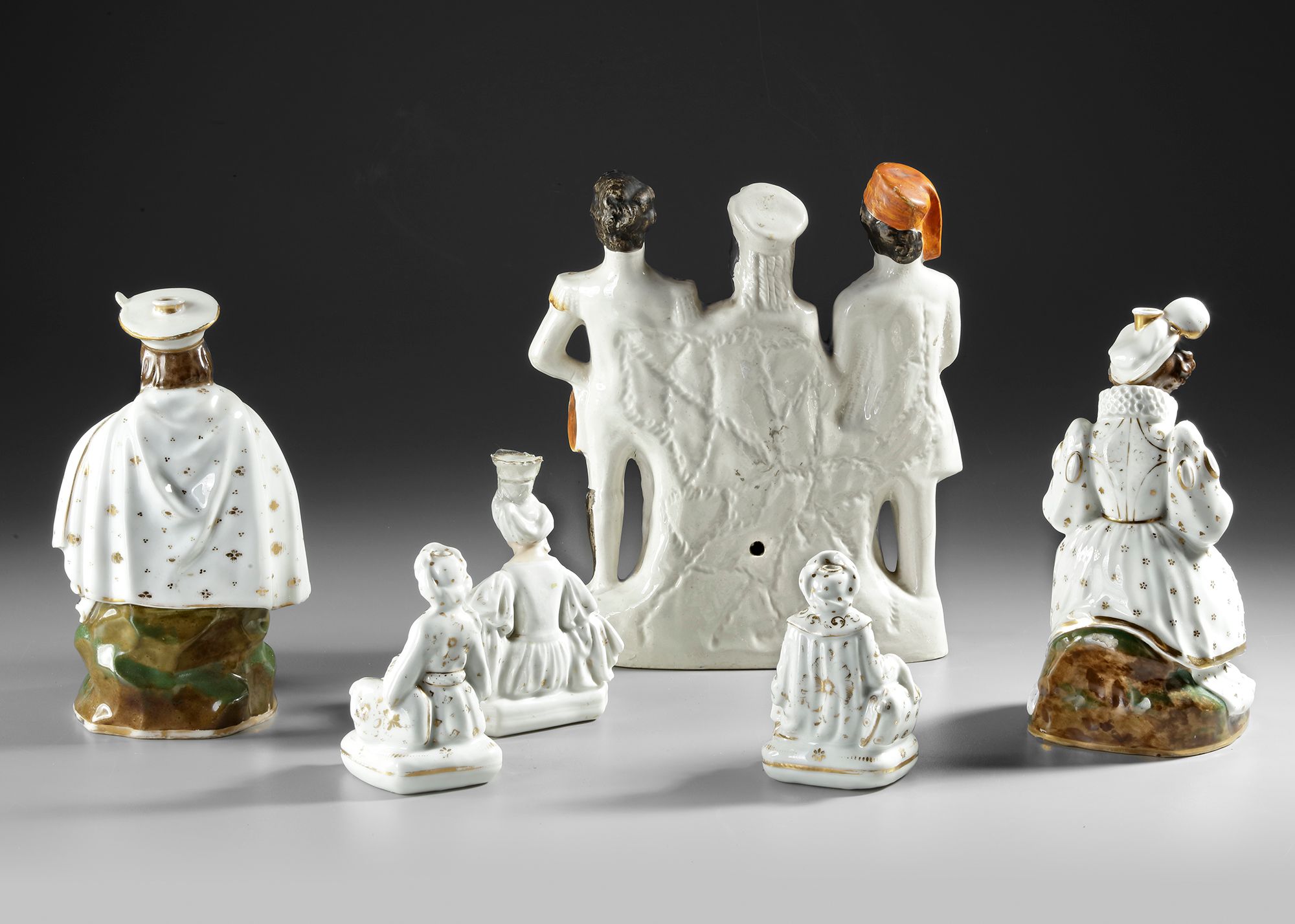 A set of five 19th century porcelain sultan and sultana’s. They are all characteristically white with gold embellishments. The three larger pieces have the stamp of Jacob Petit on the bottom.