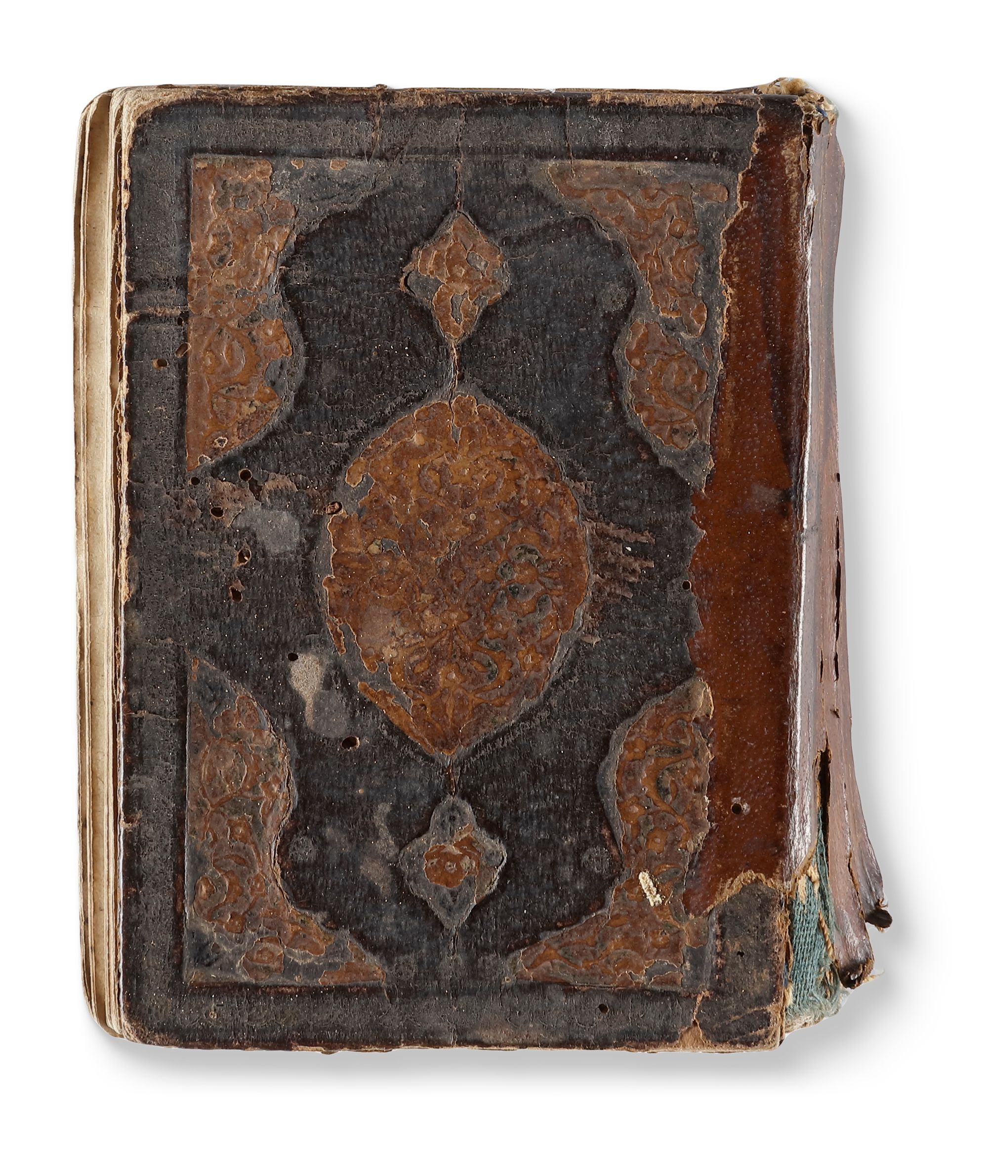 It is in the original leather binding. Dimensions: 7 by 10 cm.