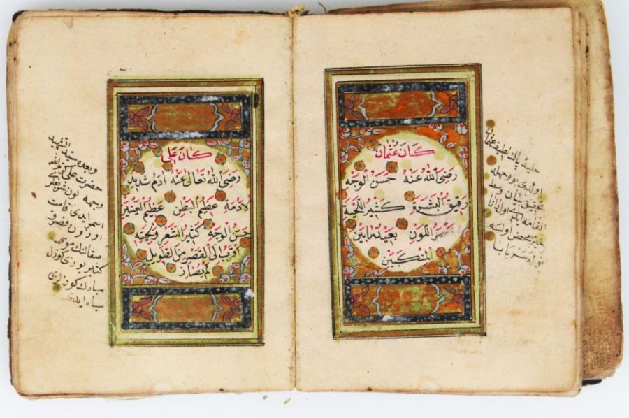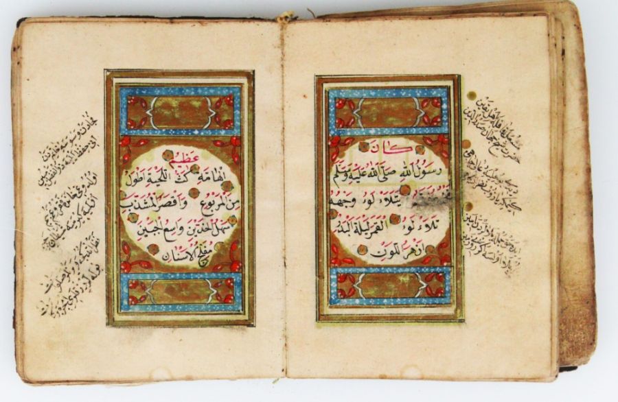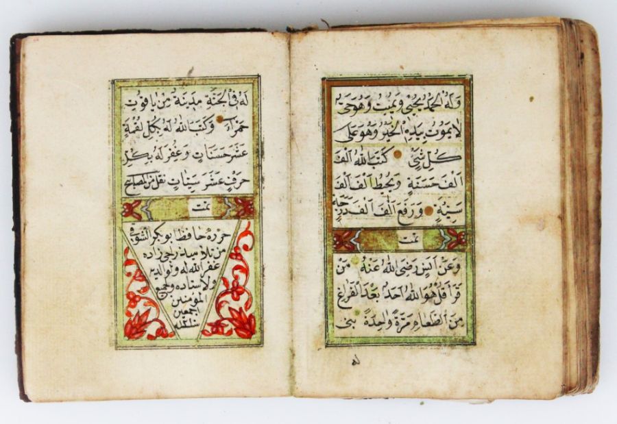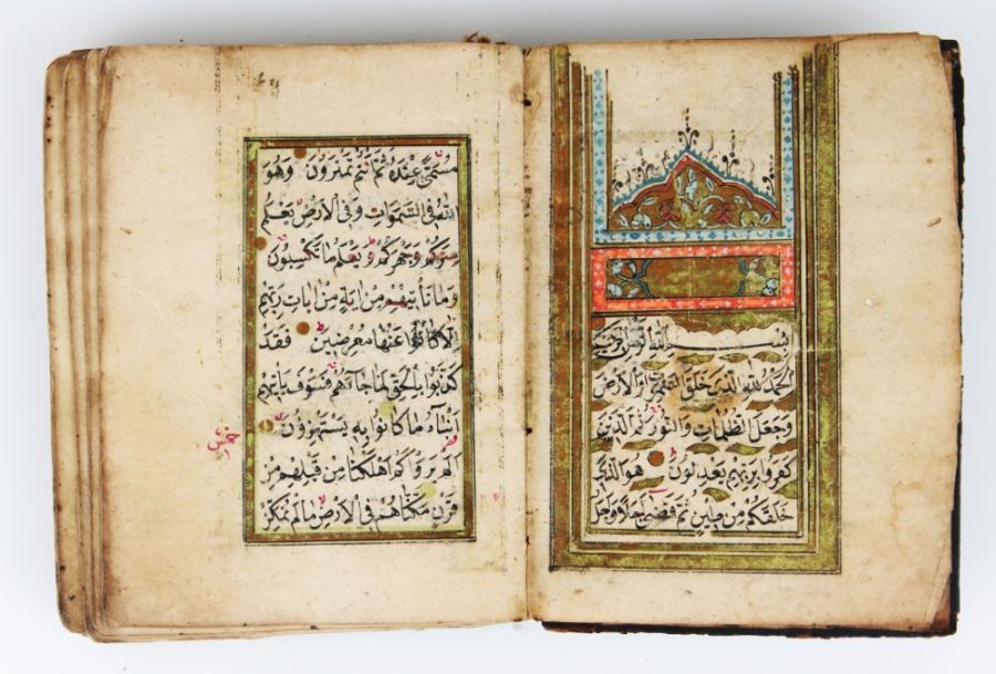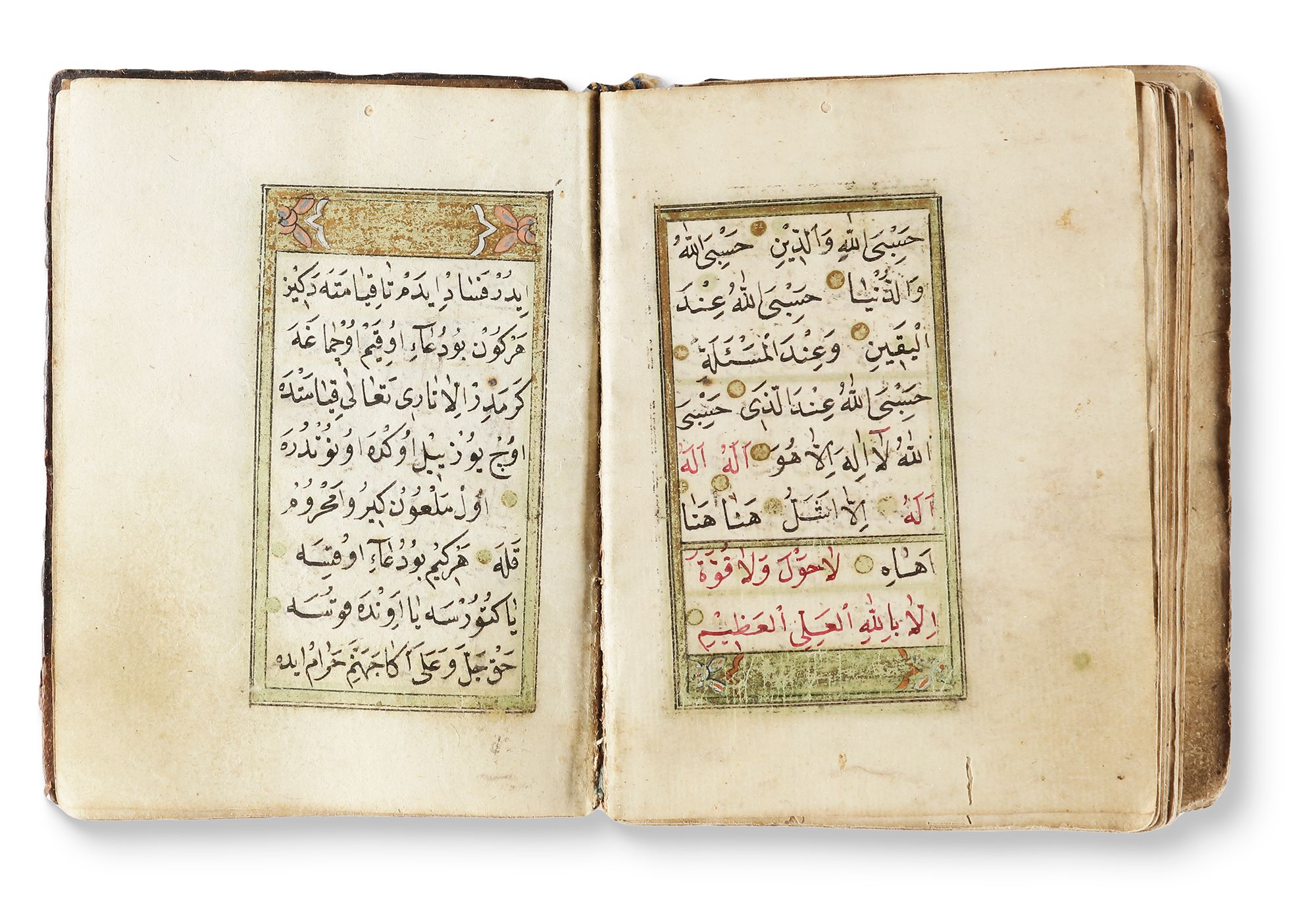 An Arabic and Ottoman Turkish manuscript on paper, 240 pages, each page with 9 lines, written in black Naskh script. It features gold verse roundel markers and is ruled with black and gold borders. The opening bifolio has gold and polychrome decoration framing 5 lines, reserved in clouds against a gold ground.