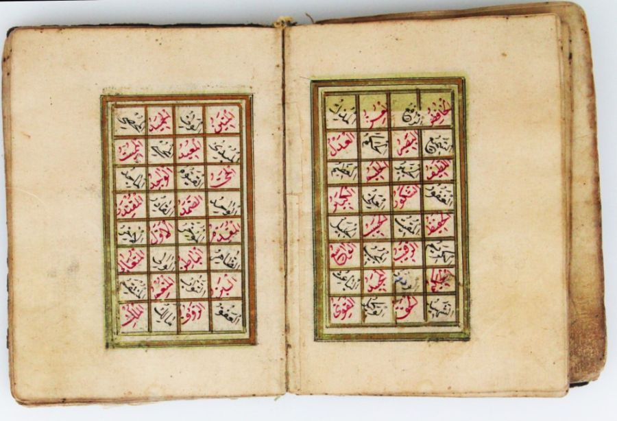 The book begins with several surahs, such as Al-An’am, Yasin, Surat Al-Naba’, along with various prayers and du'as, and tables listing the Beautiful Names of Allah, the Hilya of the Prophet, and the Four Caliphs.