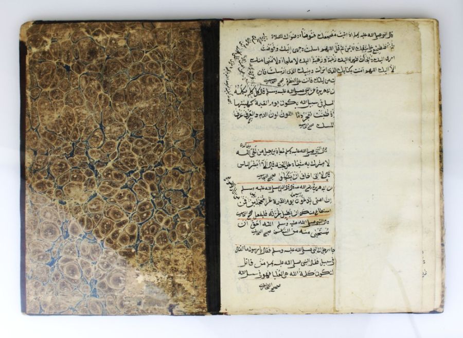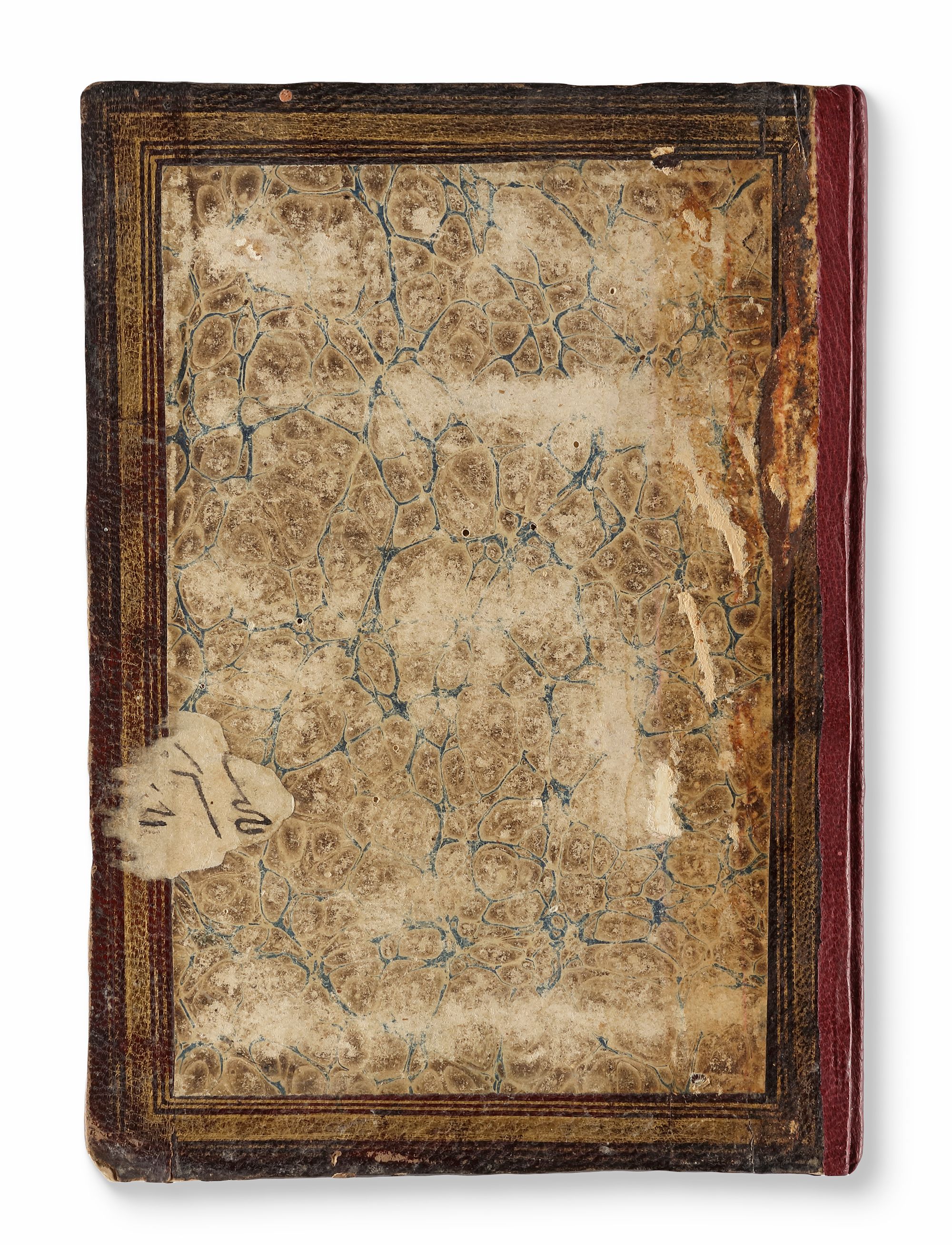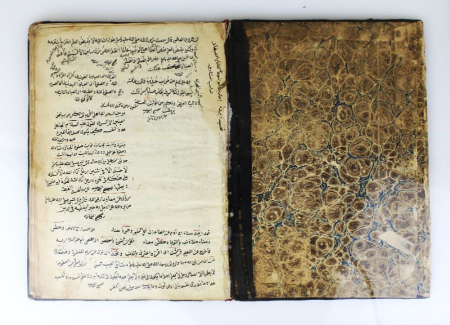 The manuscript is bound in leather and covered with marbling. Its dimensions are 15 x 21 cm.