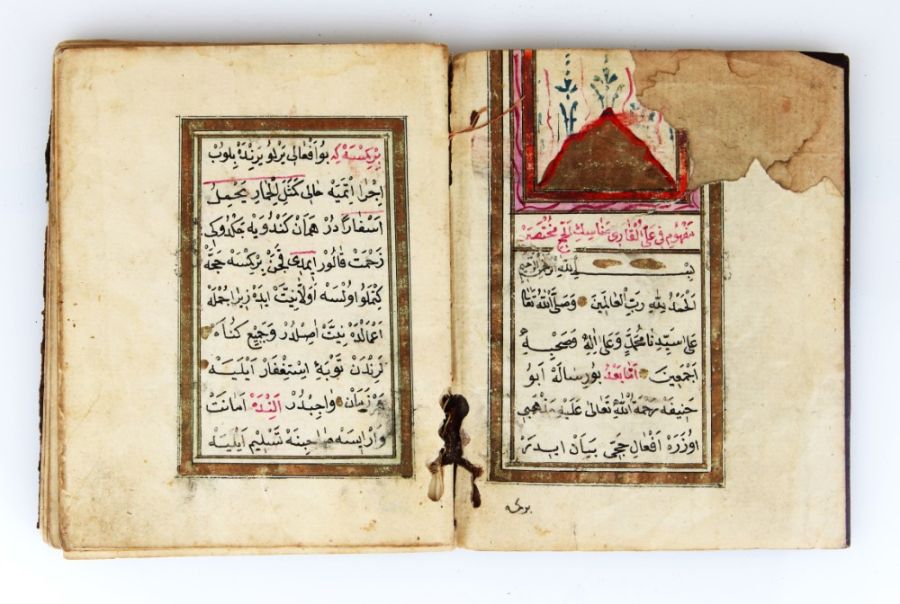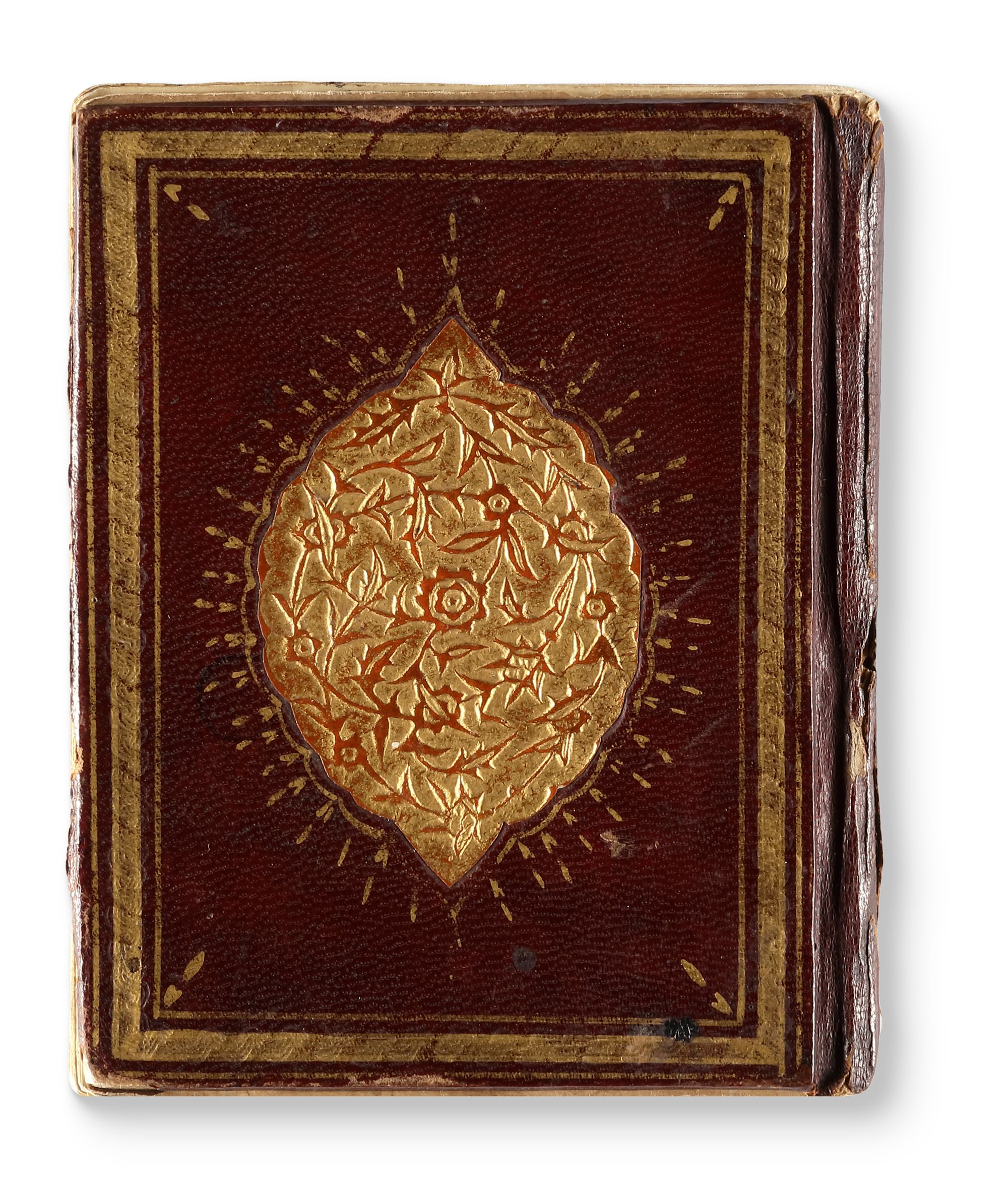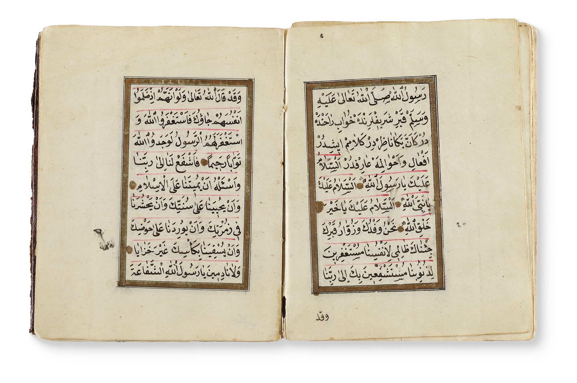 An Arabic and Ottoman Turkish manuscript on paper, consisting of 40 folios, with each page featuring 9 lines of text. The text is written in black Naskh script, with titles in red ink. Gold roundels are used as markers, and the manuscript is ruled with gold borders. The opening bifolio is adorned with gold and polychrome decoration. The last page is signed: "Written by Sheikh Al-Jalil Muhammad Amin Al-Rafaqi, student of Sheikh Ahmed Al-Kashif Hawaja, in 1208 AH/1792 AD." The manuscript is housed in its original leather binding and measures 8 by 10 cm.