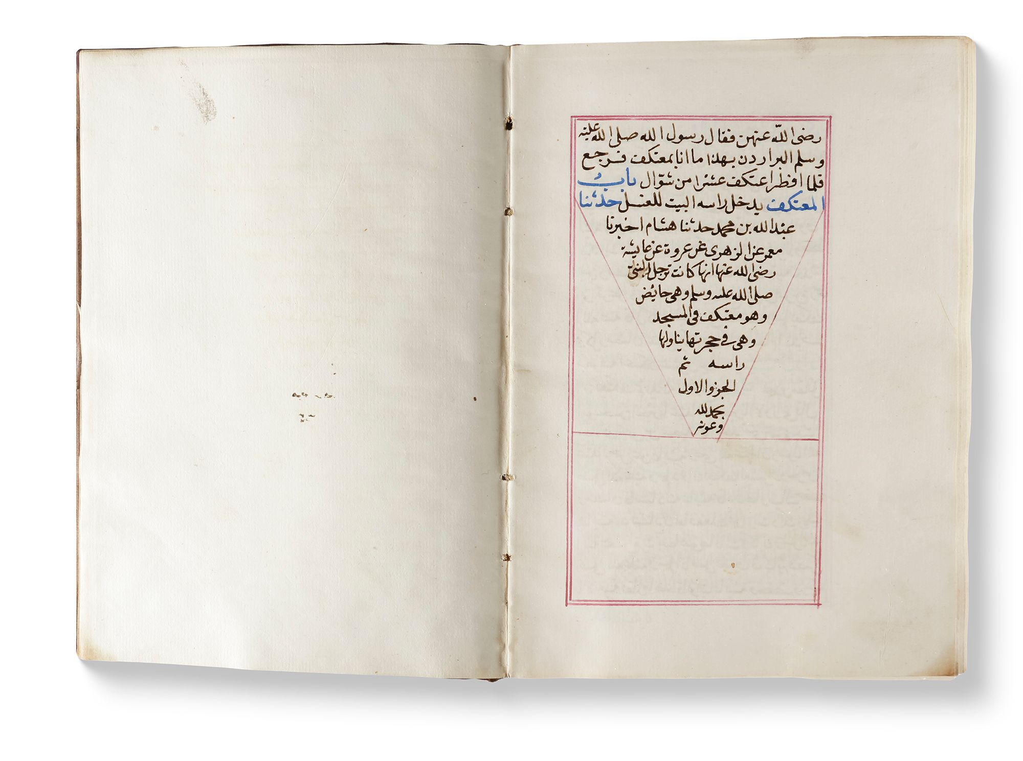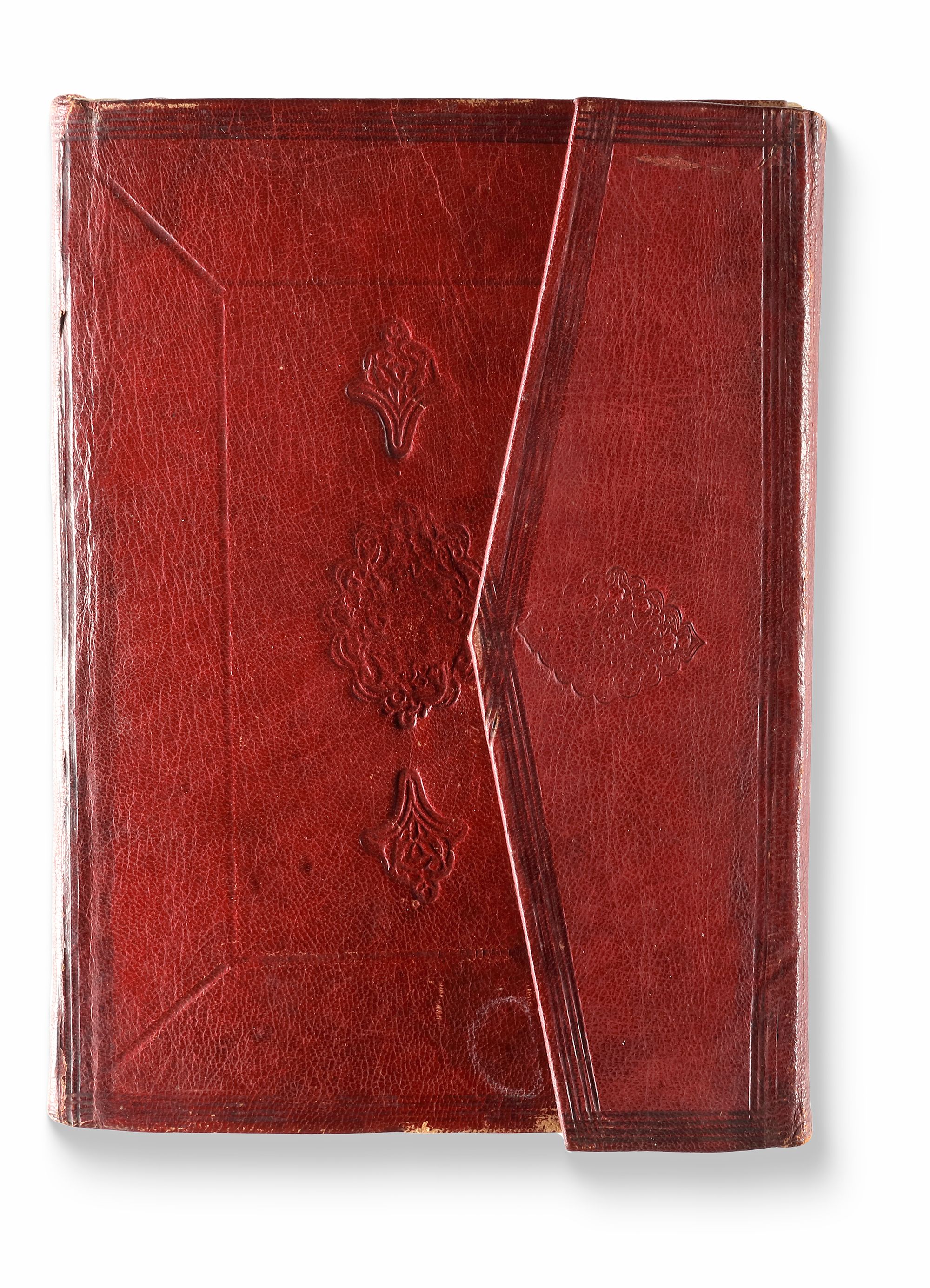 The manuscript is bound in deep red Moroccan leather with a flap, and is housed in a protective leather case adorned with marbled exterior decoration.