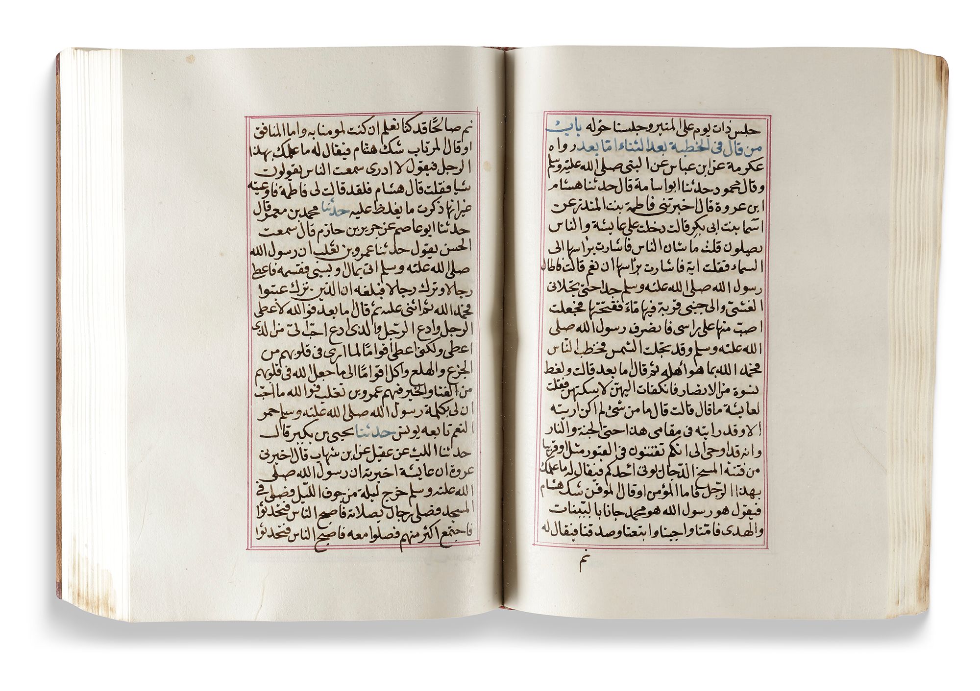 This Arabic manuscript on paper consists of 75 folios. Each page features 21 lines of text written in black Naskh script, with catchwords and titles in blue ink, all framed within double red borders. It represents the first part of Sahih al-Bukhari, from a five-part series composed over a period of 16 years. Occasional marginal notes are also included.