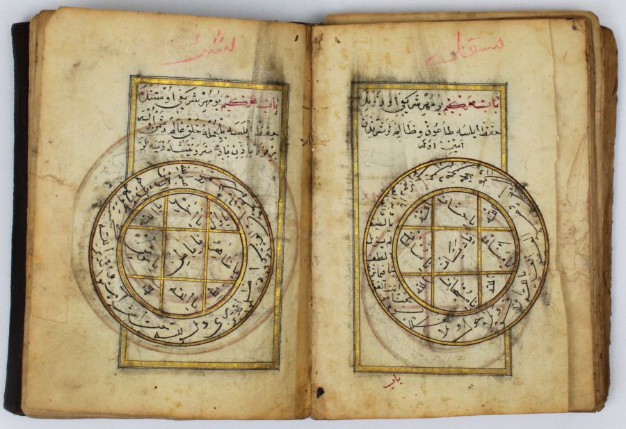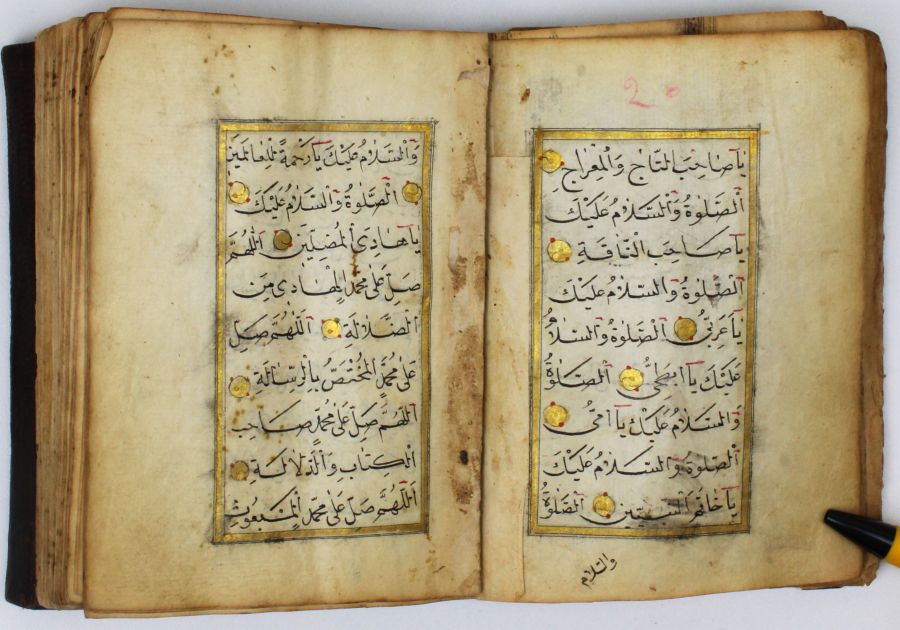 An Arabic manuscript on paper depicting prayers in honor of the Prophet Muhammad. It consists of 120 leaves with 3 fly-folios, each folio containing 9 lines written in elegant black Naskh script. The manuscript features gold verse markers outlined in black, with red dots pointing to specific words. Some words are highlighted in red, and the text is framed within gold and black rules.