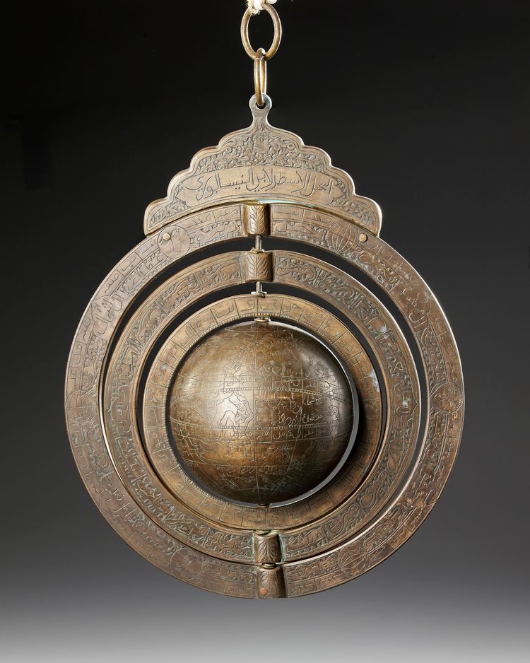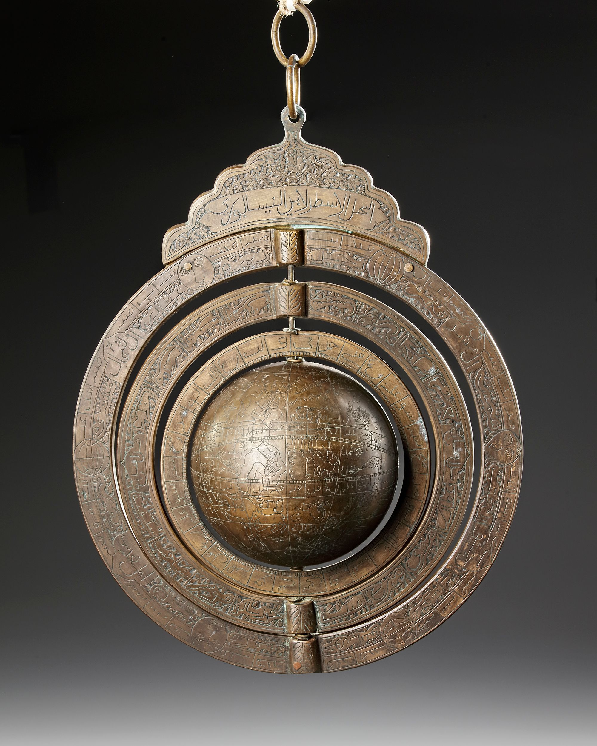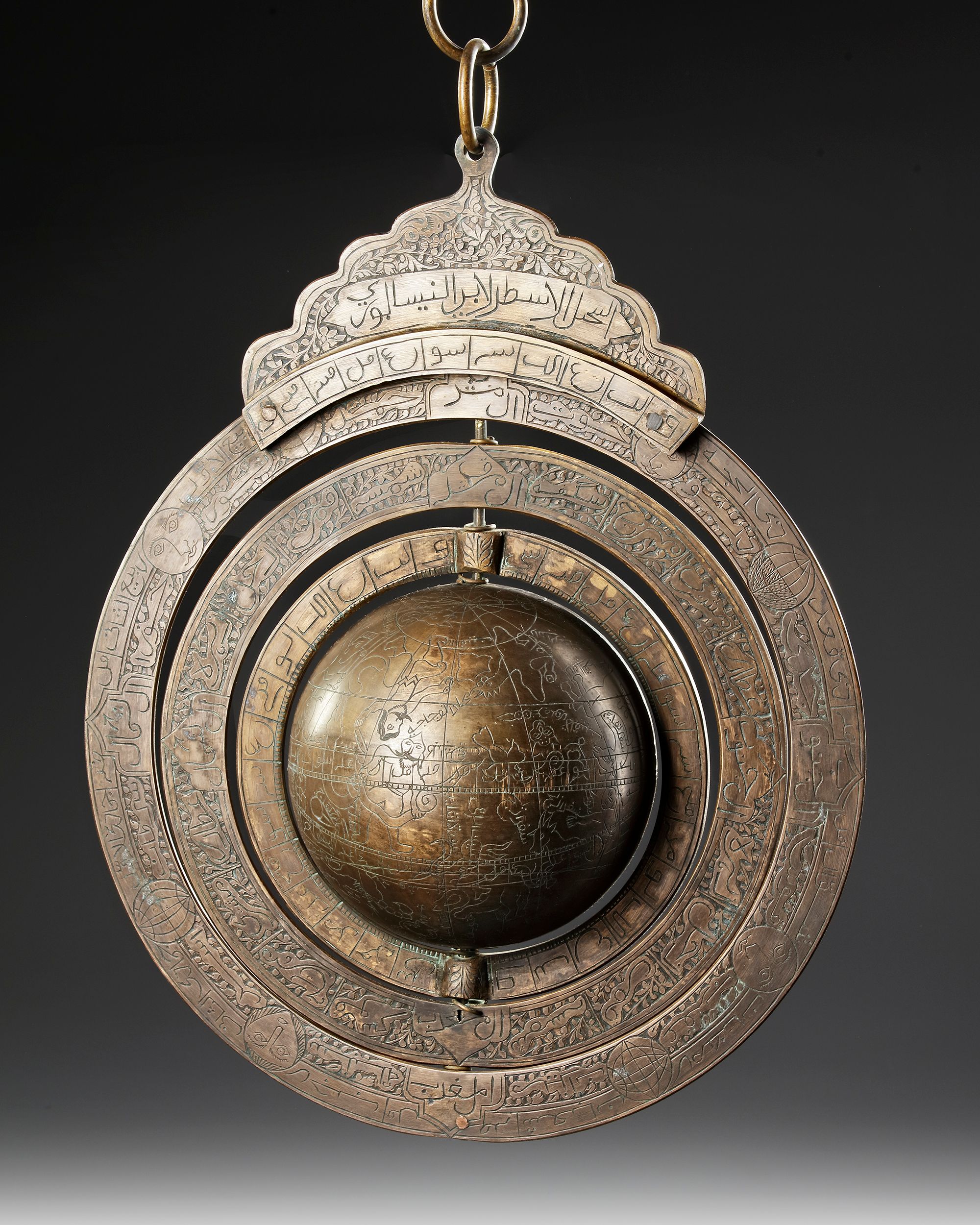A finely crafted armillary sphere composed of a spherical framework with three interlocking rings, centered on either the Earth or the Sun. The rings represent lines of celestial longitude and latitude, along with other astronomically significant features. Astrological signs adorn the second ring, while the planets are depicted on the third. Height: 52 cm Diameter of central sphere: 15.5 cm Condition: Very good