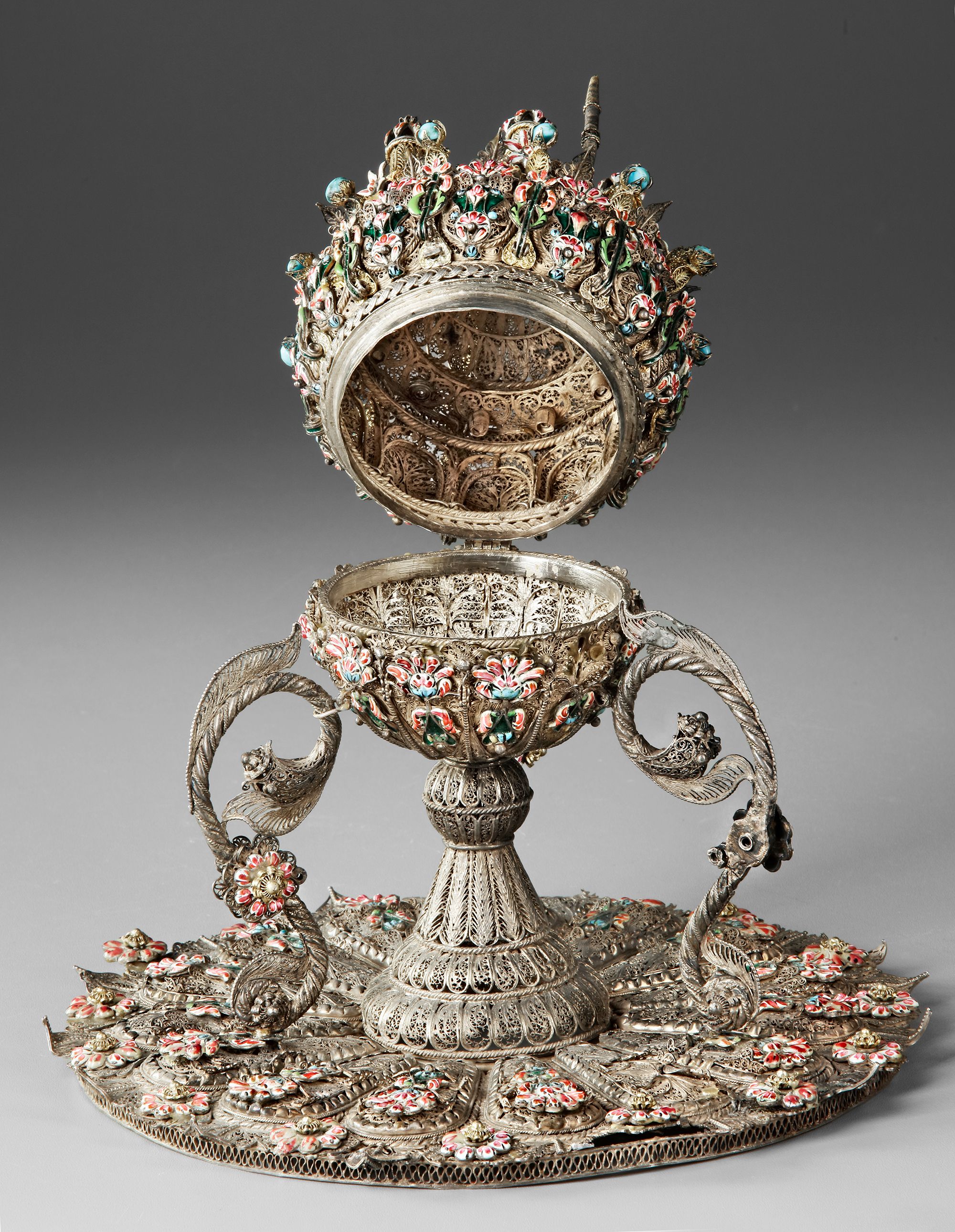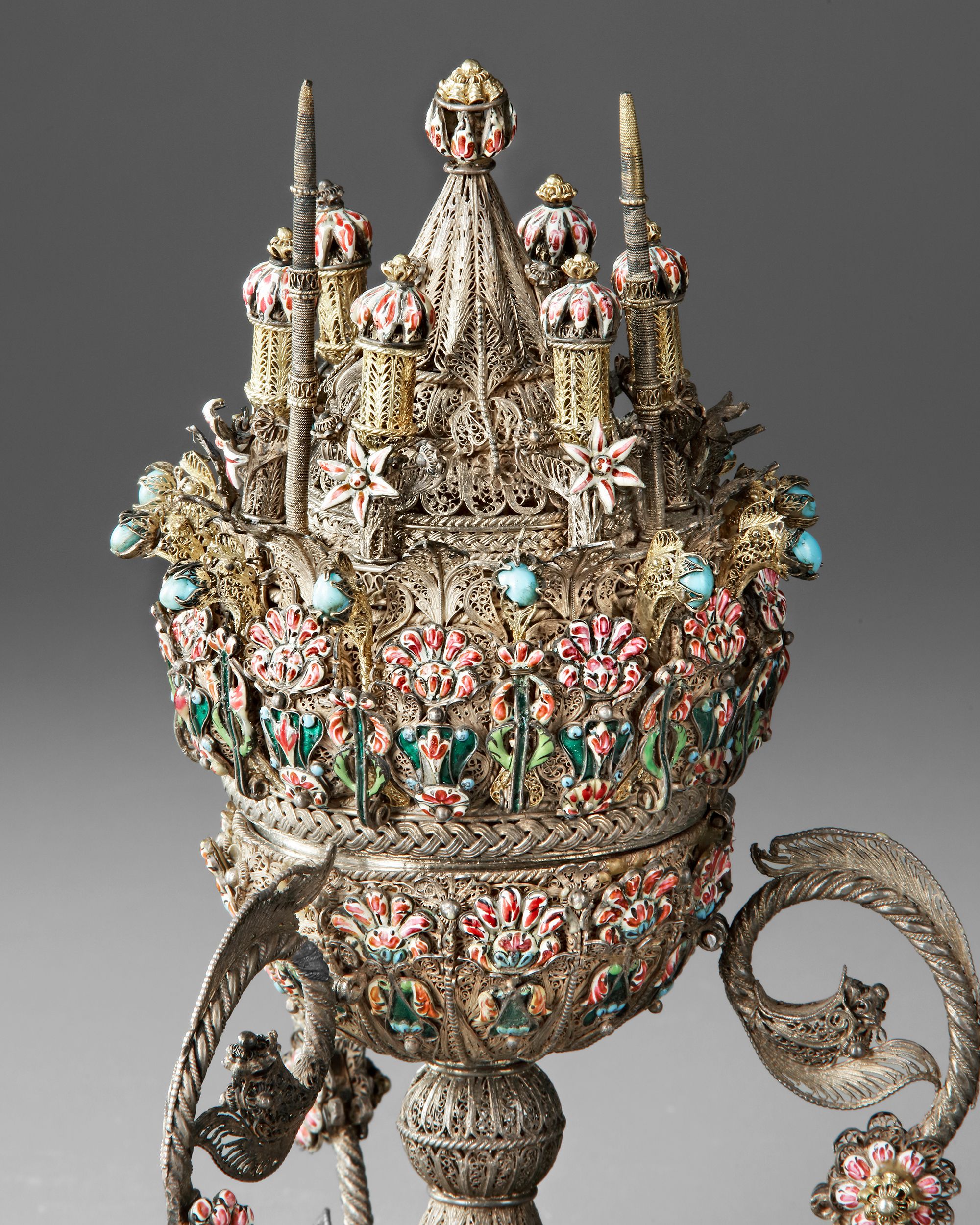 A fine enameled silver filigree censer, of spherical shape resting on a splayed foot with a cover imitating the form of Sultan Ahmed mosque featuring seven domes and two minarets, supported by three sinuous, slanted, S-shaped legs with twisted-rope design, resting on a rounded saucer stylized with silver filigree petals and inset with enameled flower heads, the exterior embellished with polychrome-enameled flower heads, mostly rosettes and carnations, painted in the tones of green, turquoise, white and pink, the filigree work mostly presenting conventional scrollwork and spiral designs.