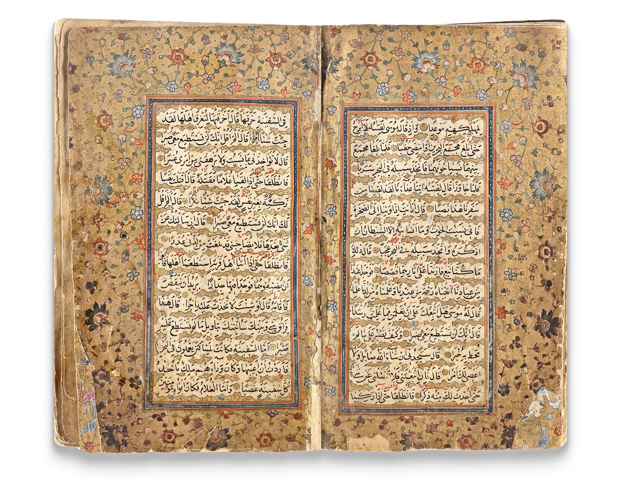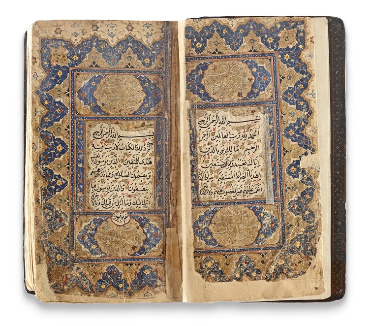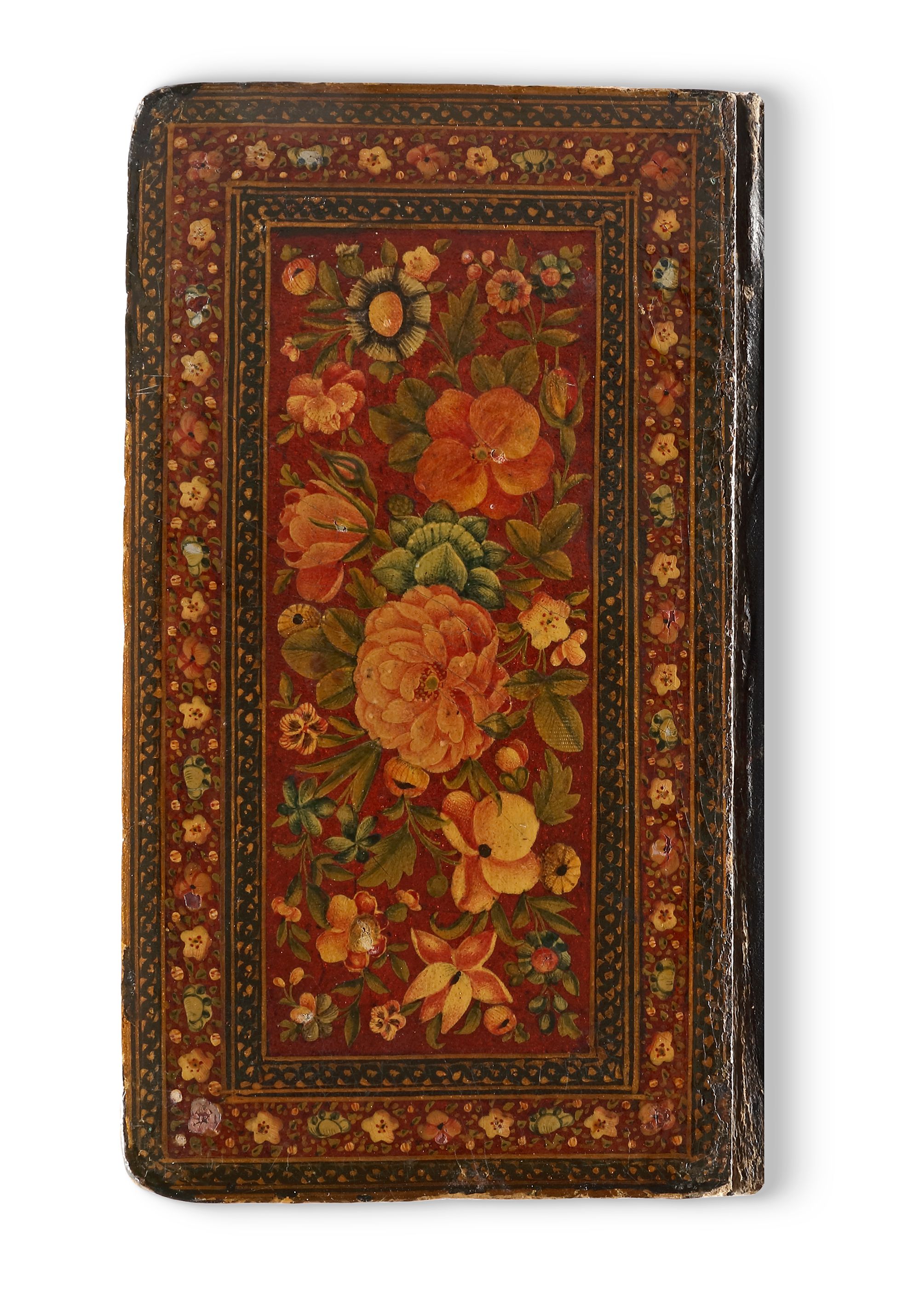 In a Qajar lacquer binding decorated with intricate floral motifs.